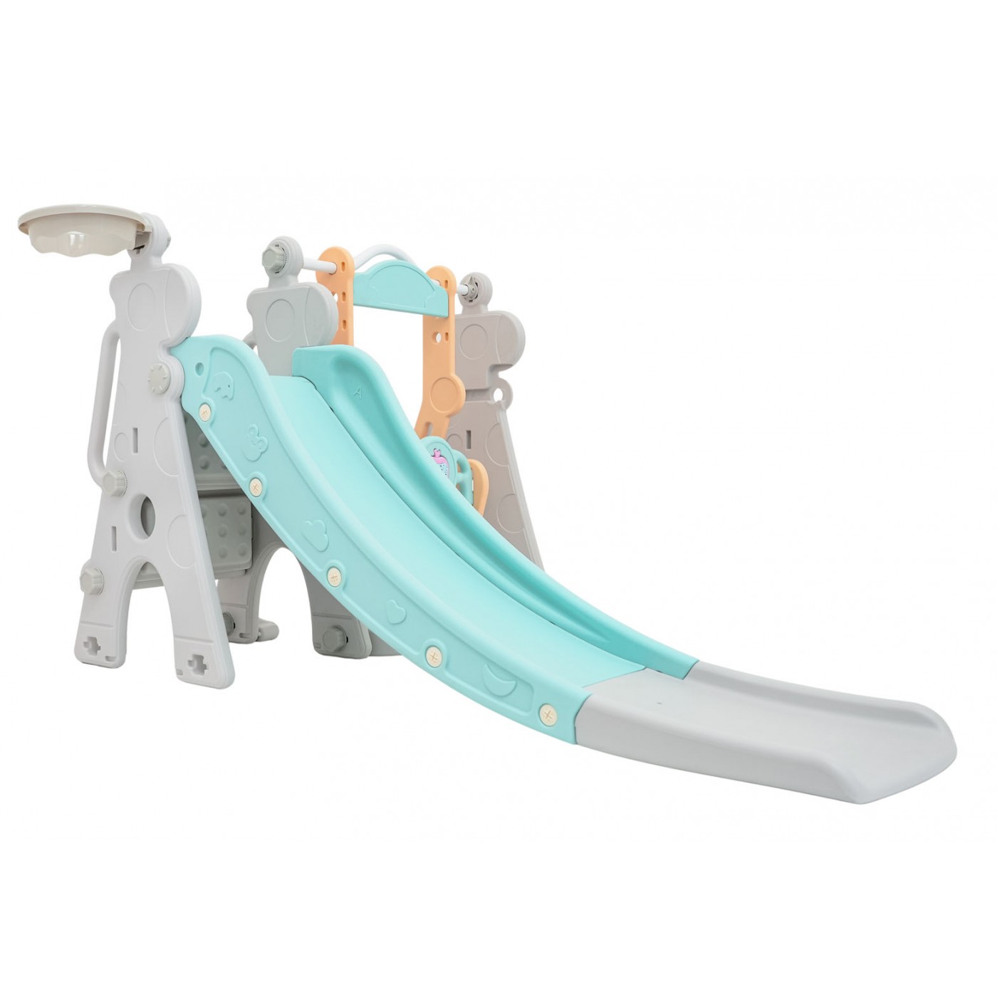 3in1 set, slide, swing, basketball for children from 1 year of age. All elements of the set are made of high quality HDPE material, which is a more flexible and resistant to mechanical damage compared to materials used in other such structures. Large components facilitate assembly. The set is ideal for outdoor or indoor use. Features: - for children from 1 year of age, - wide, stable swing, - seat with removable protection, - rigid swing arches that improve stability during play, - a wide platform strengthening the structure, - high swing backrest, - long slide made of double plastic, - wide, safe slide steps, - basketball hoop, - rubber ball included in the set, - construction of a swing that allows for changing the structure layout, - removable apple with sound elements: animal sounds and their names, melodies, songs, voice commands in English, and the ability to change the apple's backlight: blue, red, green, flashing lights, - maximum load of the set 100 kg. |