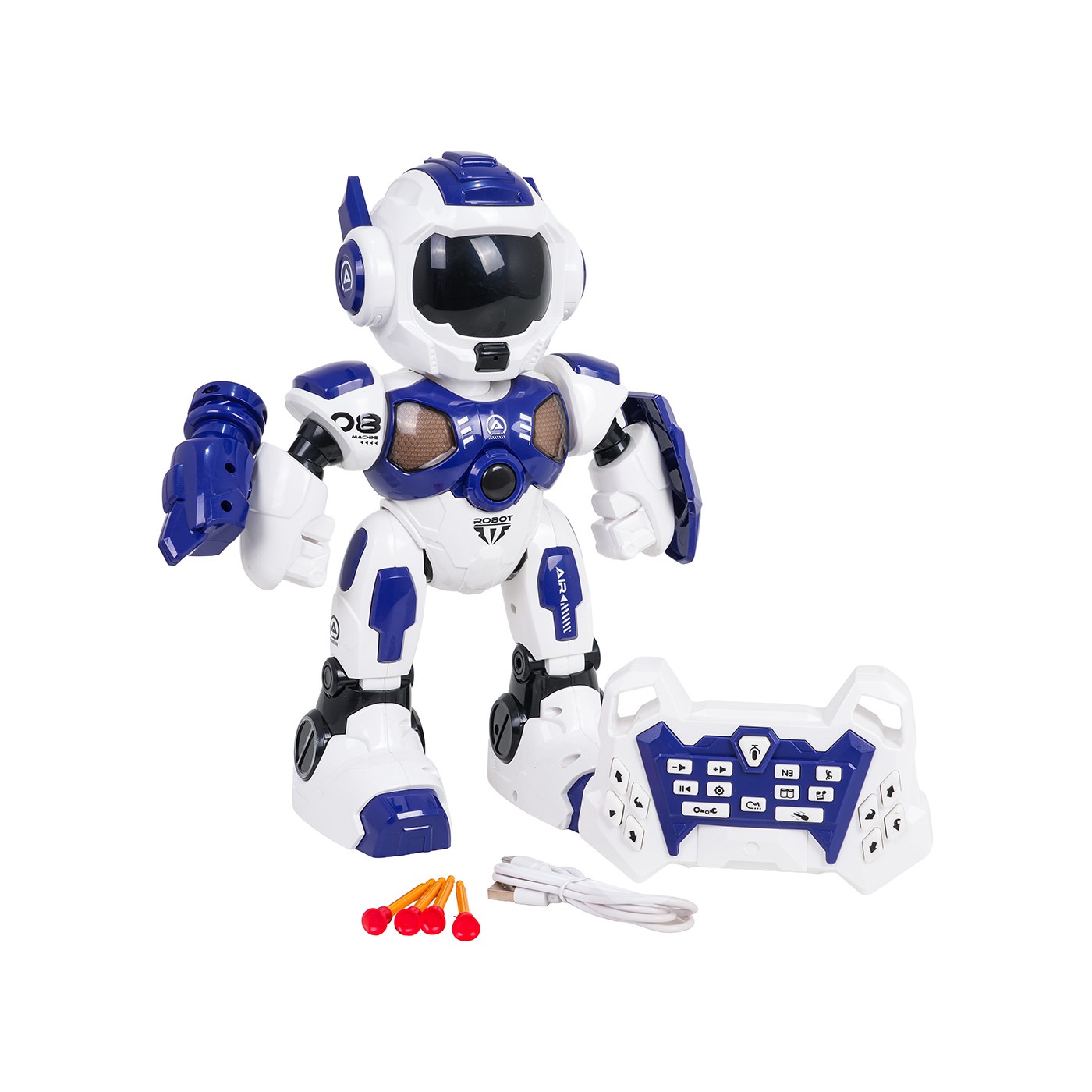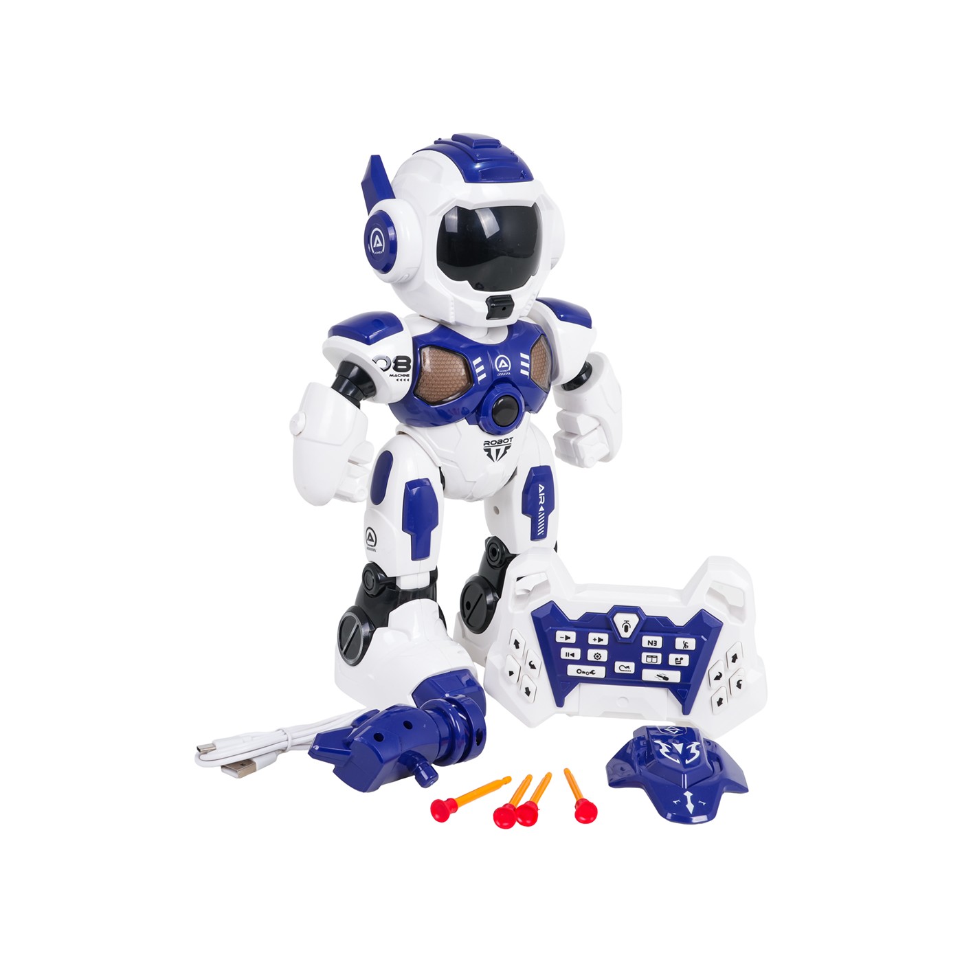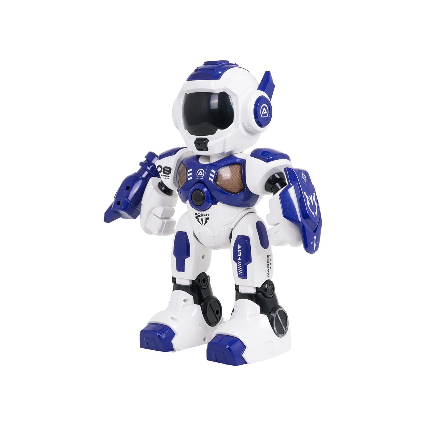 The interactive, multi-functional A08 robot with a shooting function is suitable for children aged eight and up. The robot is made of high-quality plastic, has light-up eyes and a button on its belly, moves forward and backward, turns left and right, moves its arms, dances, and plays melodies and stories. The set includes additional arm attachments: a shield and a suction-cup dart launcher. Manual firing is possible by pressing a button. The robot is powered by a 3.7V rechargeable battery (included), and the remote control uses 2 x AA 1.5V batteries (not included).