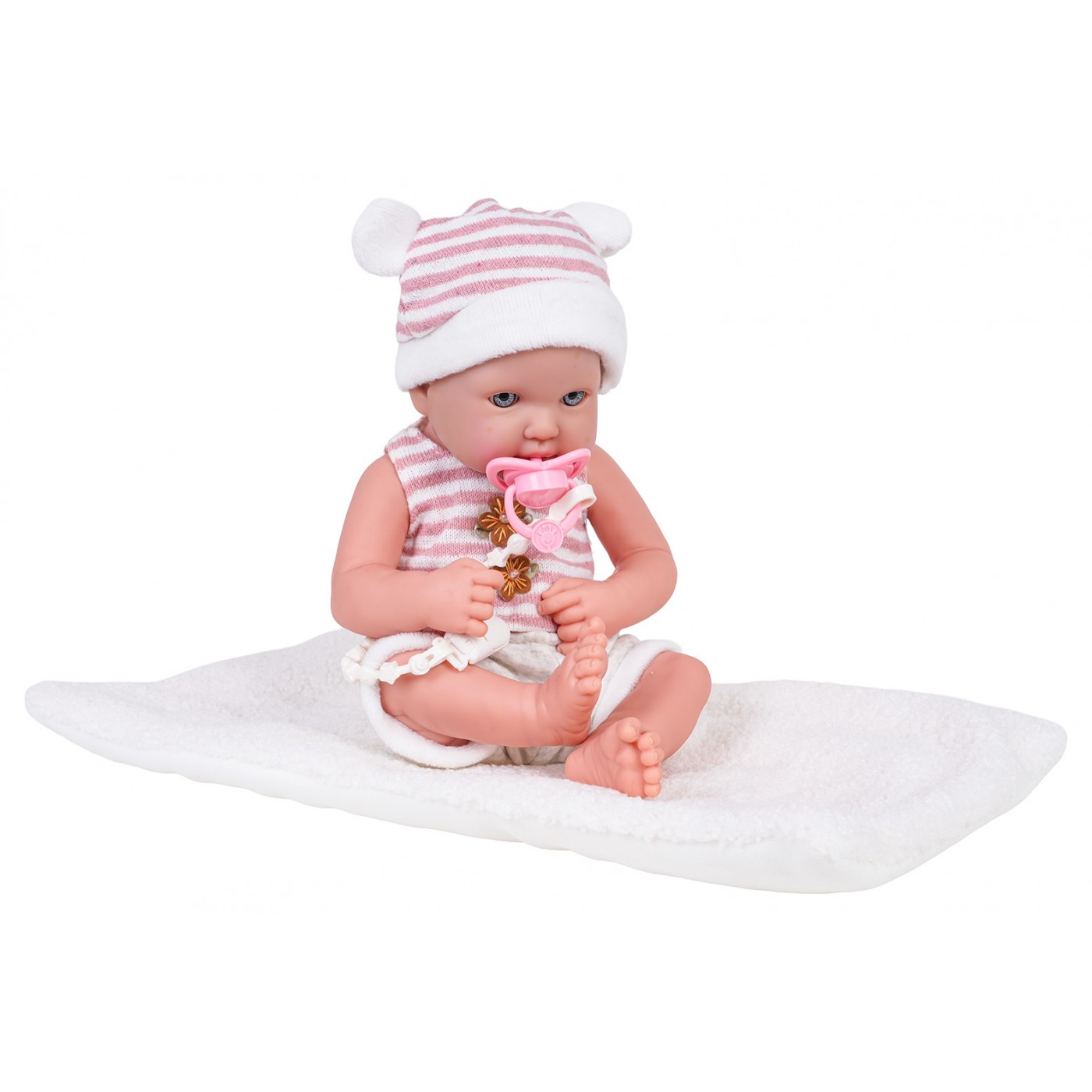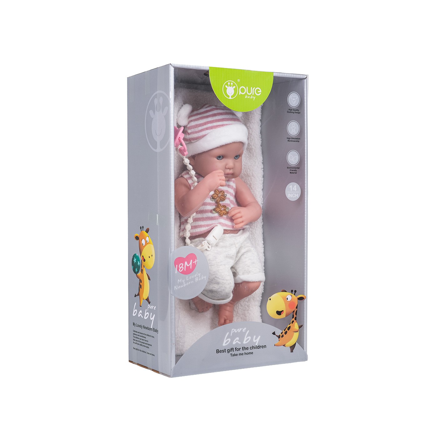 A beautiful, realistically crafted baby doll with accessories for children aged three and up. The doll is dressed in a hat, T-shirt, and shorts. She has movable arms and legs and is very soft to the touch. A pacifier on a string and a soft blanket are included. The doll looks incredibly realistic, just like a real little baby. Features: - for children from three years of age, - realistic appearance, - accessories included, - perfect gift set. |