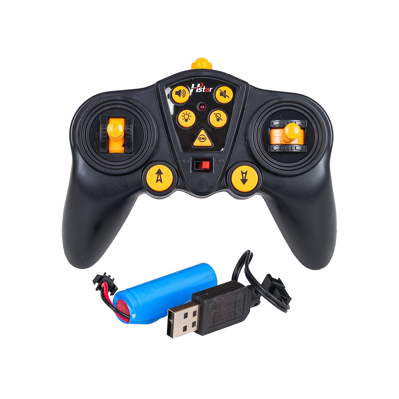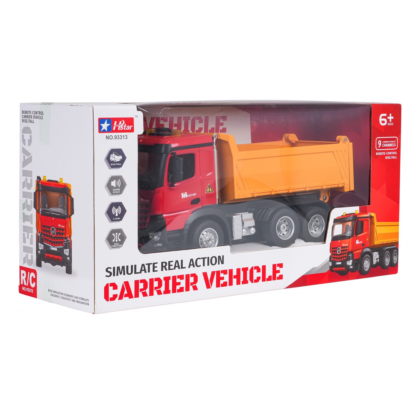 A remote-controlled dump truck for children aged six and up. The vehicle has rubber tires that grip the ground well, and there are lights on the truck's roof and front. The vehicle is controlled by a remote control, driving forward, backward, and turning left and right. The remote control also allows you to turn on and off the lights and sounds, as well as raise and lower the trailer. The toy is powered by a 3.7V rechargeable battery (included), while the remote control uses 2 x AA 1.5V batteries (not included).