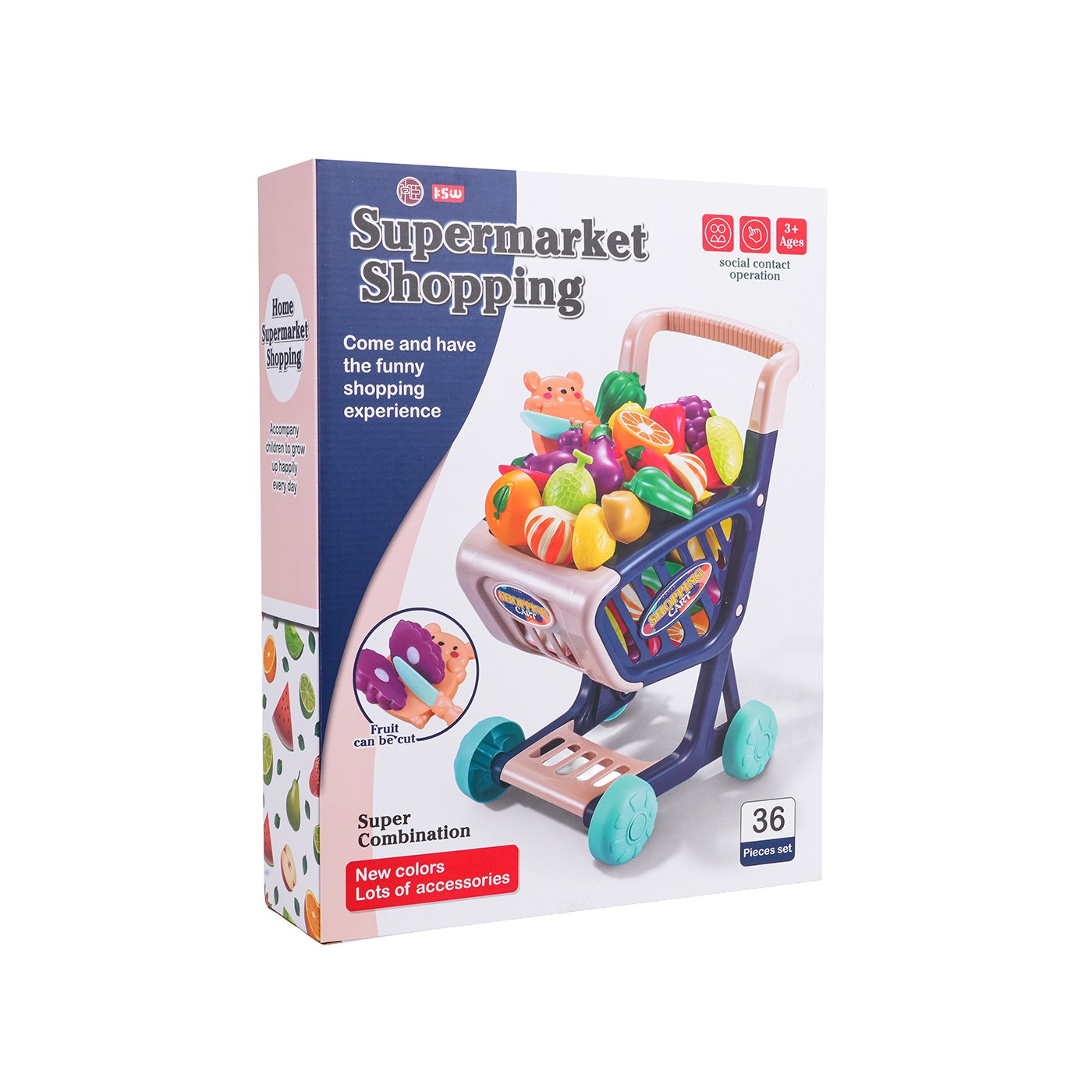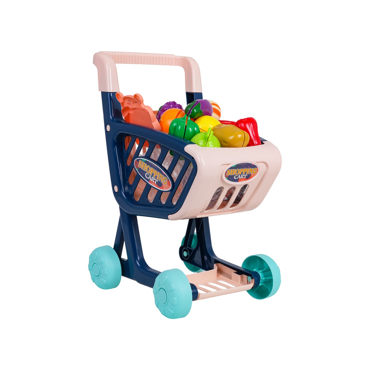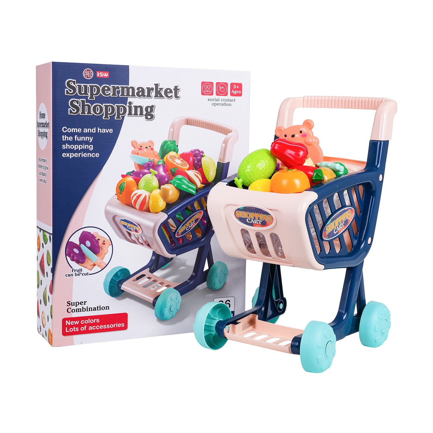 A large shopping cart with accessories for children over three years of age. Made of high-quality plastic, it features a comfortable push handle and wide wheels. The colorful vegetables and fruits imitate real ones. The entire set consists of 36 pieces.
