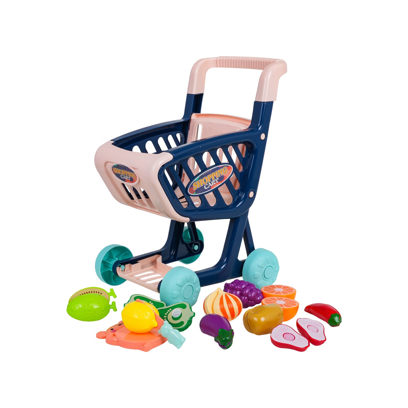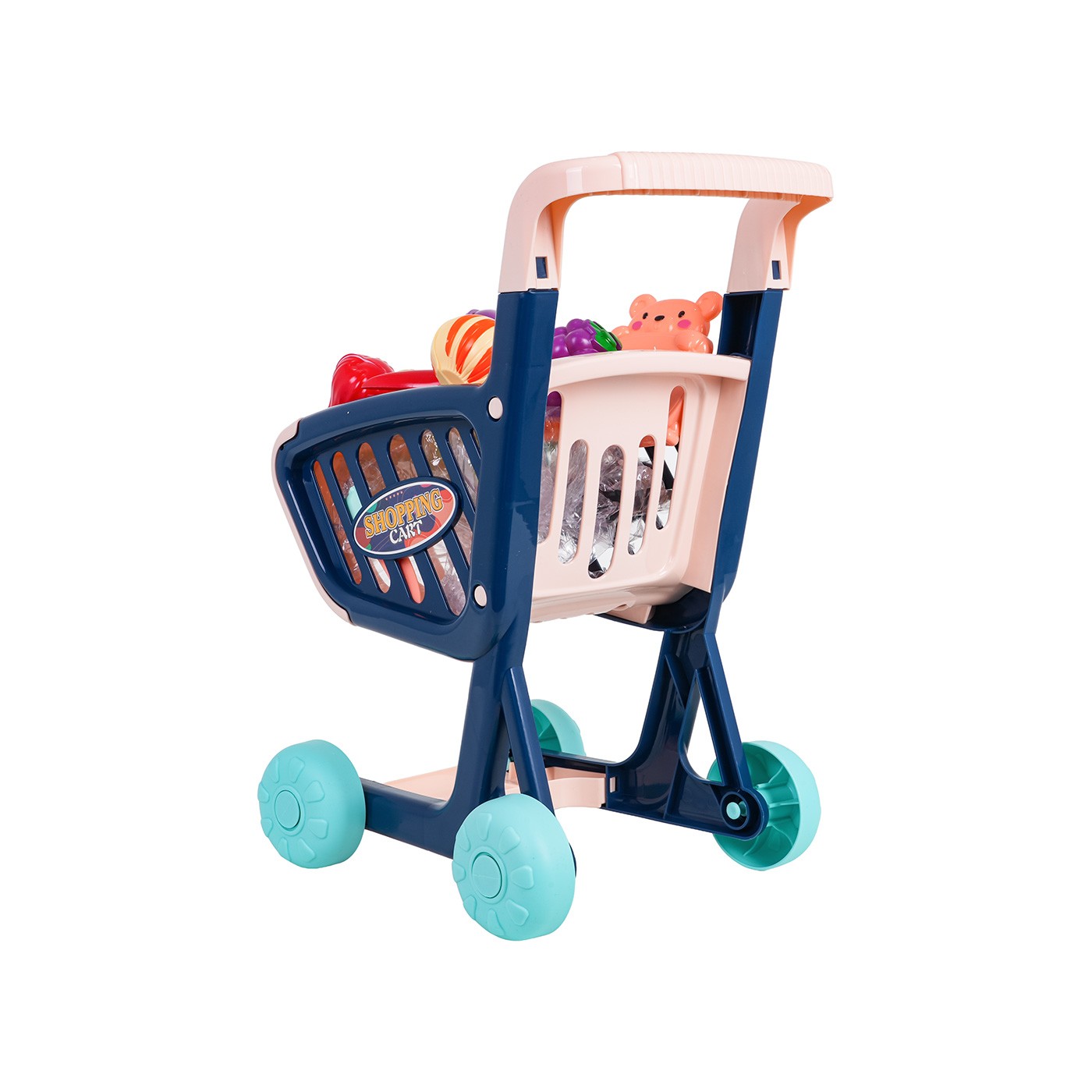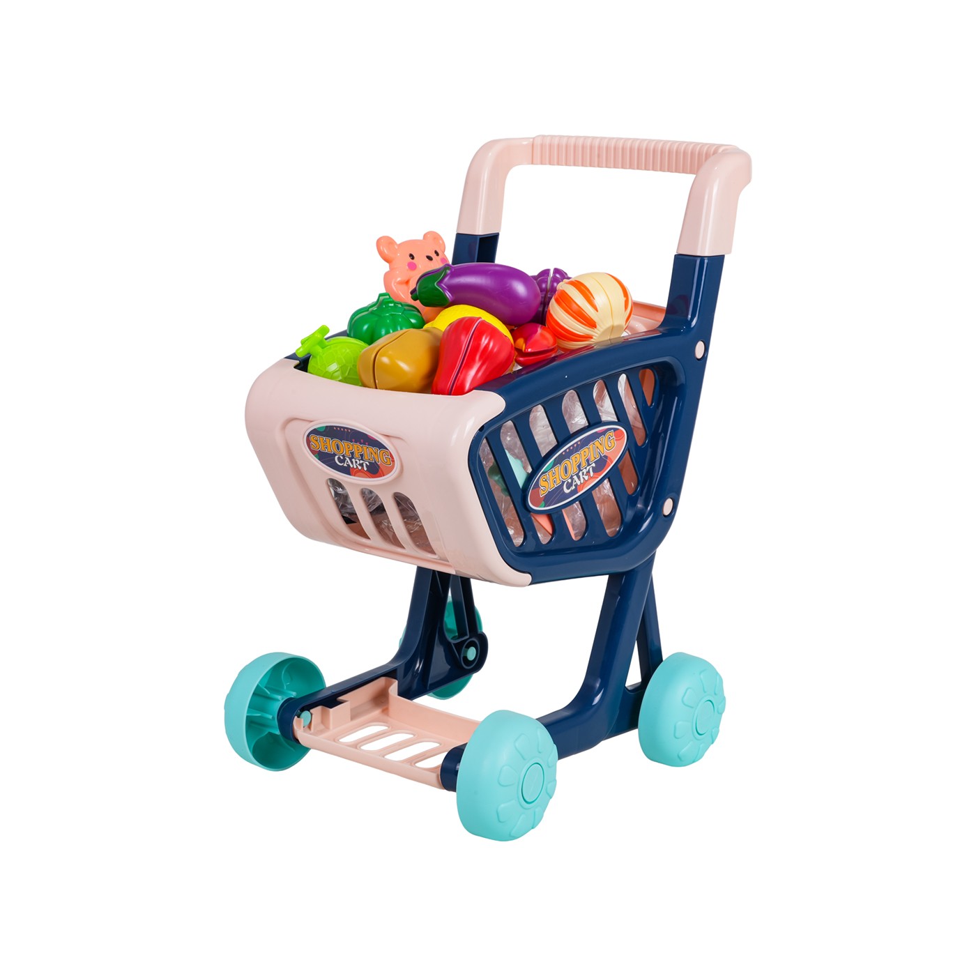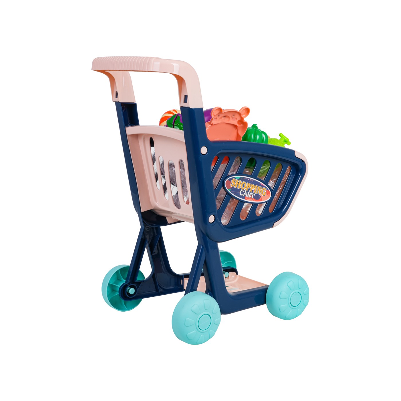 A large shopping cart with accessories for children over three years of age. Made of high-quality plastic, it features a comfortable push handle and wide wheels. The colorful vegetables and fruits imitate real ones. The entire set consists of 36 pieces.