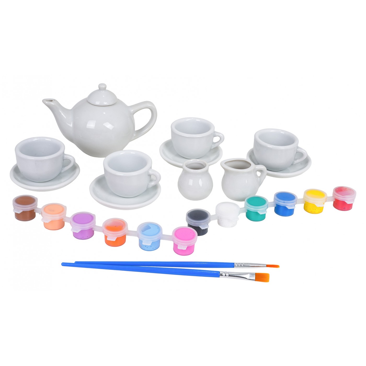 - 4 ceramic cups, - 4 saucers for cups, - milk jug, - confectioner, - teapot, - 12 x paint for painting, - 2 x brush. |