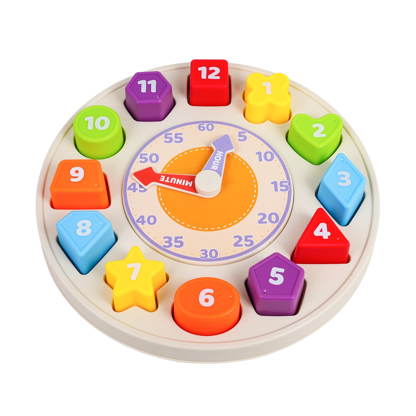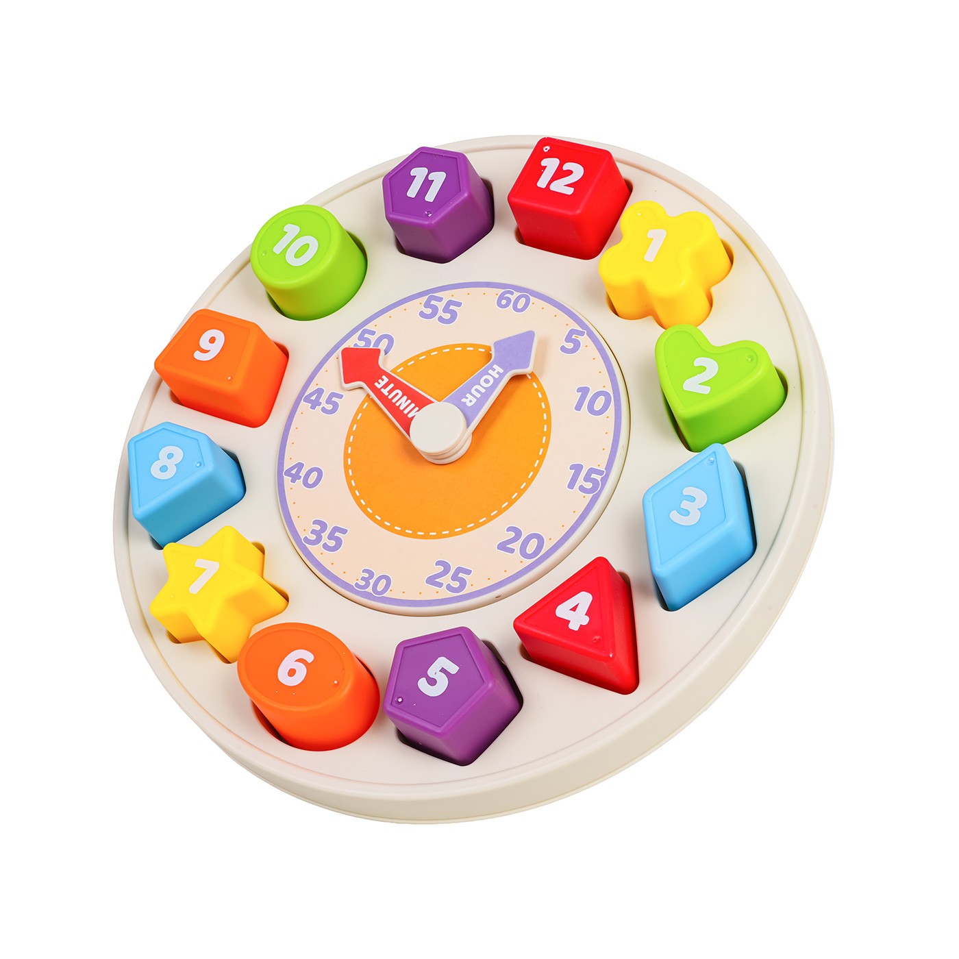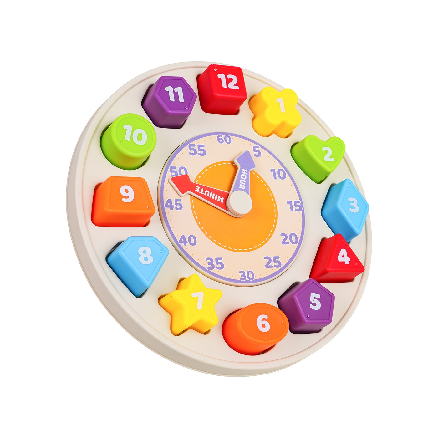 An educational clock with a shape sorter for children aged twelve months and up. Made of safe materials in vibrant colors, the clock face features movable hands and numbers from 5 to 60. On the outside of the face is a shape sorter. Toddlers can place up to 12 blocks in the variously shaped recesses. Each block is marked with a number from 1 to 12. This set will help your little one become familiar with the clock through play, learning to recognize minutes and hours, and learning about different shapes and colors.