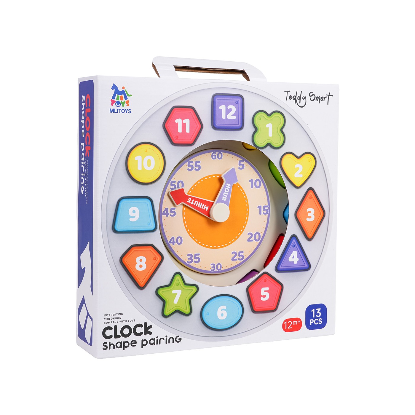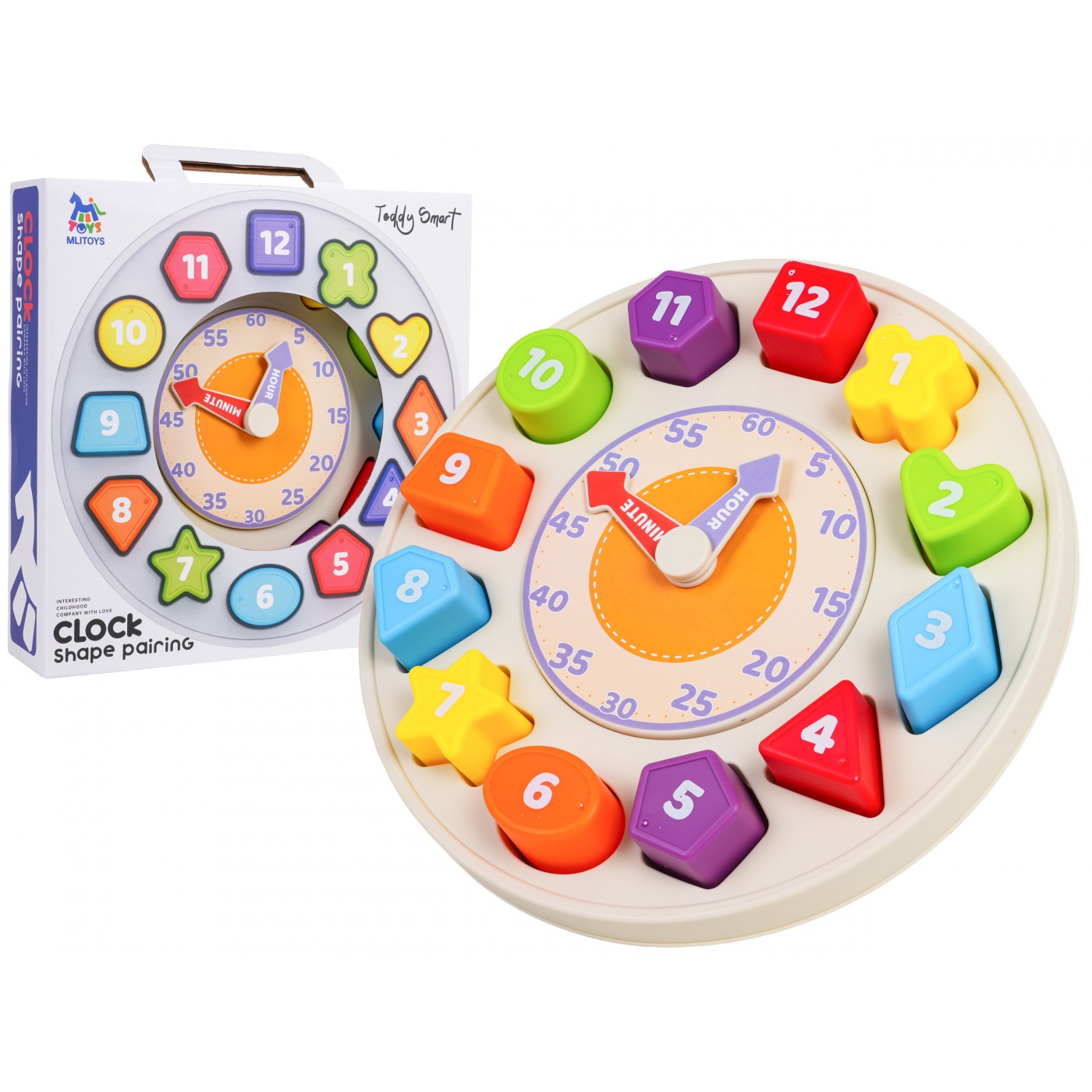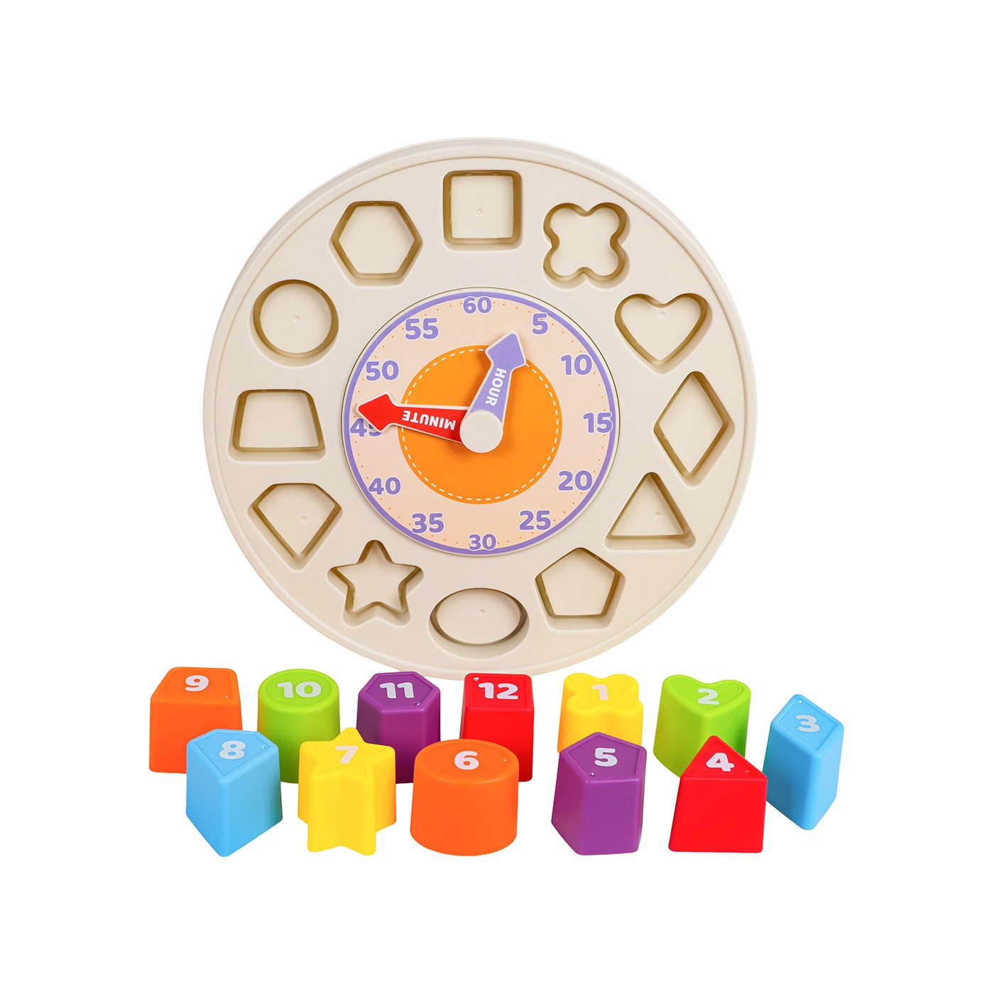 An educational clock with a shape sorter for children aged twelve months and up. Made of safe materials in vibrant colors, the clock face features movable hands and numbers from 5 to 60. On the outside of the face is a shape sorter. Toddlers can place up to 12 blocks in the variously shaped recesses. Each block is marked with a number from 1 to 12. This set will help your little one become familiar with the clock through play, learning to recognize minutes and hours, and learning about different shapes and colors.