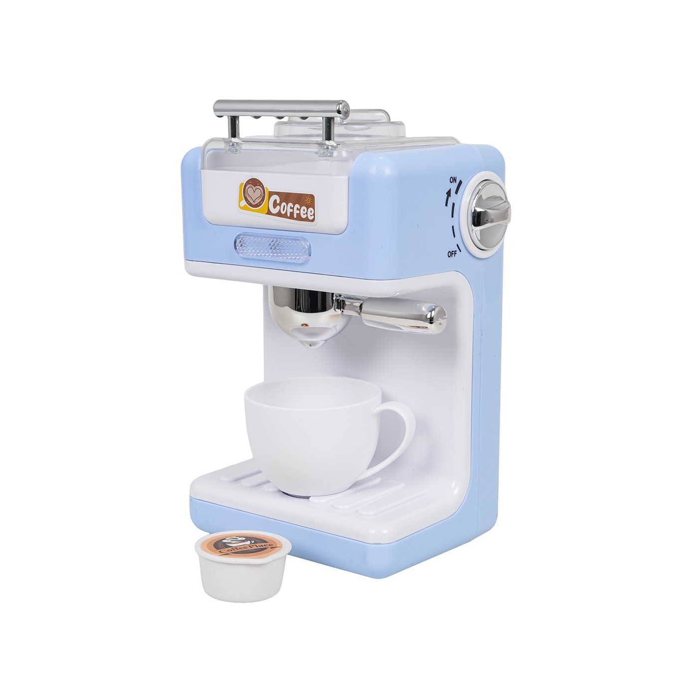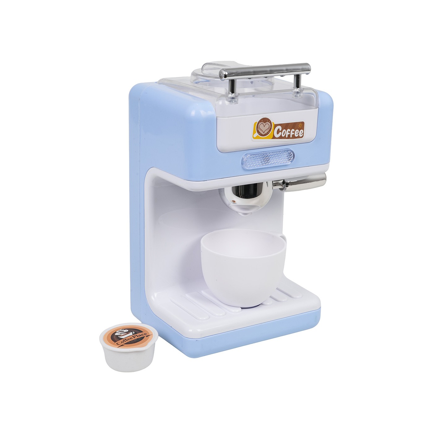 An interactive coffee machine with sound and light effects for children aged three and over. The toy is made of high-quality, child-safe plastic. The capsule coffee machine has an opening water tank. While the coffee is being prepared, you can hear brewing sounds, a light illuminates, and water is poured into the cup. The toy is powered by 2 x 1.5V AAA batteries.