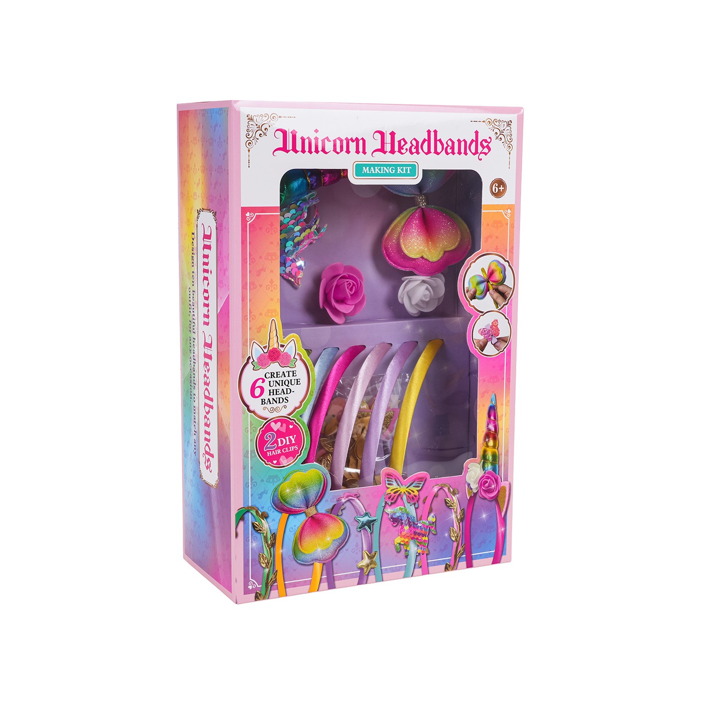 - 6 x headband, - applications: unicorn horn, bow, 3 x flowers, 2 x ears, unicorn horn, three butterflies, sequin unicorn, 5 stars, 2 x clip, ribbon with golden foxes, - scissors, - strip with self-adhesive dots. |