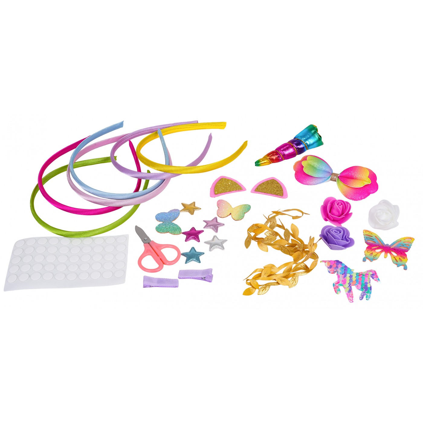 A creative hairband making kit for children aged six and up. The kit includes six hairbands and a variety of accessories for decorating them: butterflies, flowers, stars, and more, plus a sheet of self-adhesive dots. This kit develops fine motor skills and creative thinking. The finished headbands are perfect for various occasions and will be unique, as only your child will have one. Making a headband requires no sewing or cutting; simply use the self-adhesive dots.