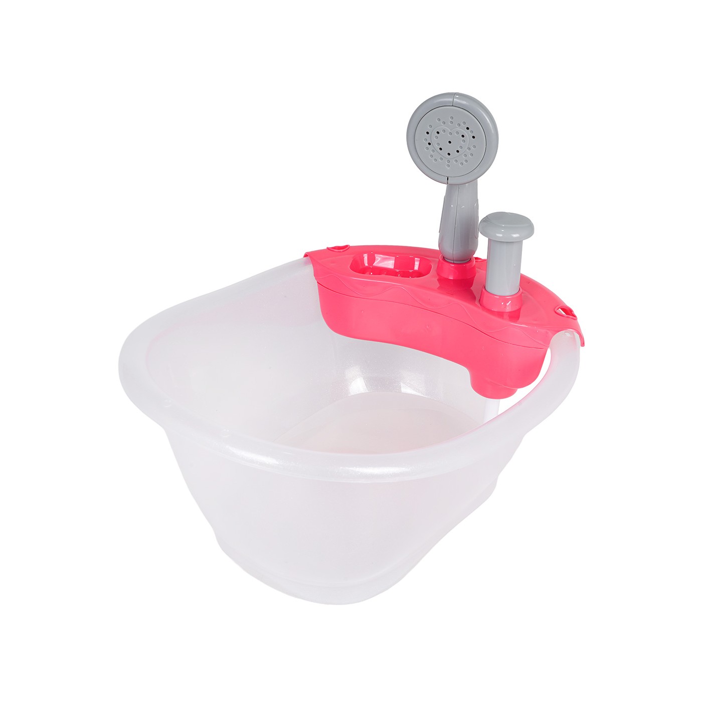 This doll bathtub with shower is a toy for children aged three and up. Fill the bathtub with water and press the pump to spray water. The set is made of child-safe materials.