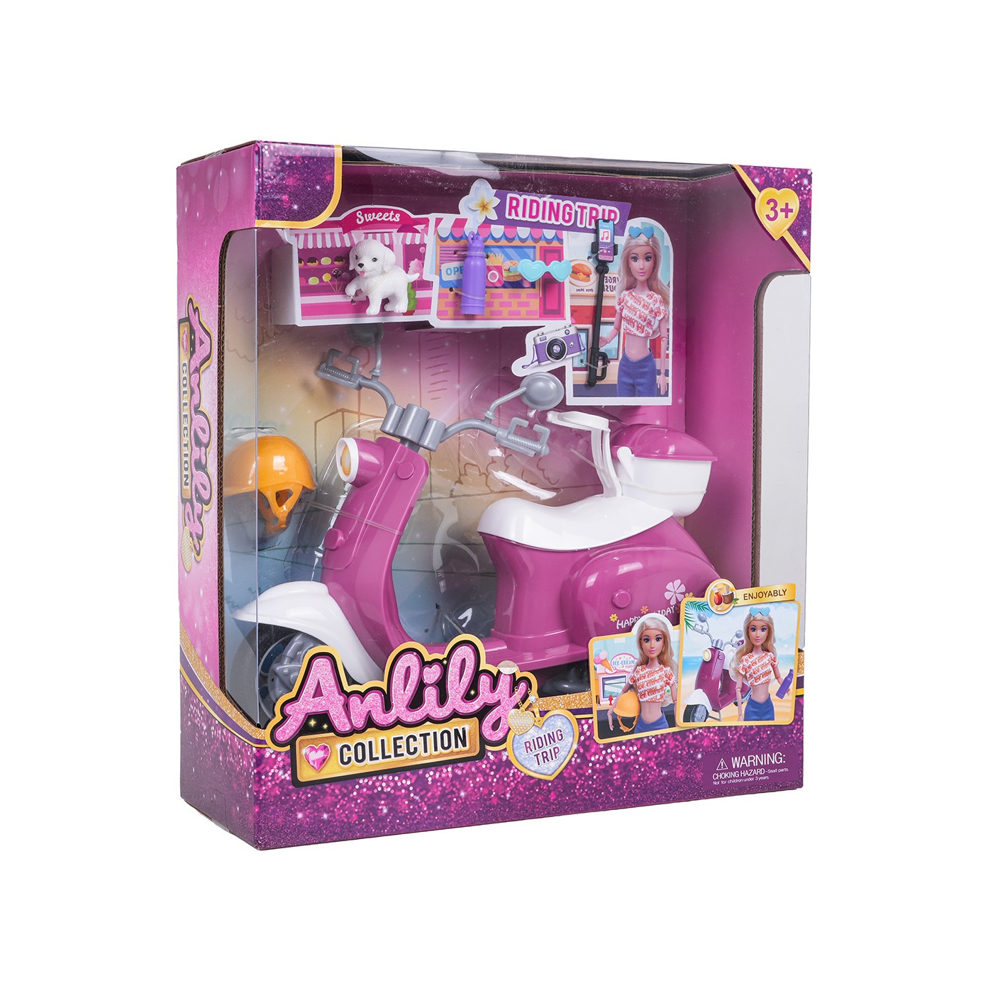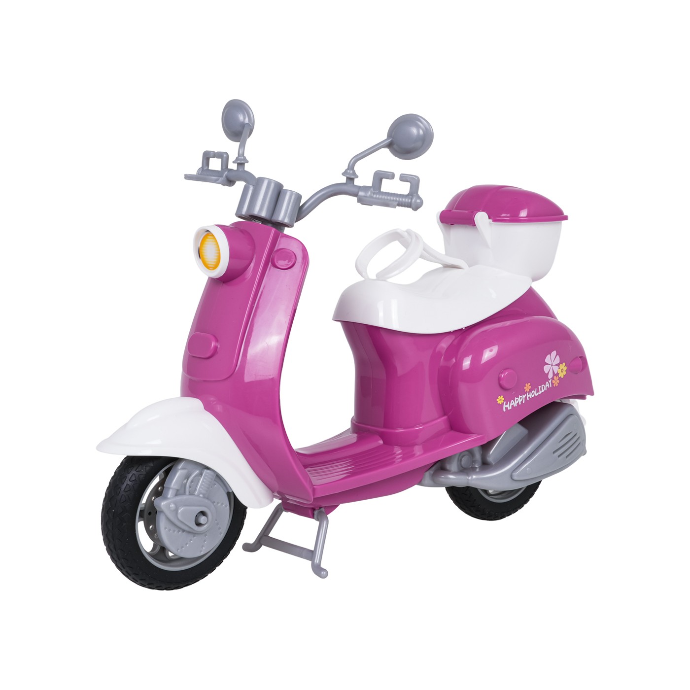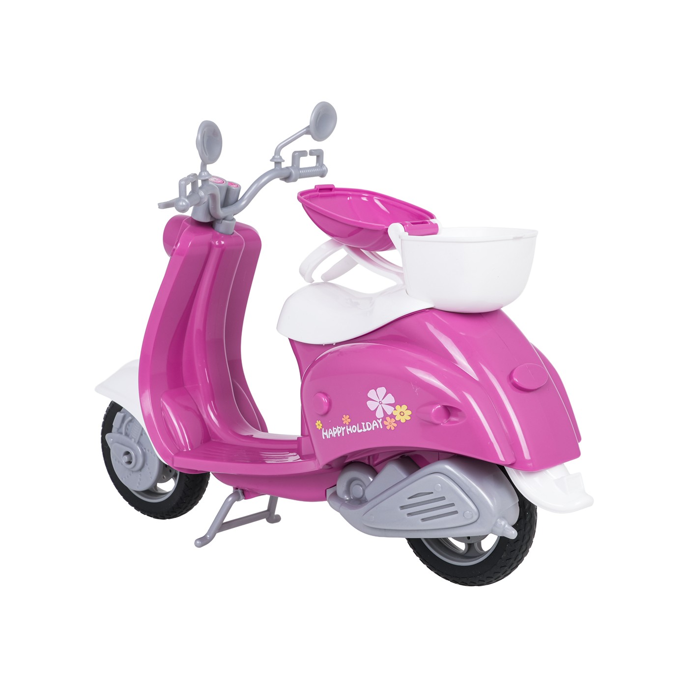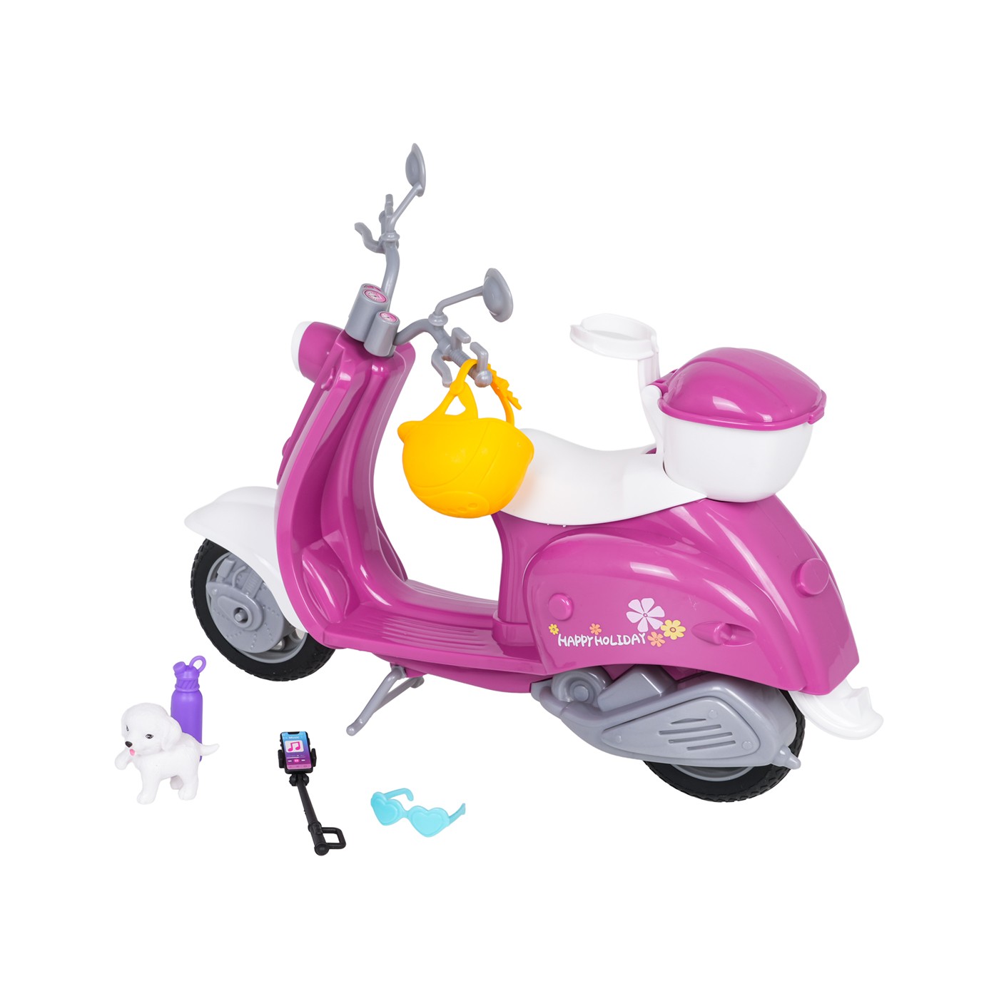 A doll scooter with accessories for children aged three and over. Made of the highest quality materials and vibrant colors, the set is eye-catching and encourages play. The pink and white scooter has a basket on the back for carrying various items, and the set includes a helmet, goggles, a phone holder, a water bottle, and a dog. Features: - set suitable for children over three years of age, - made of the best quality materials in vivid colors, - rubber wheels on the scooter, gripping the ground well, - perfect gift set. |