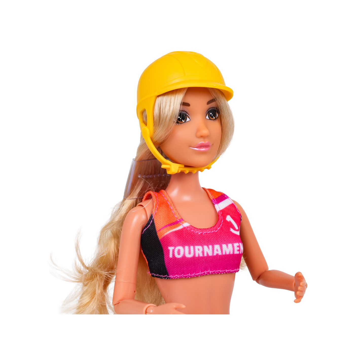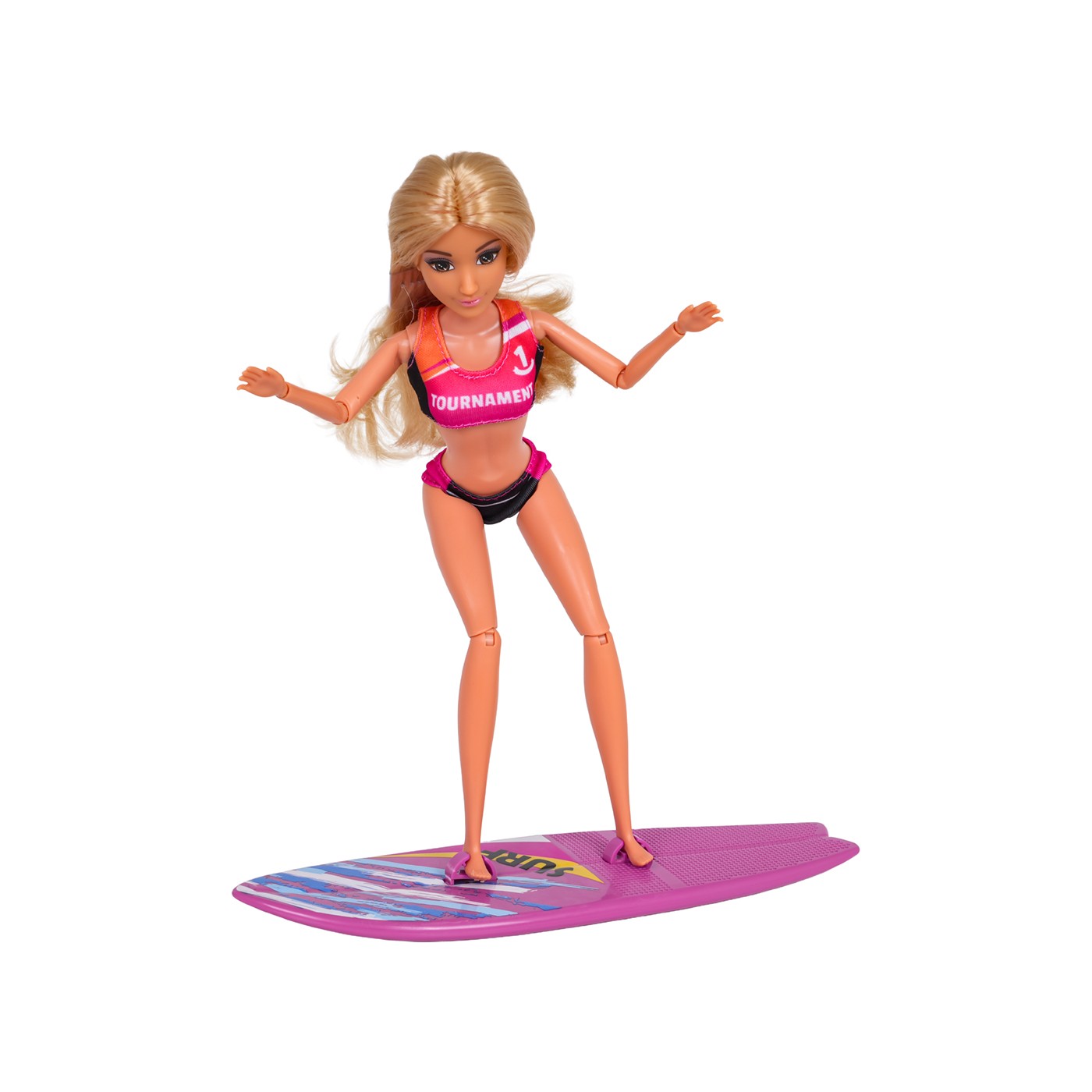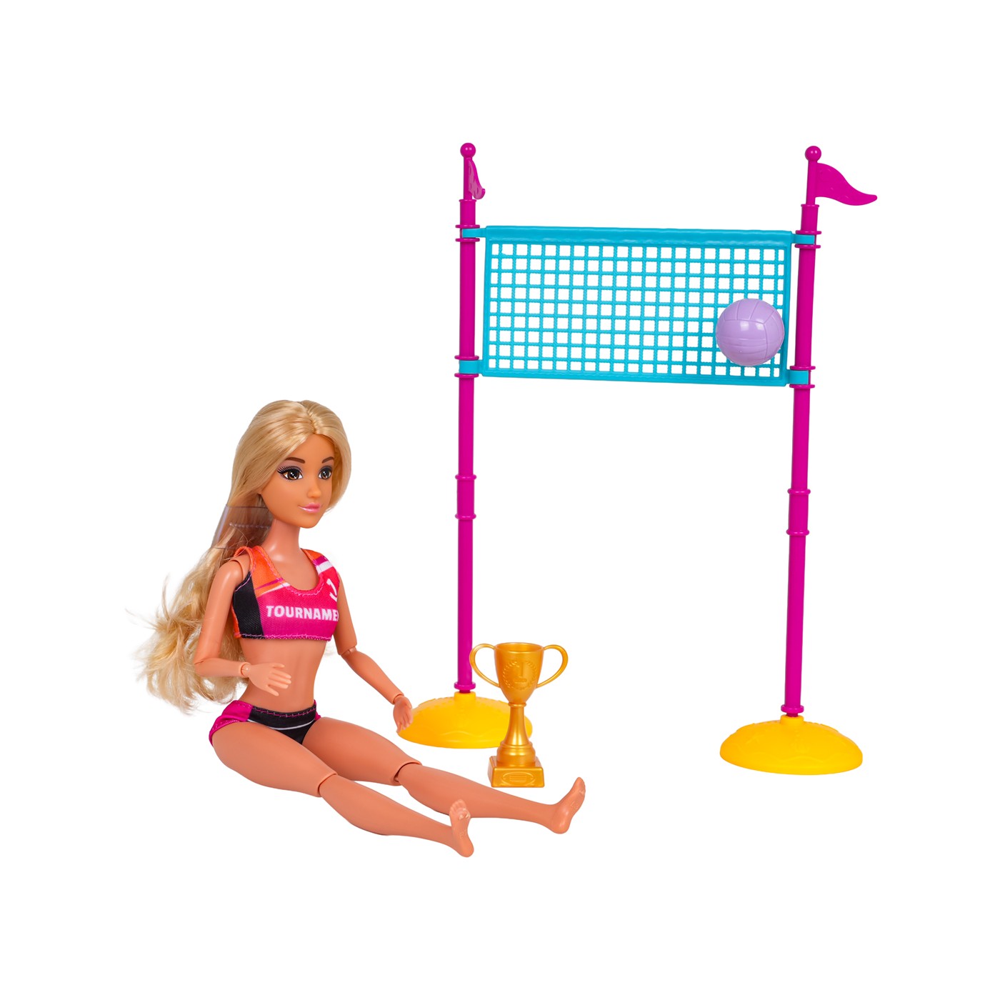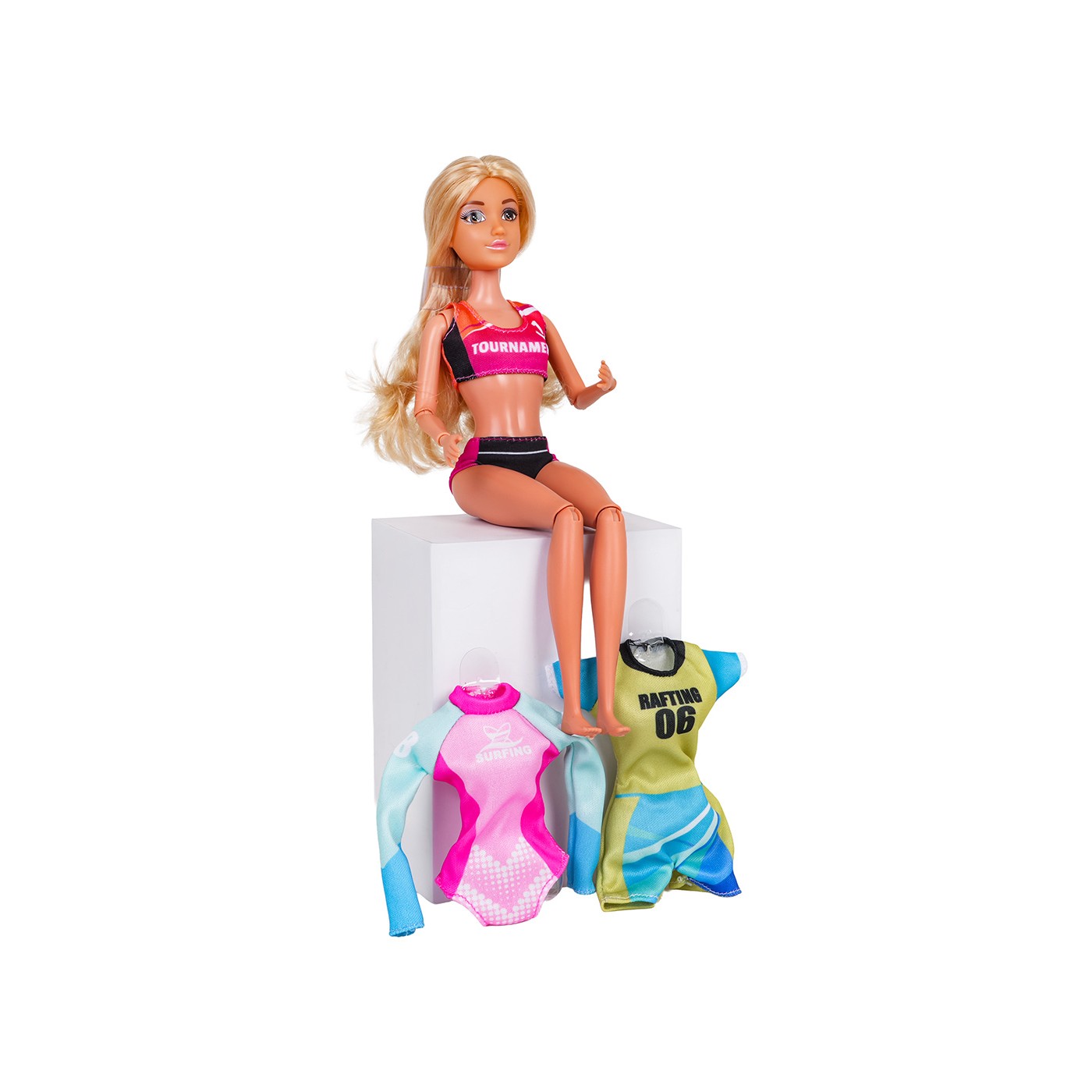 - a doll dressed in a volleyball outfit, - volleyball net, - ball, - cap, - sports shoes - victory medal, - glasses, - water bottle, - surfboard, - kayak, - helmet, - oars, - surfing clothes, - kayaking clothes. |