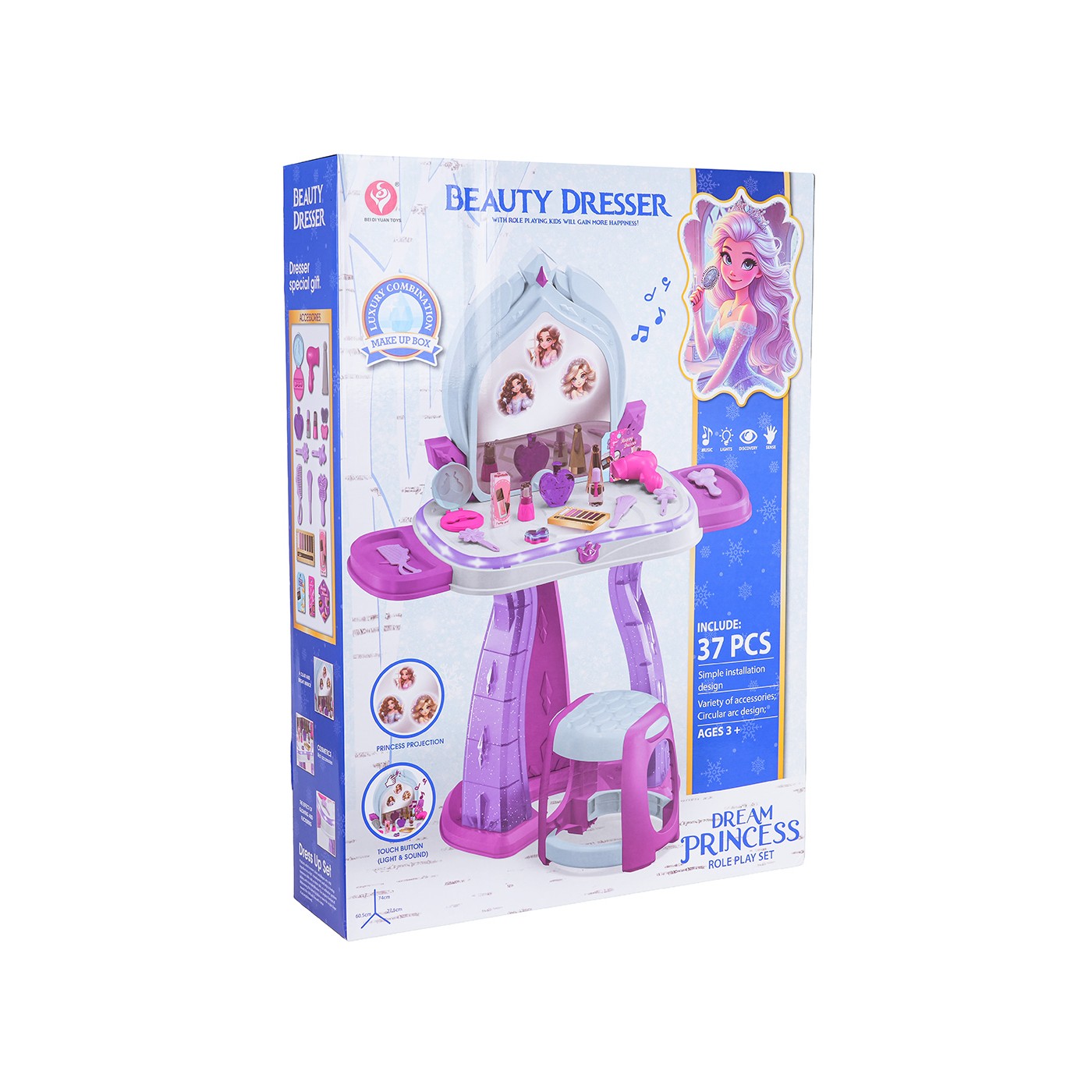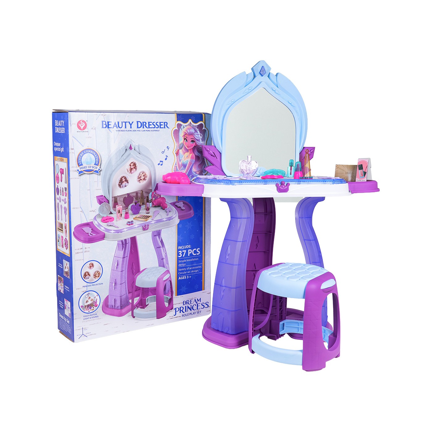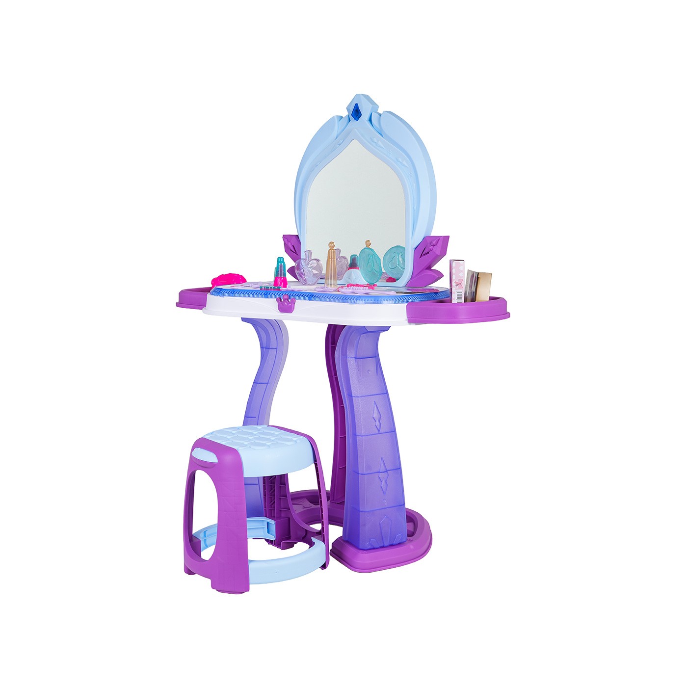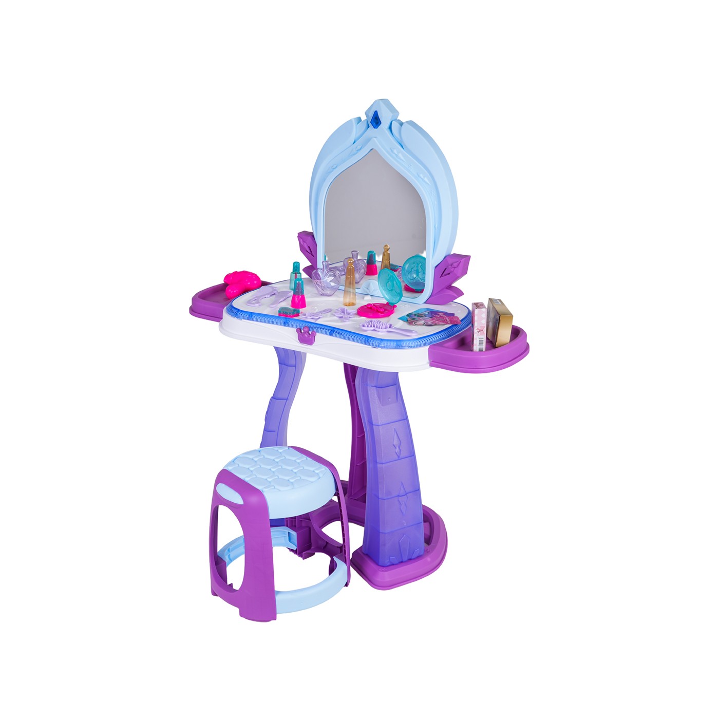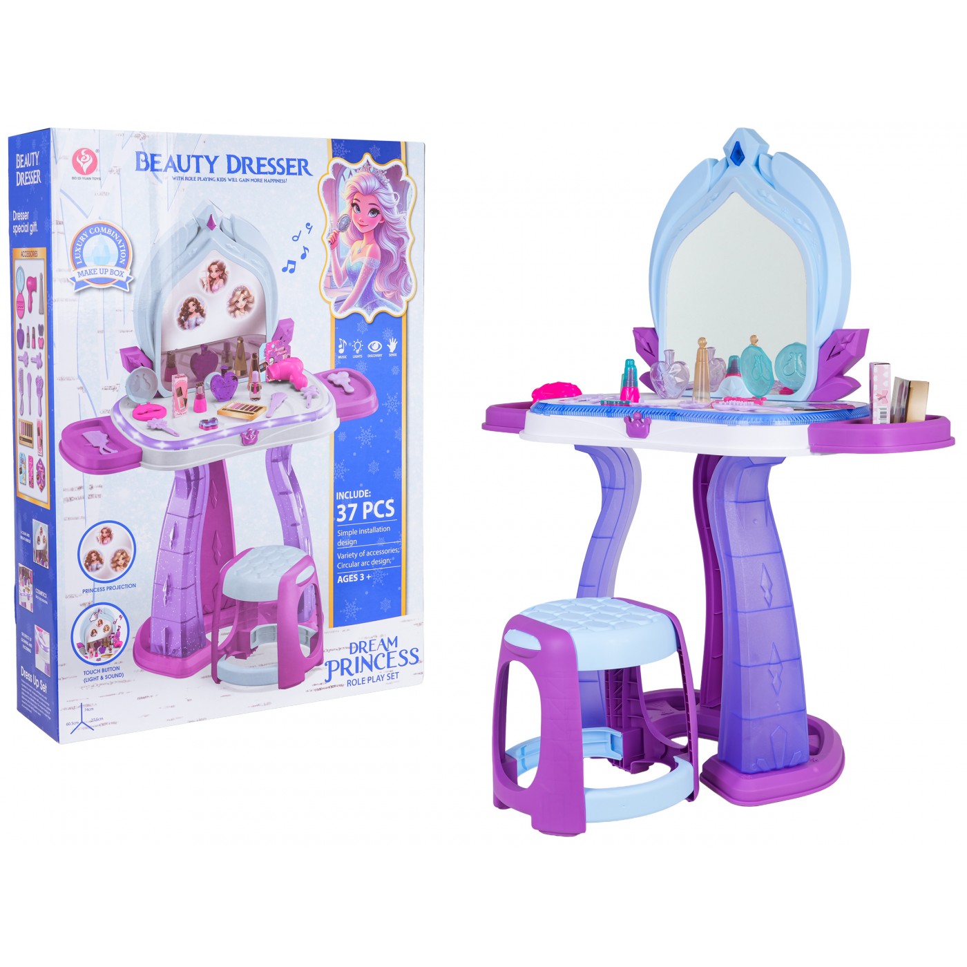 An interactive dressing table with sound and light functions for children aged three and up. The dressing table is made of the highest quality, child-safe materials and features vibrant colors. The set includes 37 beauty and makeup accessories. The dressing table features lighting around the tabletop, and princess drawings are displayed on the mirror. The lighting effects are accompanied by sound effects in the form of cheerful melodies. The toy is powered by 3 x AA 1.5V batteries (not included).