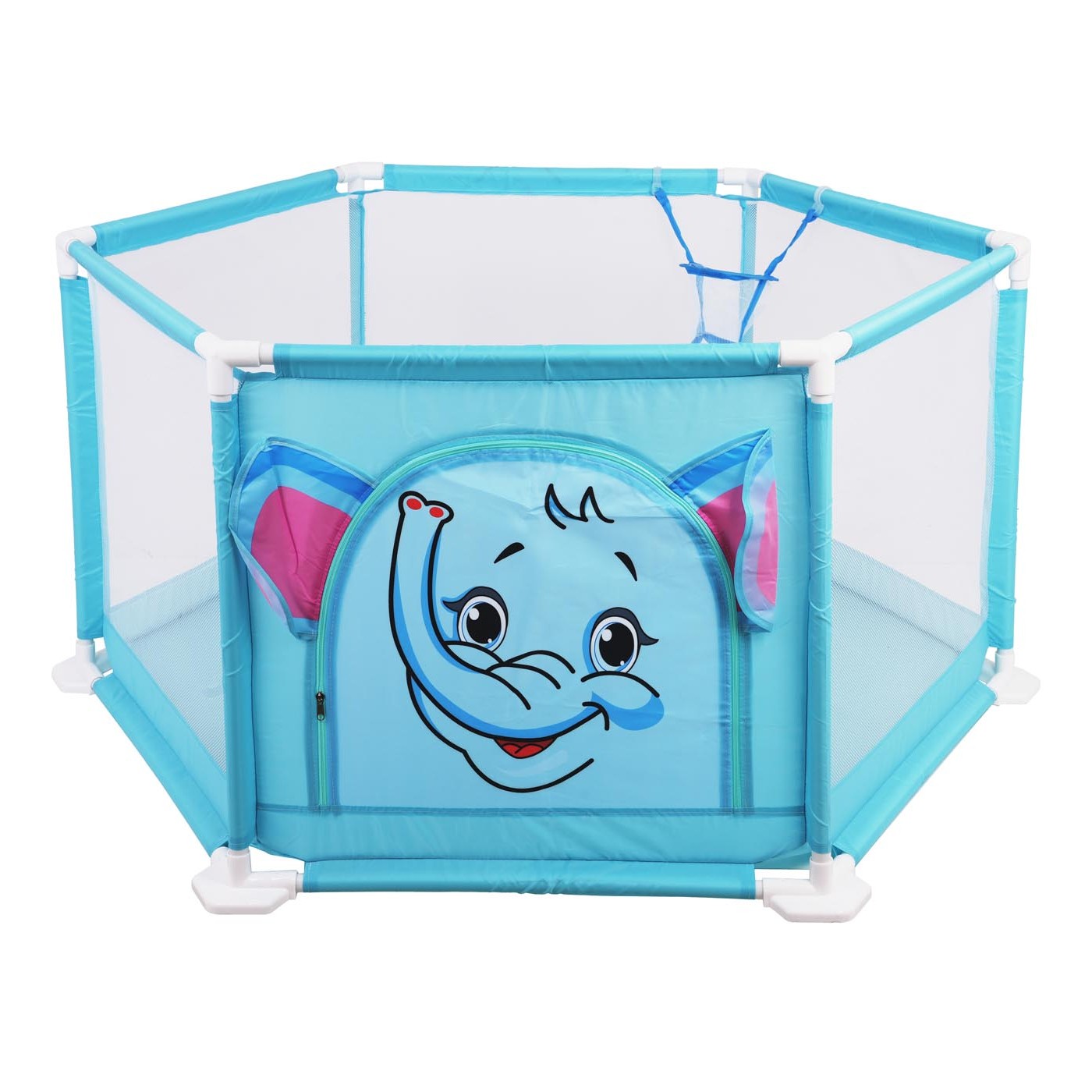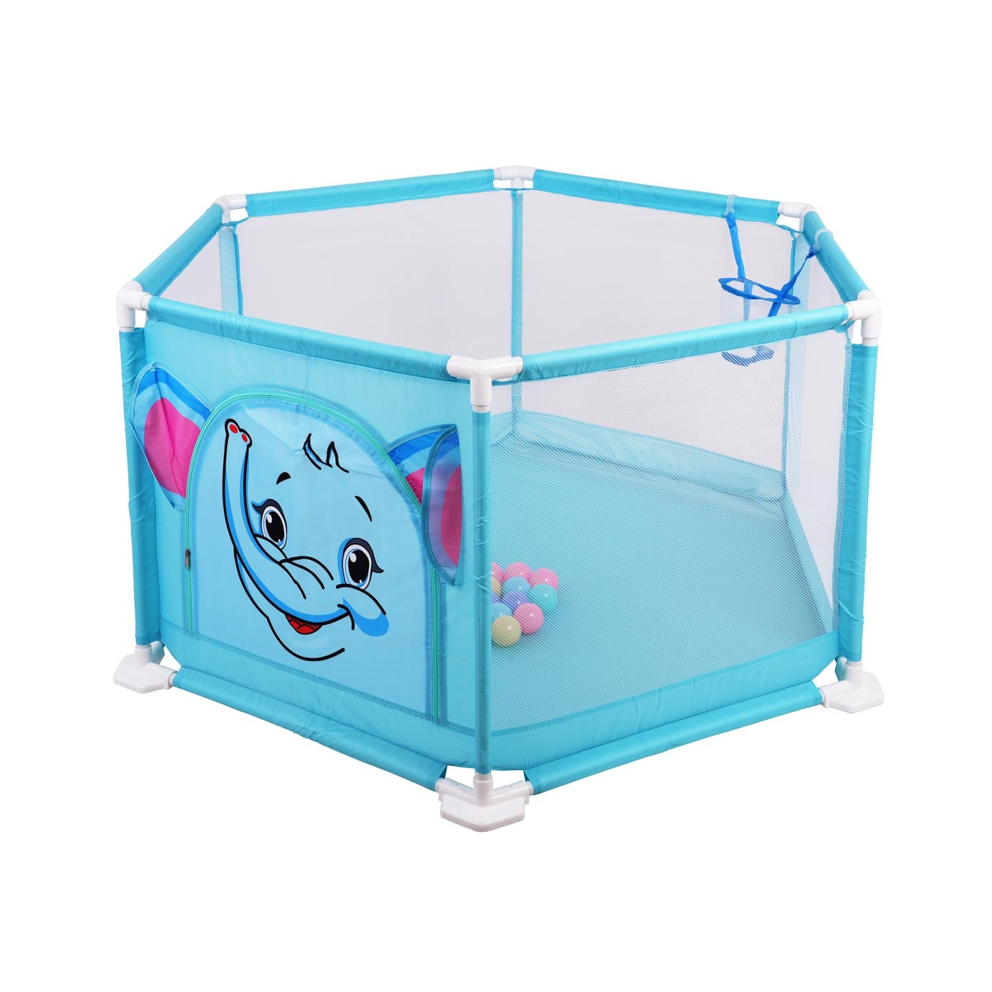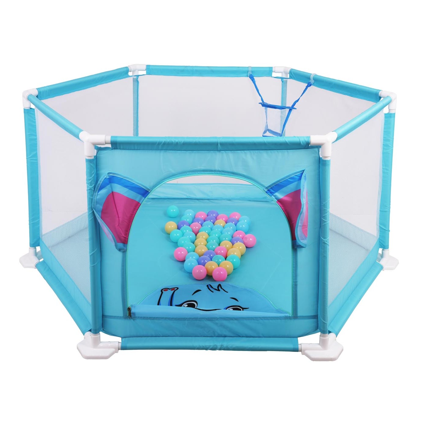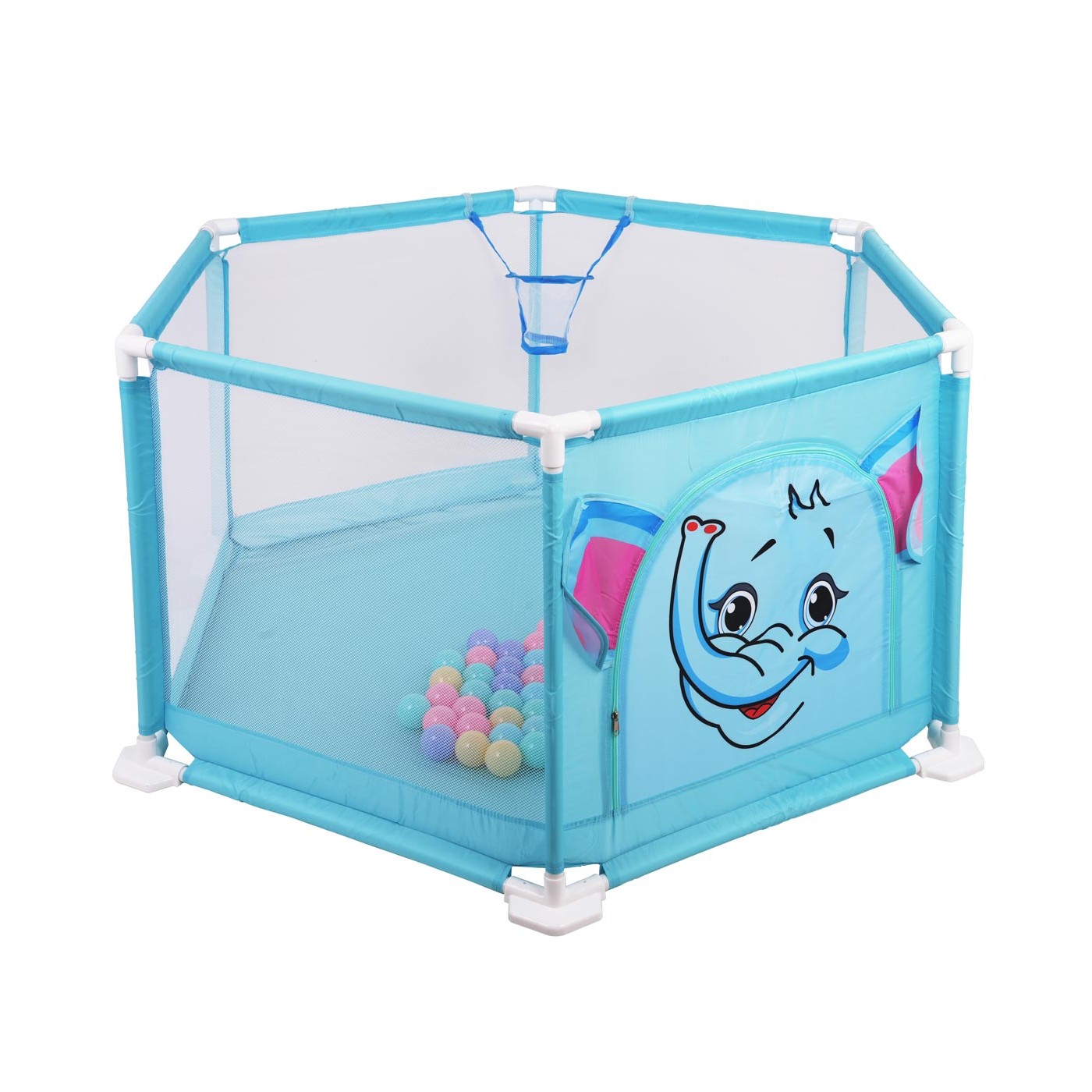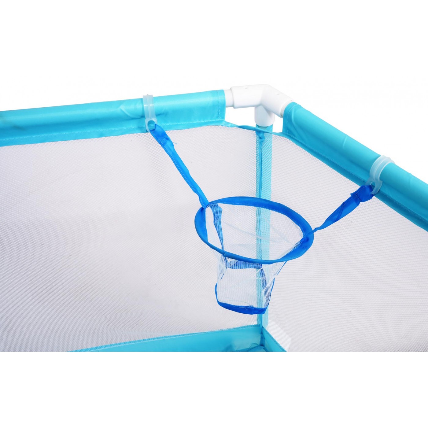 Playpen with basketball and balls in a set for children from 3 years of age. The playpen is light, so it can be quickly moved to the selected place. It is suitable for use indoors or outdoors. The material from which it is made is very easy to clean and disinfect. The playpen has 5 walls made of mesh, thanks to which we can easily observe the child. The wall with a cheerful elephant has a zipper, so the toddler can enter and exit freely. On one of the walls, inside there is a basket for balls, and the set includes 50 balls. The playpen is completely safe for the toddler and stable.