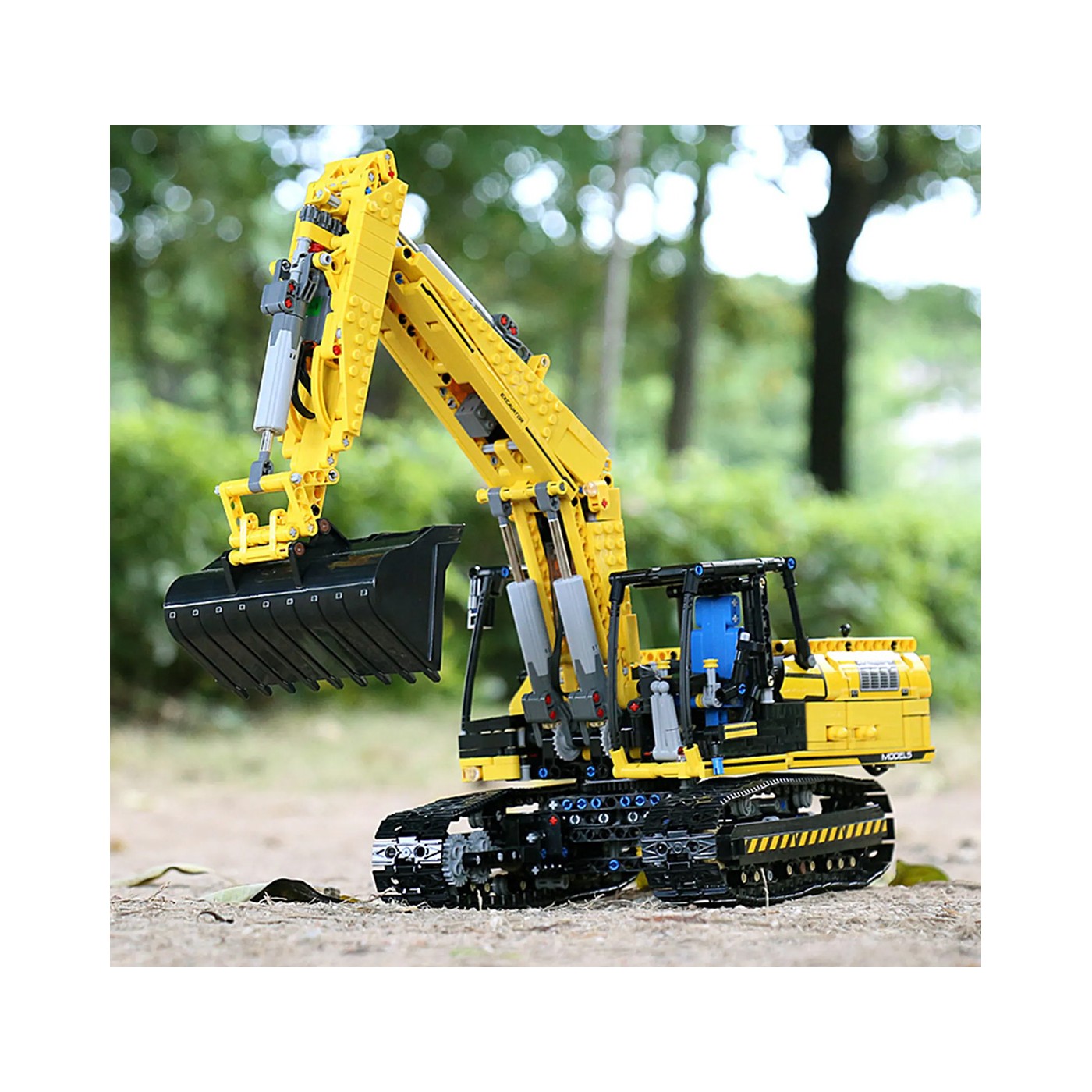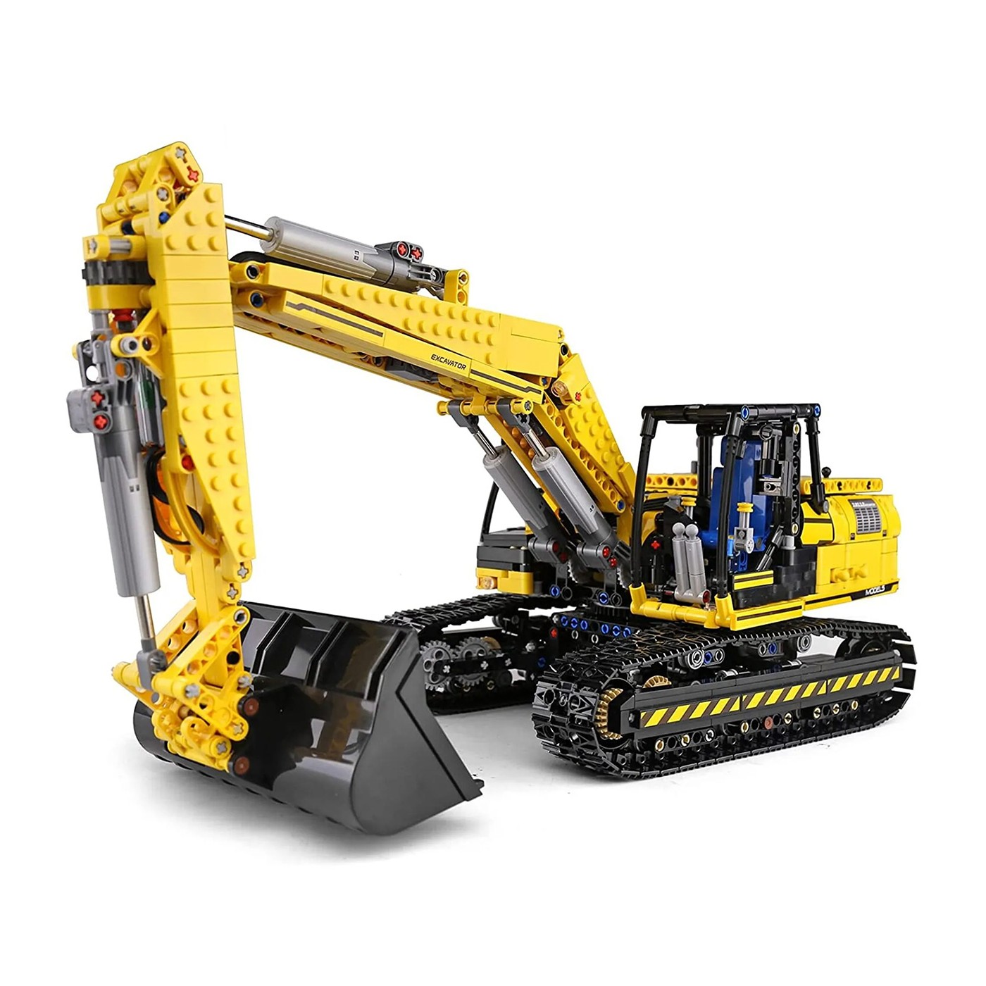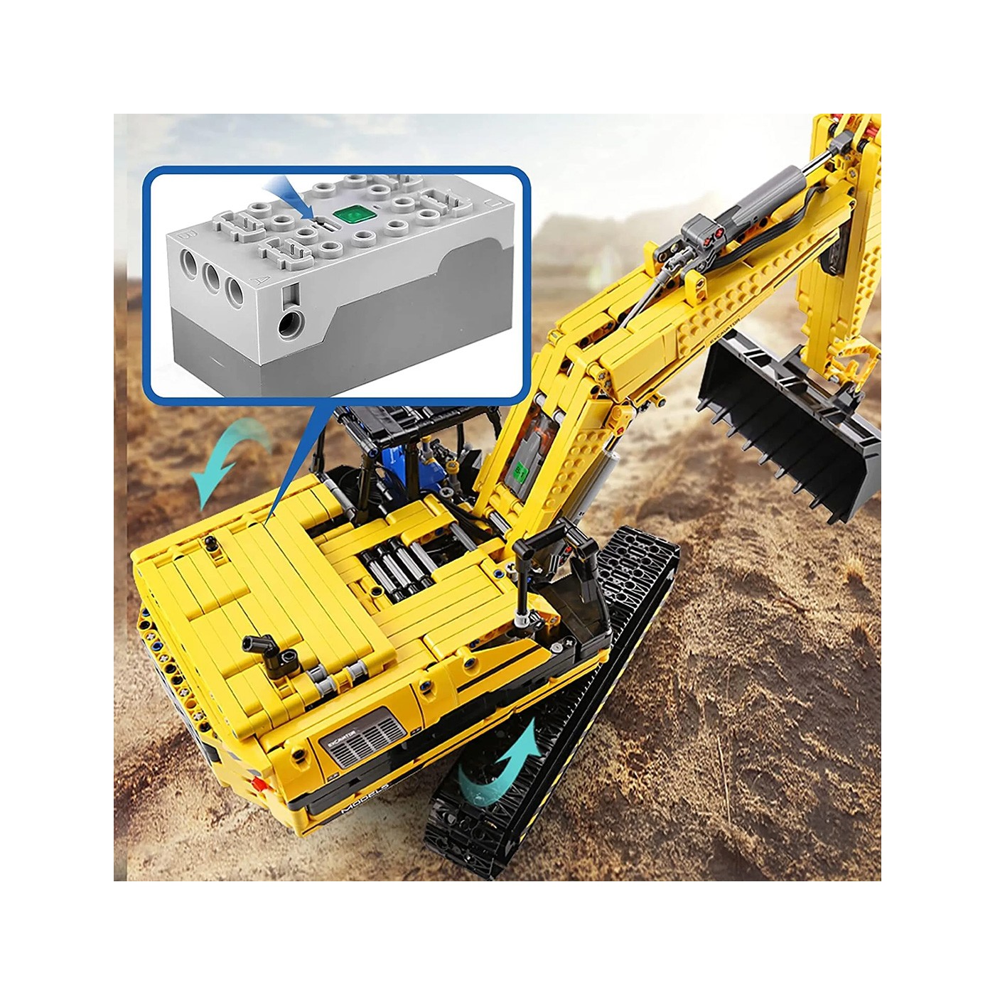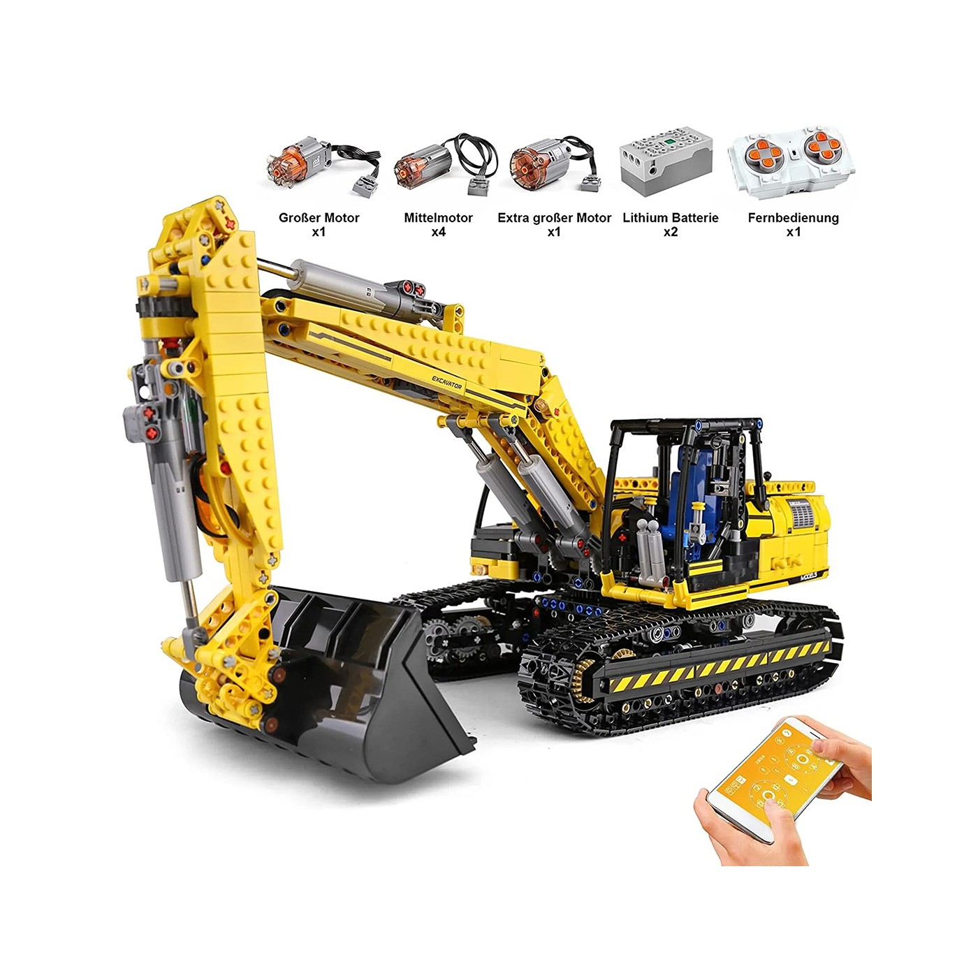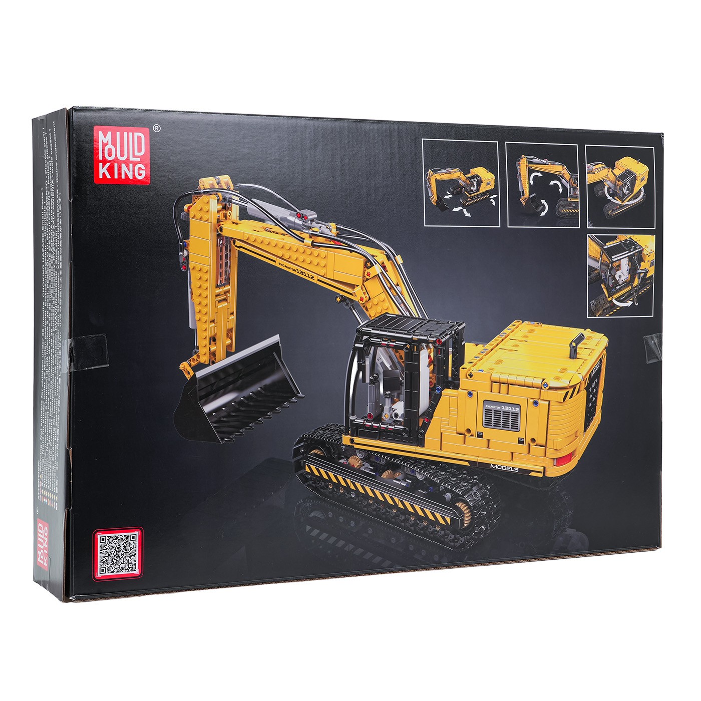 High-quality Mold King building blocks for children aged fourteen and up. This set consists of 2,169 pieces, allowing you to build a remote-controlled excavator. The excavator moves in all directions—forward, backward, left, and right—on large rubber tracks. It can be controlled using the included remote control or via an app on your phone. Download the app by scanning the QR code on the packaging. The app allows you to not only move the vehicle but also design its movements. You can also control the excavator's arm and bucket, and rotate the excavator's cab 360 degrees. The toy is powered by a 7.4V rechargeable battery (included), while the remote control uses 2 x 1.5V AAA batteries (not included).