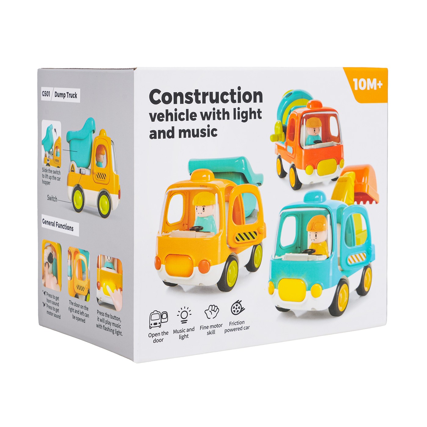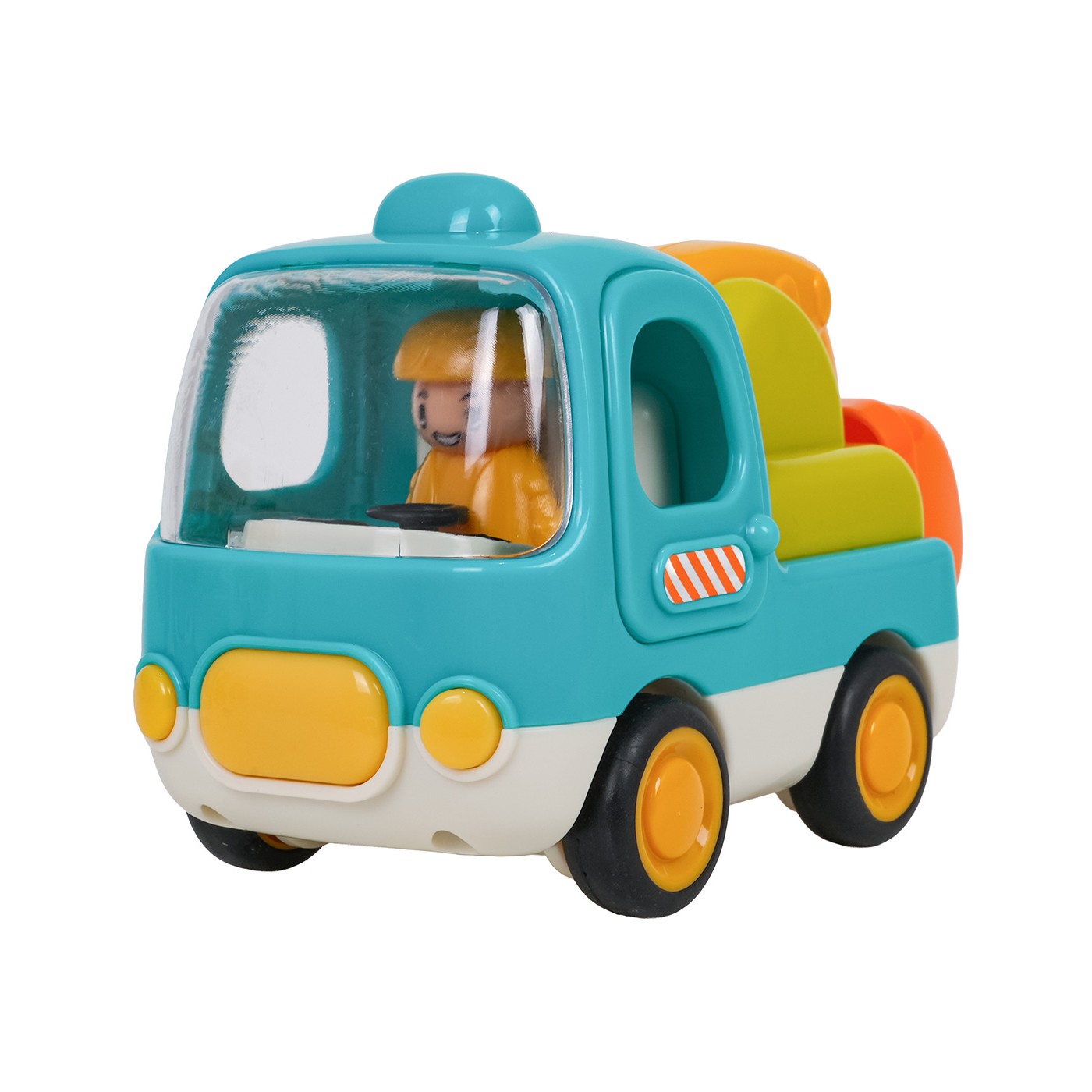 Features: - for children from ten months of age, - toy made of the best quality plastic, - sound effects: cheerful melodies (button on the front of the vehicle), vehicle starting sound and horn (buttons inside the cabin), - lighting effects: flashing button that activates melodies, - movable elements: cabin side door, excavator arm and bucket (lever on the side of the vehicle), - rubber wheels, - friction drive. |