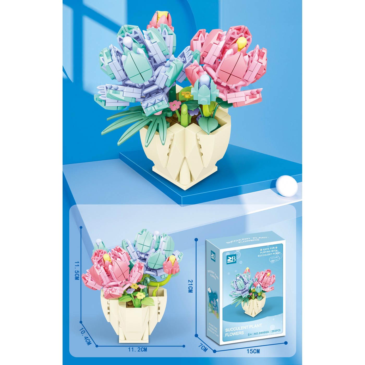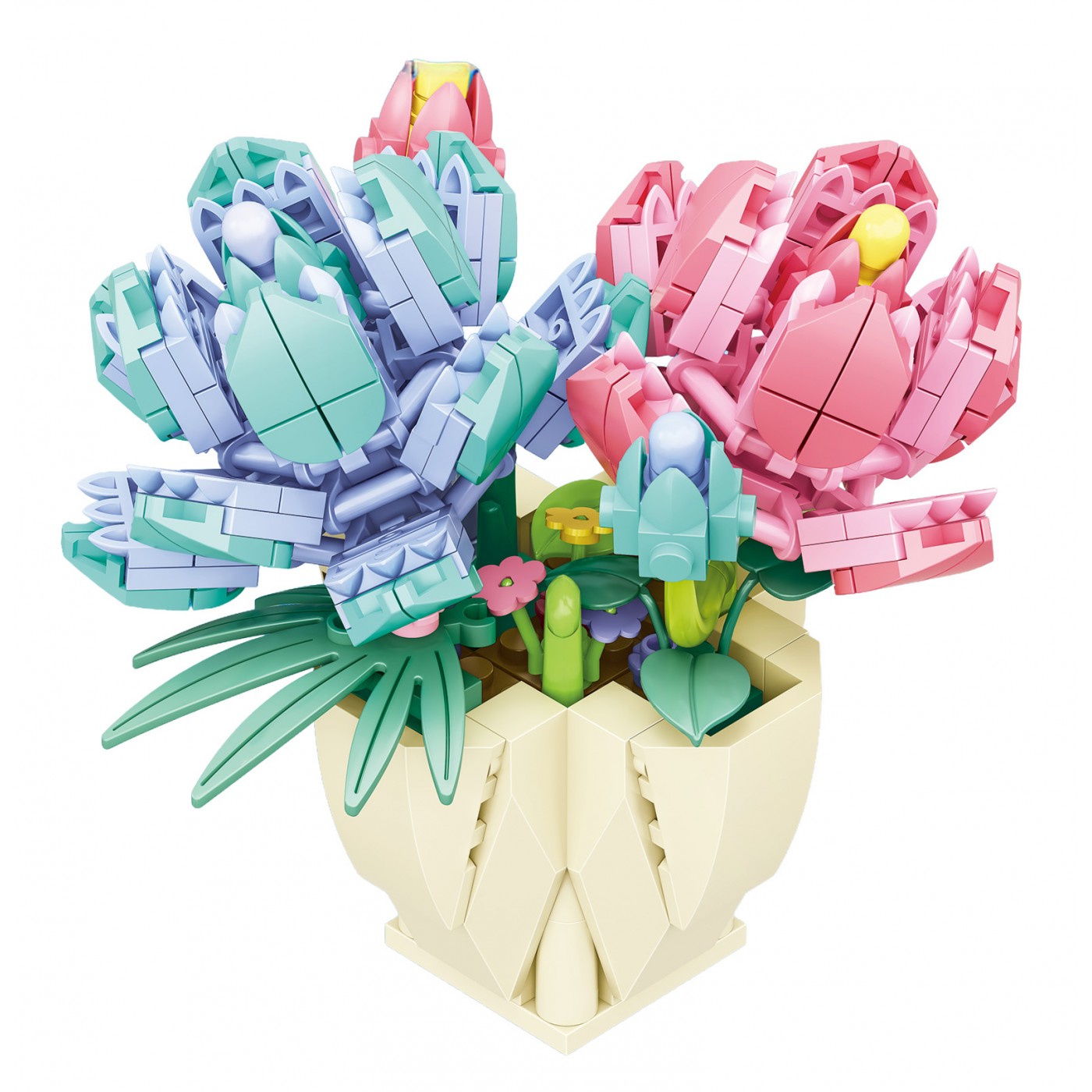 High-quality building blocks for children aged six and up. This set consists of 293 pieces, from which you can build a flower pot, which can then be given to a loved one or displayed as a decorative piece. This stunning flower arrangement, made from blocks, is sure to attract attention with its detailed details.