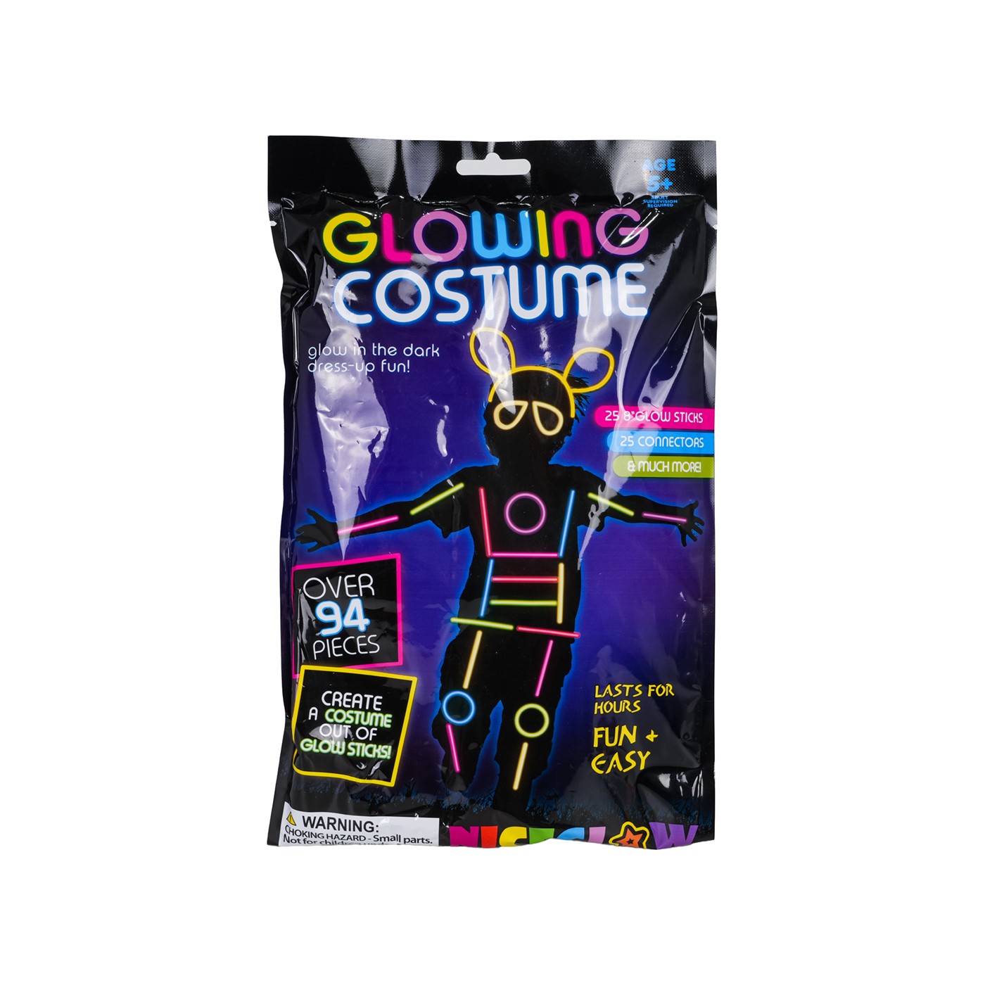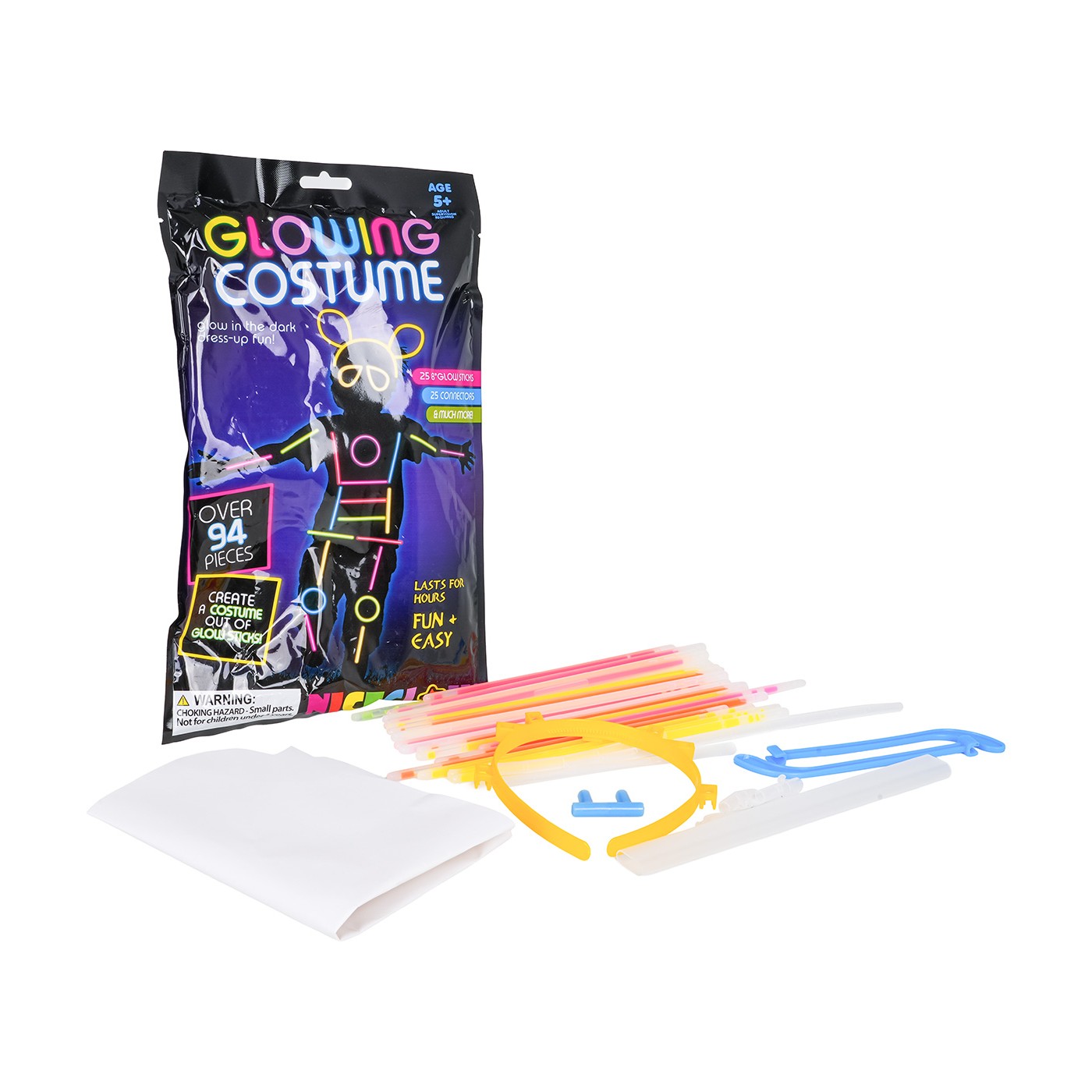 A set of glow sticks for children aged five and up. The sticks can be used to make glasses, headbands, or decorate costumes. They're perfect for balls, performances, and outdoor events. The sticks typically glow for between 6 and 8 hours, depending on the ambient temperature. The set is easy to use. Simply bend the sticks until they click, then shake them. Then, use the included connectors to shape them into glasses or a headband.