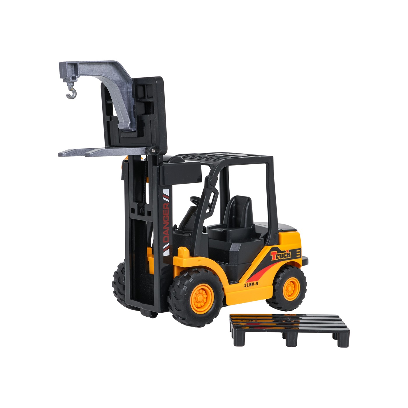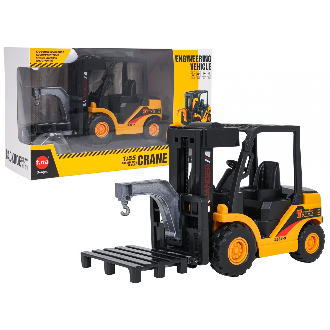 This forklift truck with friction drive, rubber tires, and moving parts is perfect for children aged three and up. The truck is manually operated, with a crank to raise and lower the load. The forks can be folded. The set also includes a pallet. The rear wheels are powered, allowing the truck to be moved forward and backward. The toy is made of high-quality, durable plastic and features a metal hook and forks. Stroller functions: - suitable for children from three years of age, - made in 1:55 scale, - friction drive, - rubber tires, - movable steering wheel, - load lifted and lowered manually, - foldable forks, - metal forks and hook. |
