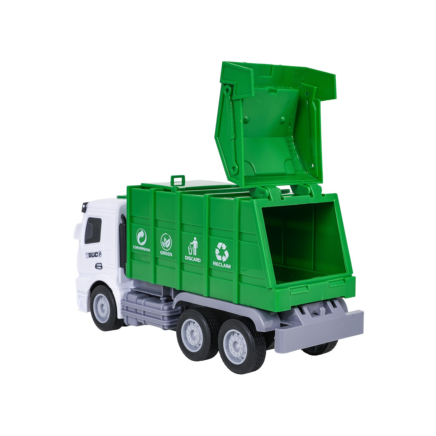 An interactive garbage truck with sound and light effects for children over three years of age. The toy is crafted from the highest quality materials with meticulous attention to detail. The vehicle's wheels are rubber, and the drive system allows for a smooth, dynamic ride. A panel on top of the cab activates sound effects such as starting, driving, and reversing sounds, as well as an energetic melody and flashing lights. The toy is powered by 3 x AG13 batteries (included).