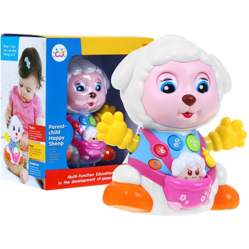 | | The button that activates the toy is located on the bottom of the sheep's head, adjusting the volume of the toy. After pressing the button, the toy is put into motion. To the rhythm of the colorful melodies, the sheep moves on a flat surface, happily beczi, turns the eyes and moves the hands. By pressing the colored buttons on the belly of the duck, we will launch in turn: - the little sheep button activates 3 different dialogs, - the yellow button activates the melody, crying and laughing, - the green button activates 3 different melodies, - the blue button activates 2 songs in English, - the red button activates the sound of a piano, a guitar and a drum, - the orange button activates the sound of knocking, laughter, bleating, - the nose button activates recording functions and voice change, - GO button activates dancing, starting with eyelets and handles, - blowing in the mouth causes the sheep to blush. All musical motifs are accompanied by blinking, colorful lights on the ears. |