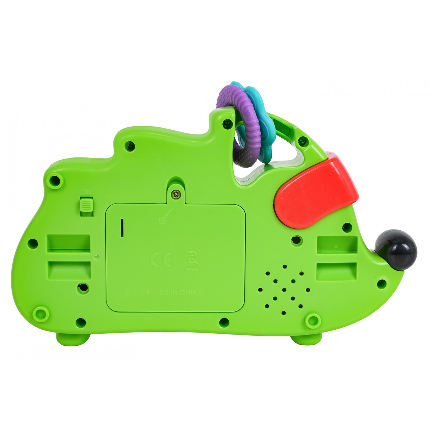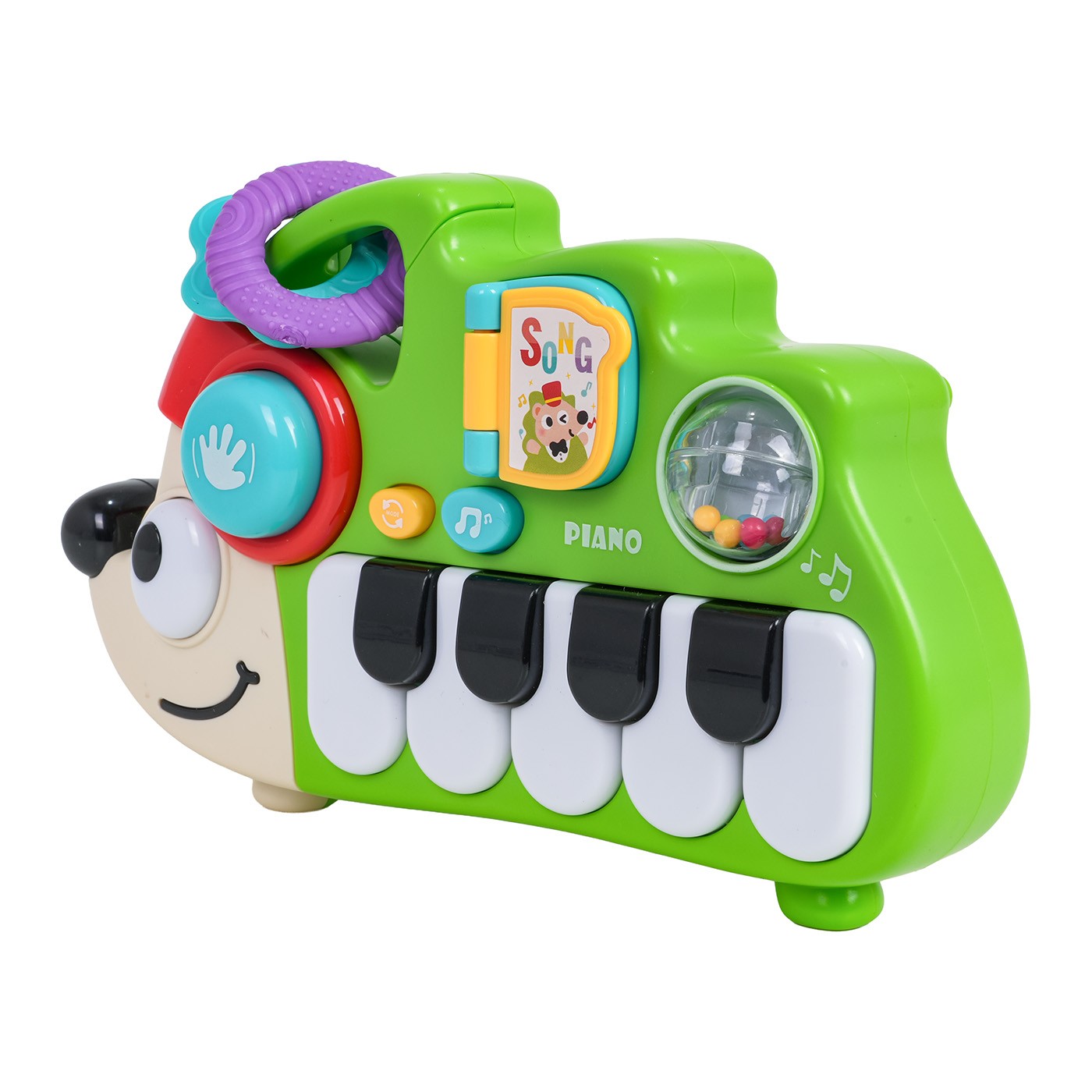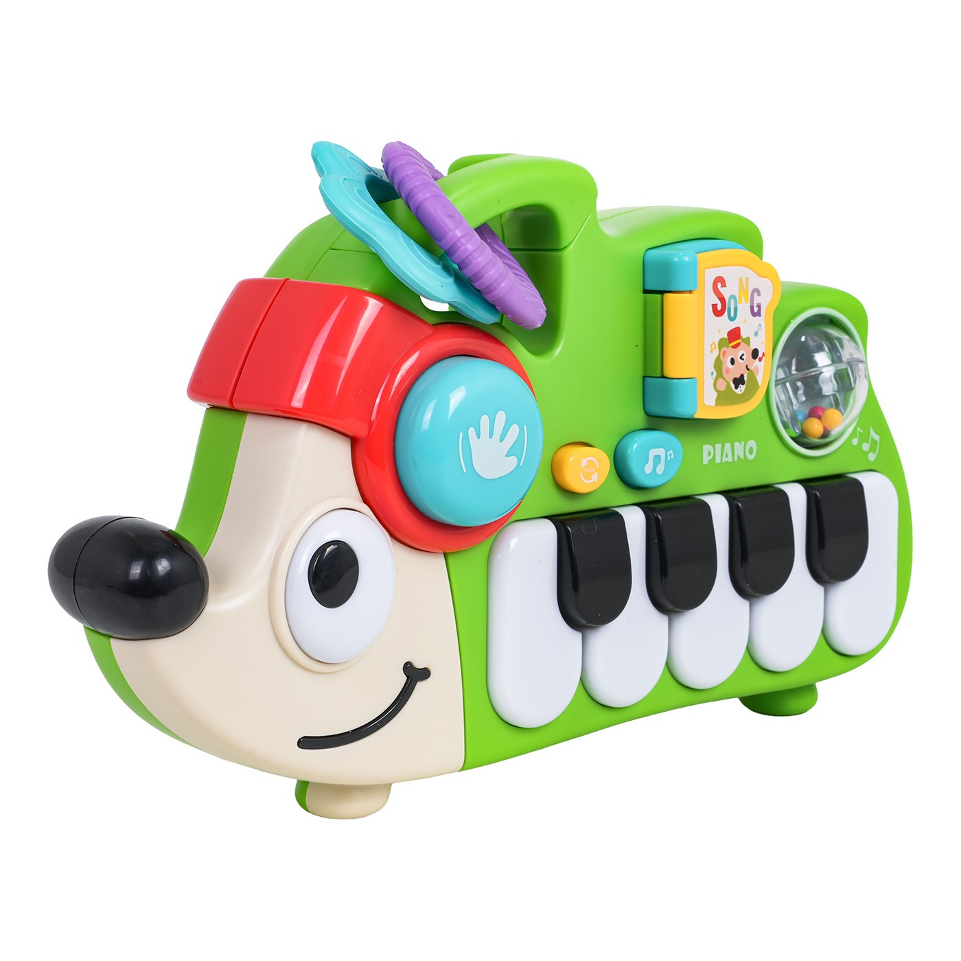 A hedgehog-shaped piano for babies from eighteen months of age. Made of the highest quality materials, this toy has no sharp edges. Vibrant colors capture baby's attention and spark curiosity. The piano has five white keys and four black keys. Above the keys is a button that switches modes and activates the melody. Above it are a flip book, a drum, a rattle with colorful balls, and a teether. The toy is powered by 3 x AAA 1.5V batteries (not included).