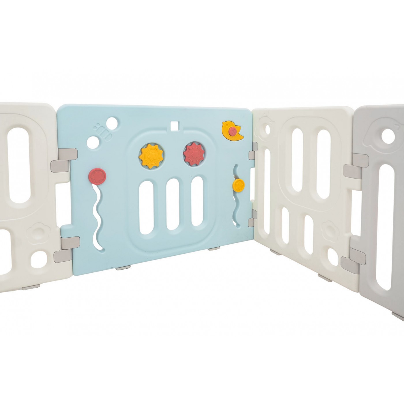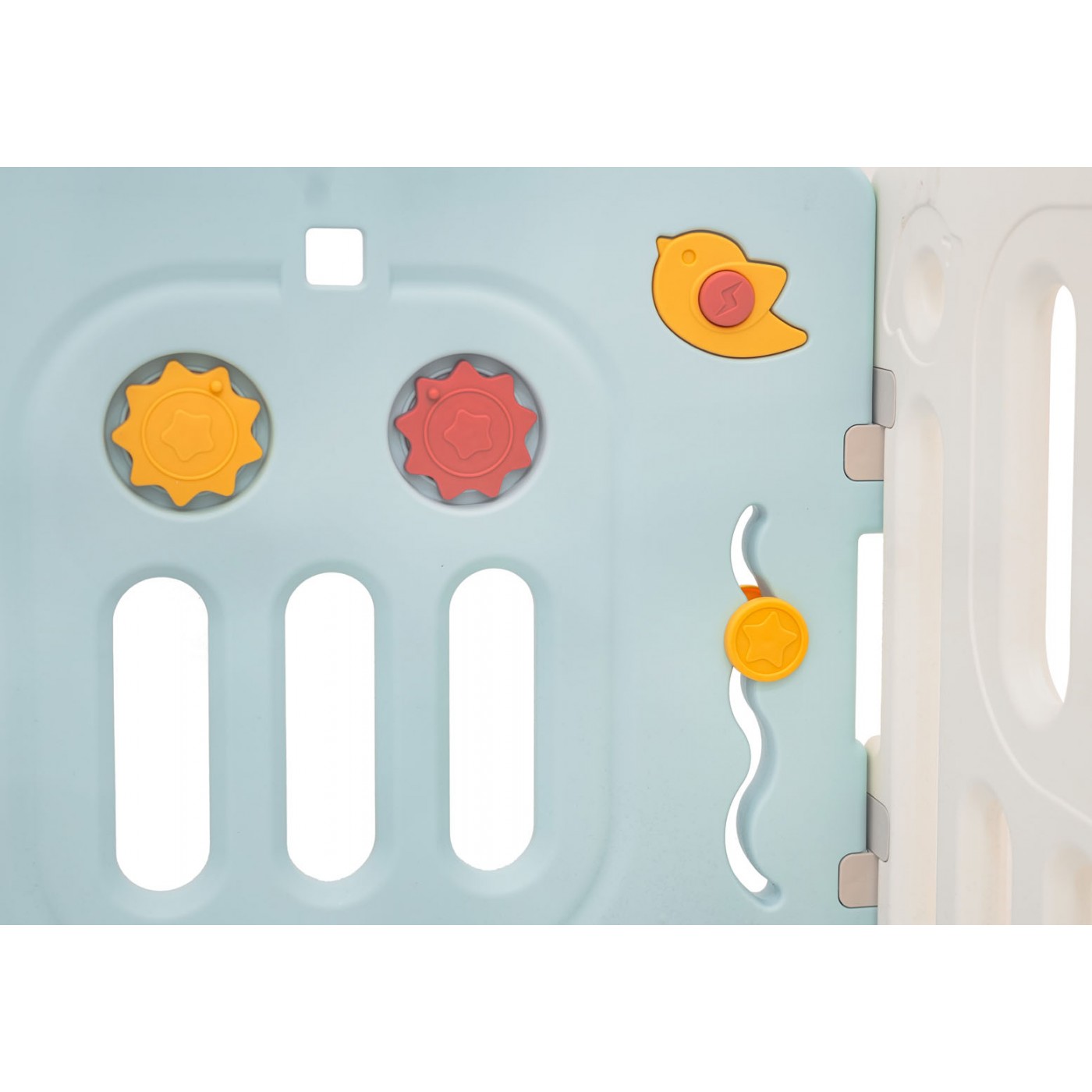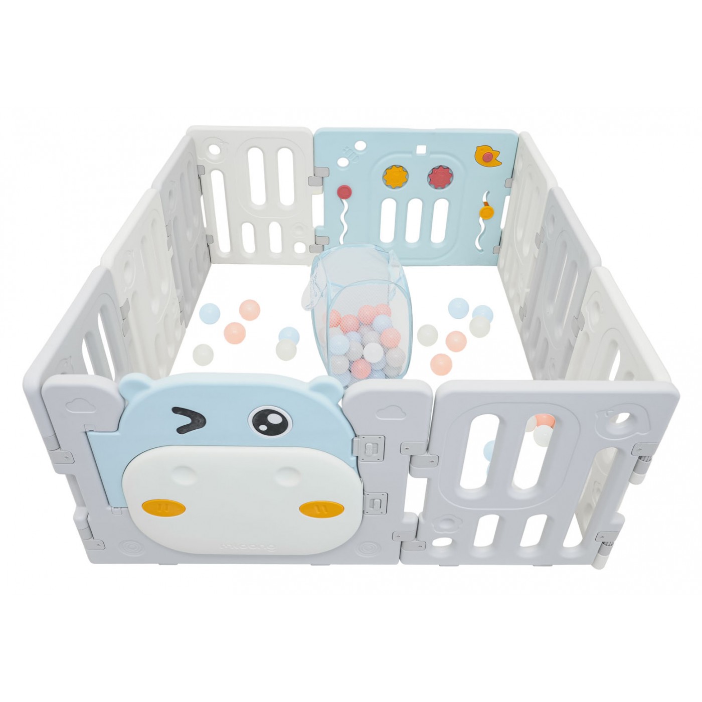 Set Features: - suitable for children over 6 months of age, - possibility of building any size of the playpen according to your preferences, - manipulative elements inside the pen: sliding wheels, gears, whistle in the bird and steering wheel, rotating steering wheel. - made of durable and non-toxic materials, - outside door lock, - non-slip feet, - easy to fold and unfold, - ball basket and balls included. |