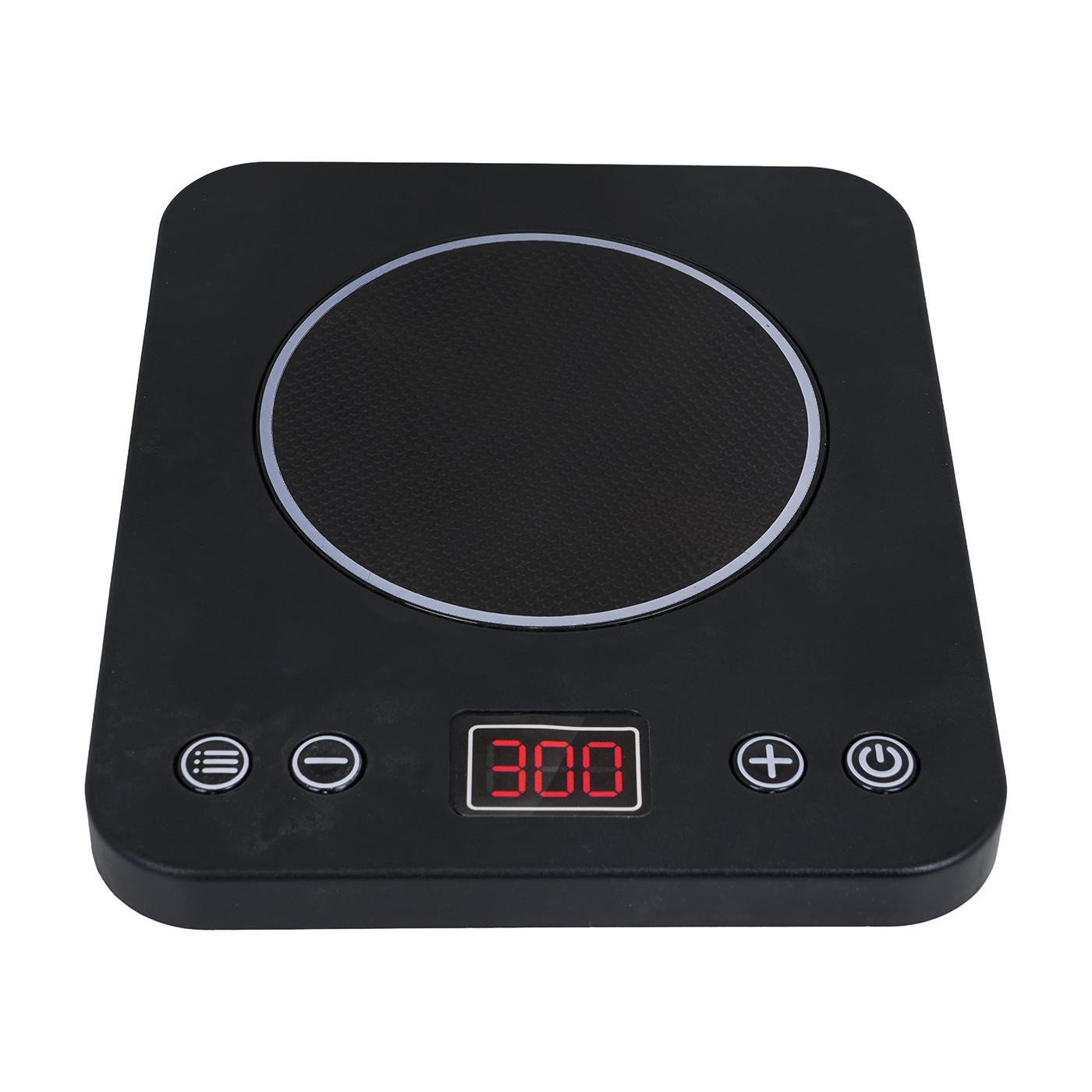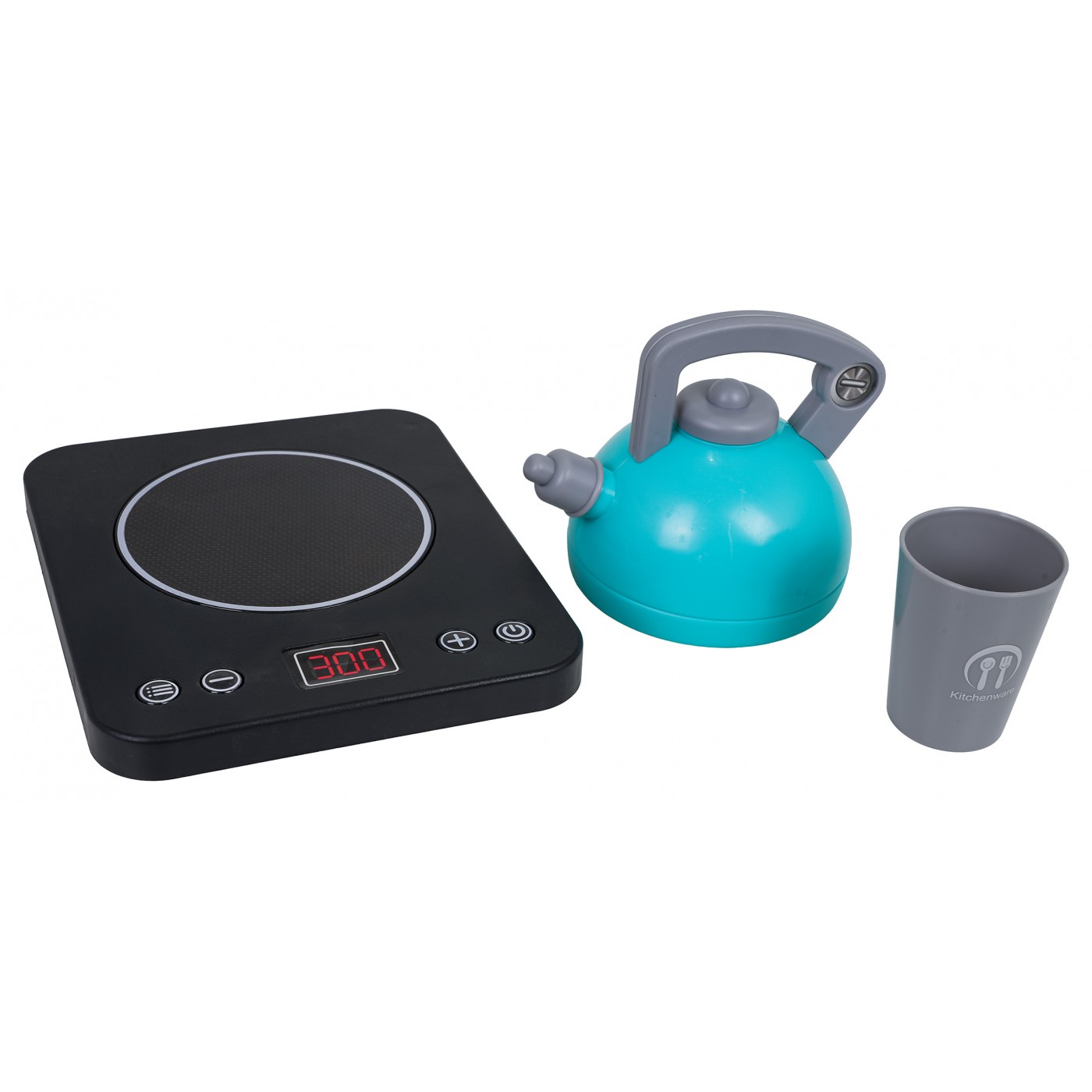 An interactive toy induction cooker and kettle set for children aged three and up. The set is crafted with meticulous attention to detail and uses the highest quality materials. The cooker is powered by 3 x 1.5V AAA batteries (not included) and features sound and light effects. It makes cooking sounds and has an illuminated burner. The set also includes a kettle and a mug.