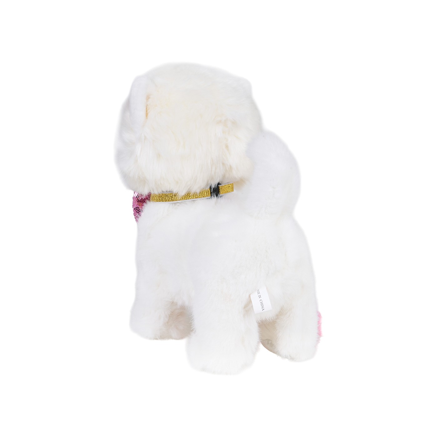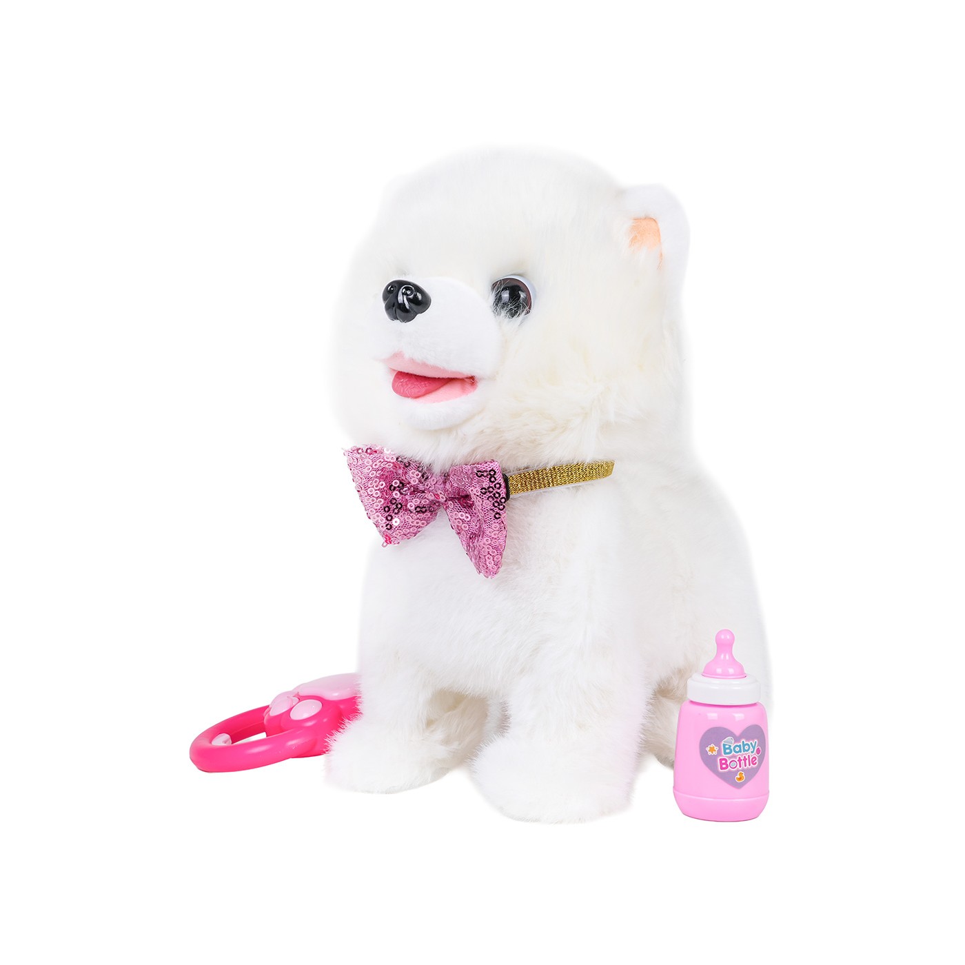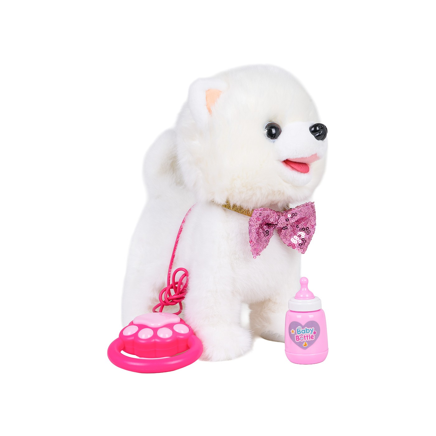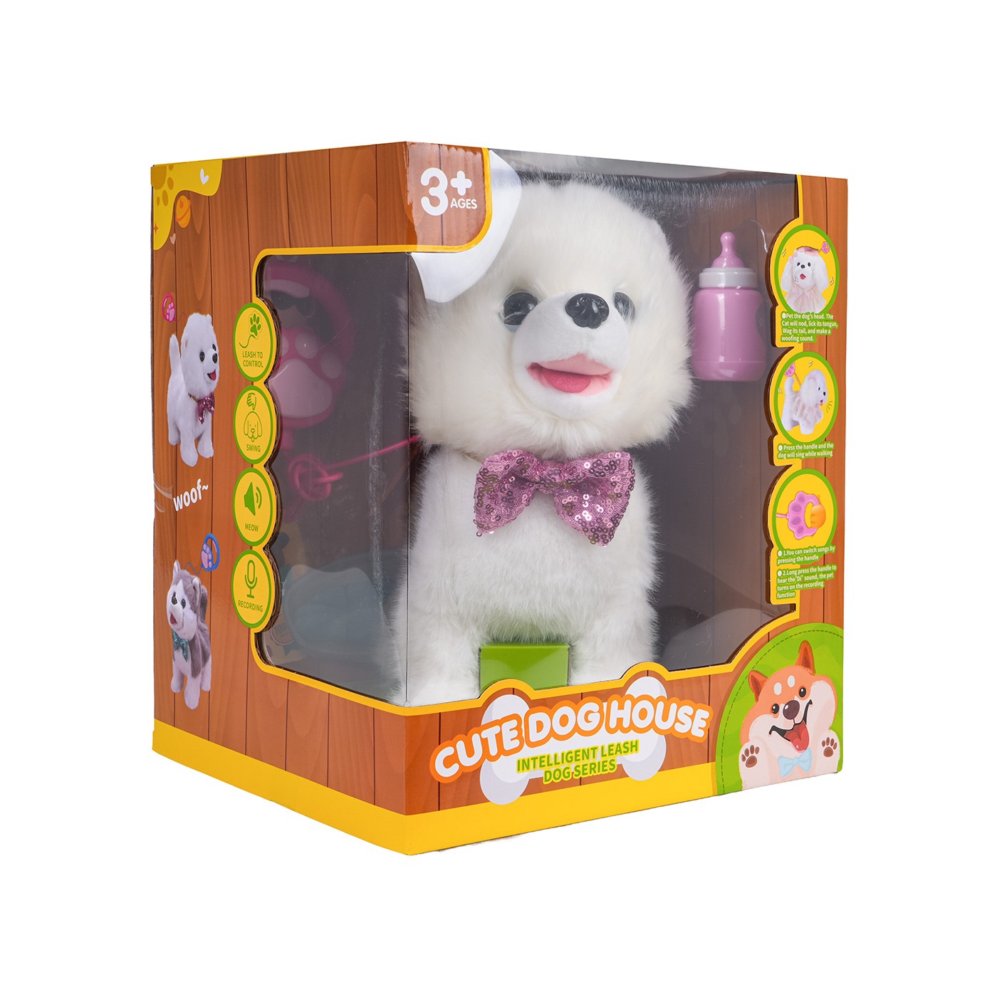 An interactive, sensory white dog for children aged three and up. Made of soft, child-safe material, the dog is perfect for petting and cuddling. The toy looks just like a real pet and features interactive features. Touch the dog's head, and the animal will interact with you. It will nod its head, wag its tail, make barking sounds, lick its tongue, and walk. The dog comes with an interactive leash. A short press on the leash triggers the dog to bark, stick out its tongue, wag its tail, and walk to the rhythm of the music. Pressing and holding the trigger activates the recording and playback functions; the dog will repeat after you. The dog comes with a bottle. The toy is powered by 3 x AA 1.5V batteries (not included).
