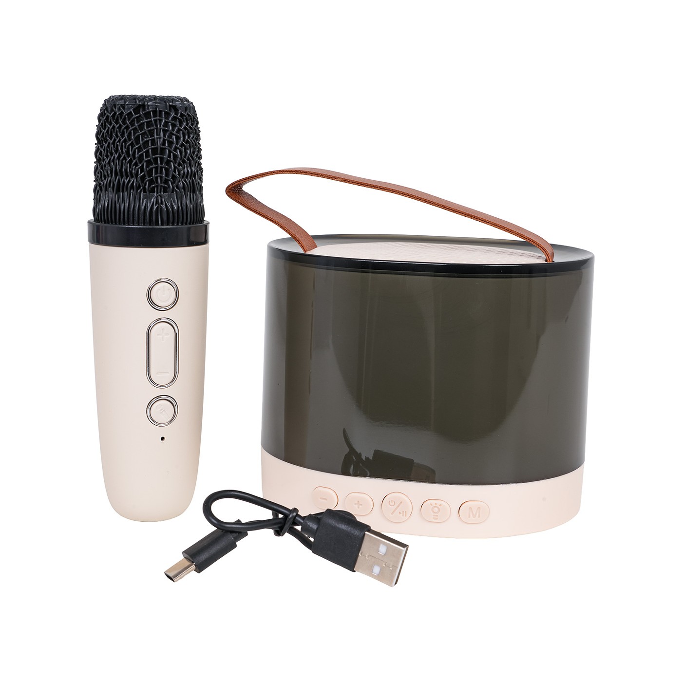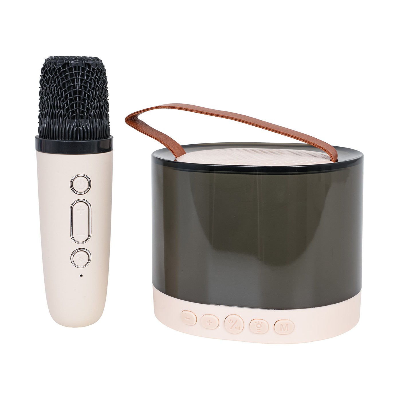 A karaoke microphone and speaker set for children aged three and up, as well as adults. This portable set takes up little space and is lightweight, so you can take it anywhere. Don't let its small size fool you, as this set boasts exceptional sound quality and creates a stunning visual experience with RGB lighting. Advanced MP3 decoding technology delivers clear and powerful sound. The speaker features DSP noise reduction, making the sound louder and fuller. Bluetooth ensures a stable connection. The set is compatible with mobile phones, TVs, tablets, computers, and other devices, as well as various popular apps. The speaker has a 64G TF card slot, headphones, and a Type-C charger. The high-quality leather handle is practical and durable. There are 5 LED lighting effects to choose from, which synchronize with the music, creating an incredible visual experience. A short press of the button on the speaker changes the lighting effects, and holding for two seconds turns off the LEDs. The charge indicator makes it easy to use and the durable housing with IPx3 protection level ensures rain protection and durability.
