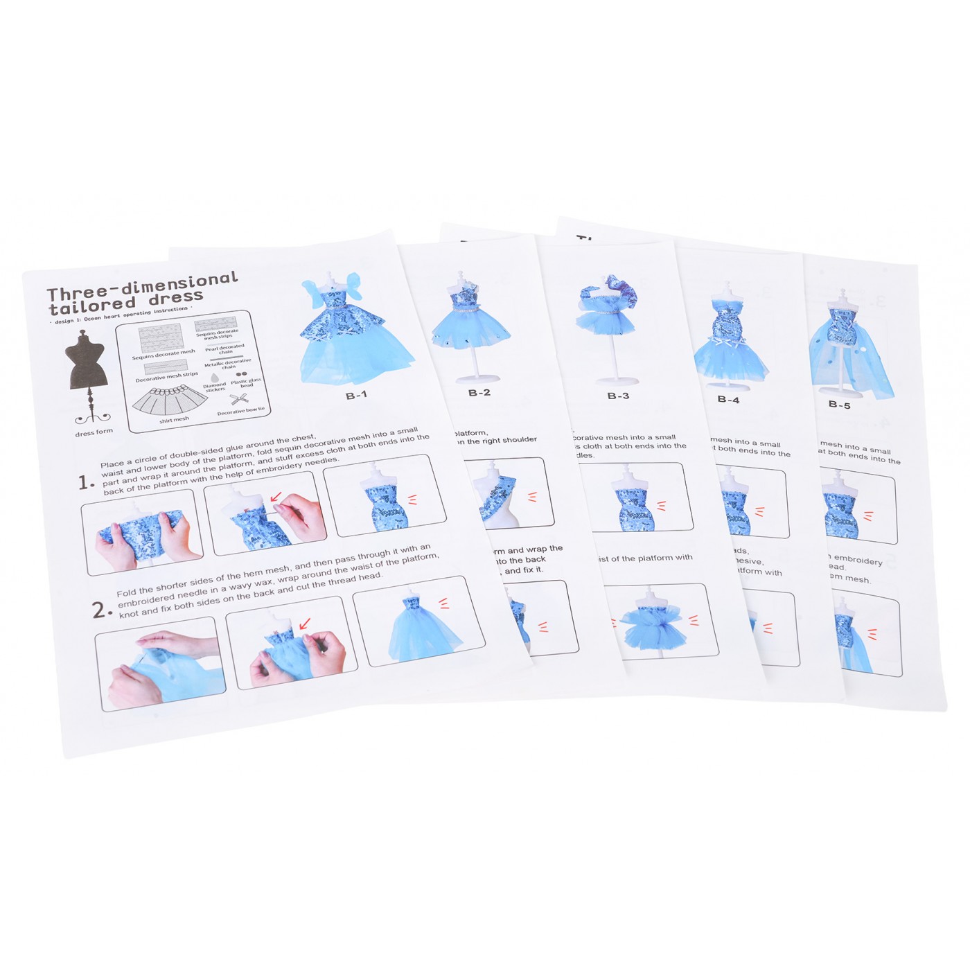 A creative doll dress design kit for children aged eight and up. The kit includes everything you need to design your dream outfit, from start to finish. The kit hones your craft, develops your aesthetic sense, and broadens your horizons. The kit includes five ready-made projects with step-by-step instructions on how to create the outfit, along with mannequins, materials, beads, diamonds, sequins, bows, scissors, thread, needles, spatulas, and tape.