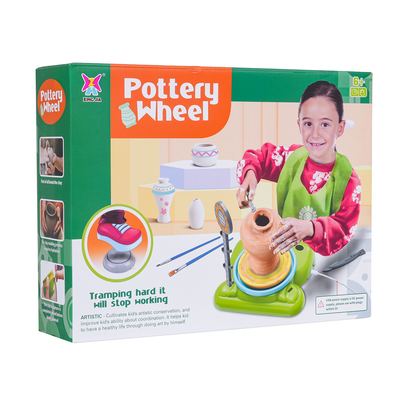 - pottery base with wheel, - 2 x carving tools, - stand with measuring tape, - 6 different colors of paints, - 2 x brush, - 2 x clay, - 10 x anti-slip wheels, - plate, - apron, - Type C cable, - foot for stopping the potter's wheel, - instructions. |