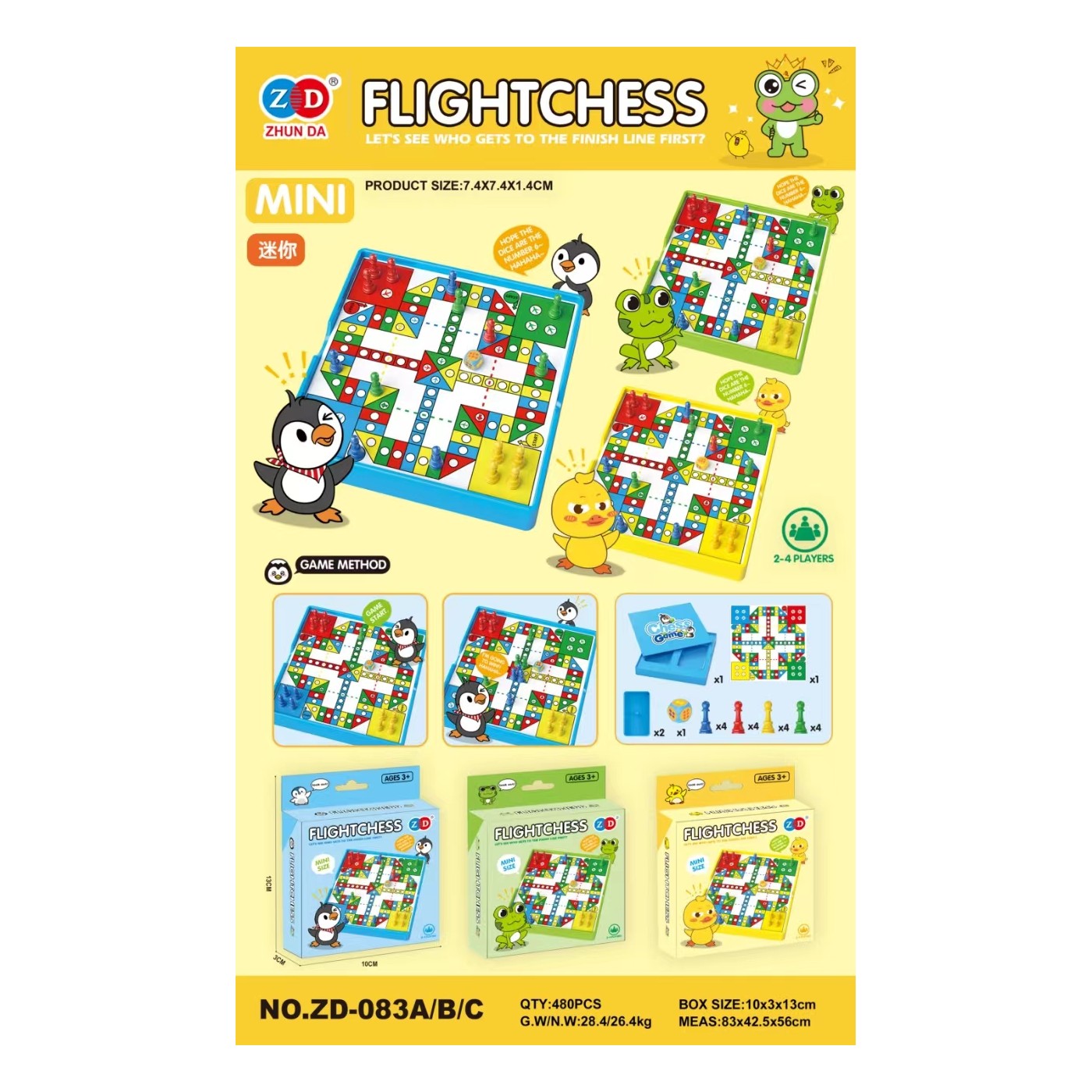 Ludo Duck is a board game for children aged three and up. Its compact size makes it easy to take with you anywhere. Rules of the game: Each player receives four pieces of the same color. Each player then rolls the dice. The player with the highest total begins the game. A piece may be placed on the board only after a 6 is rolled. The first player to roll a six rolls again and moves their piece the number of spaces indicated by the dice. Each time a player rolls a 6, they may introduce another piece into play or move pieces on the board. If a piece lands on another player's piece, the piece is captured and returned to the starting square. If a player lands on a square already occupied by their piece, the pieces form a block and cannot be moved by their opponent. The first player to place all their pieces on the finish line wins.