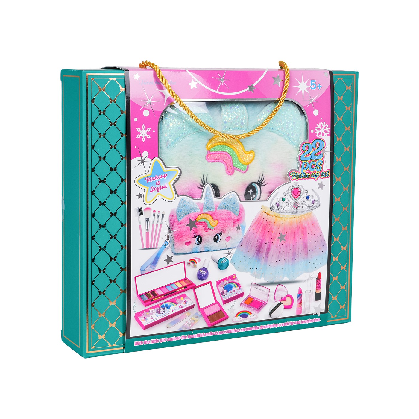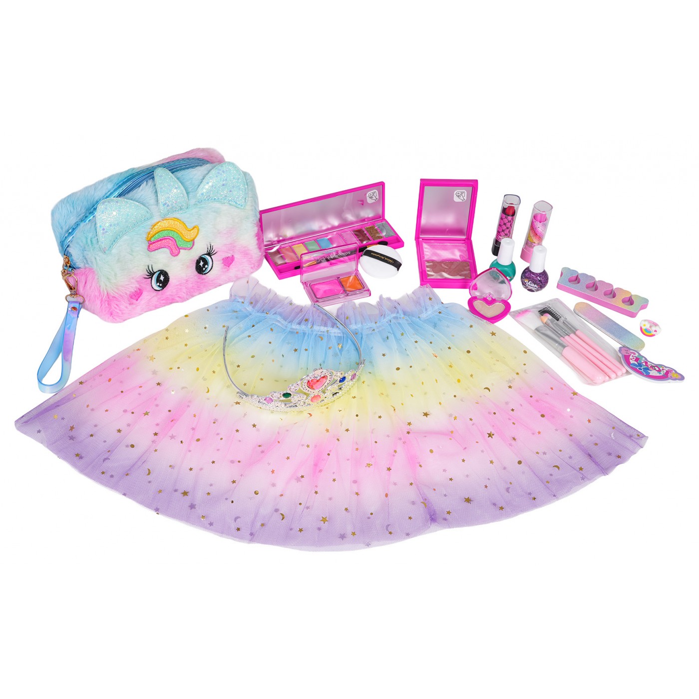 - skirt with elastic band, - unicorn bag, - crown, - a palette with a mirror, seven eyeshadows and three glitter lip glosses and a double-sided brush, - 2 x lipstick, - palette with a mirror and two shadows, - a palette with two lip glosses, - round heart with shadows, - 2 x nail polish, - makeup removal sponge, - finger separator, - 2 x nail files, - ring, - a set of four makeup brushes and a double-sided comb, - colorful packaging, perfect for a gift. |