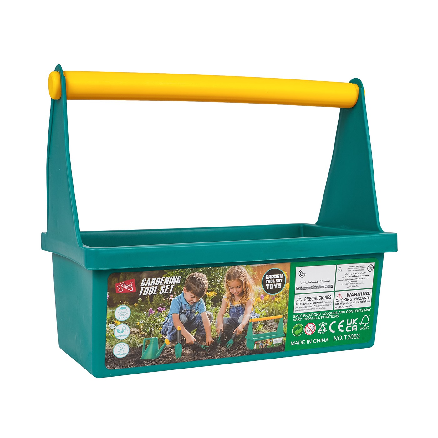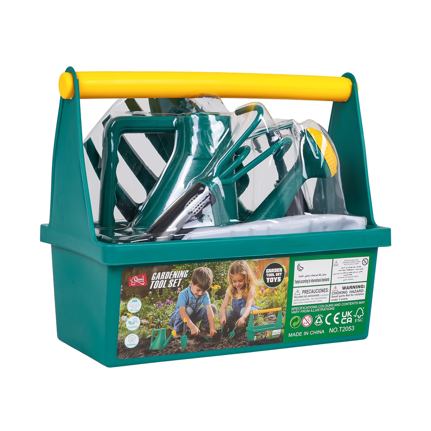 A little gardener's set for children aged three and up. The set is crafted with attention to detail; the toy tools resemble real ones but are safe for children. The set includes a shovel, fork, watering can, trowel, and rake. All tools are packaged in a carrying case. The set is made of high-quality plastic and is ideal for both boys and girls.