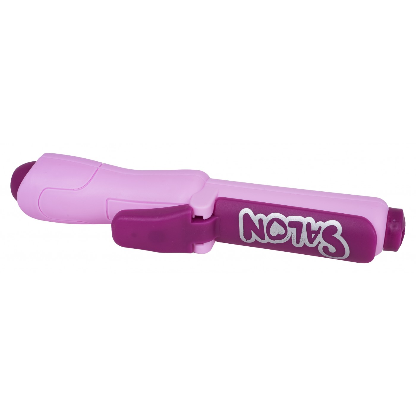 A well-equipped little hairdresser's set for children aged three and up. Crafted from high-quality plastic, with meticulous attention to detail, the set includes a hairdryer with interchangeable attachments, a hair straightener, two clips, a comb, two types of scissors, a brush, a hair product bottle, and two hair rollers. All the set's components fit neatly into a pink eco-leather hairdressing bag with a strap. The straightener is powered by 2 x AG13 batteries (included), while the hairdryer is powered by 2 x AAA 1.5V batteries (not included). The straightener features a backlight, and the hairdryer makes drying sounds and has a gentle airflow.