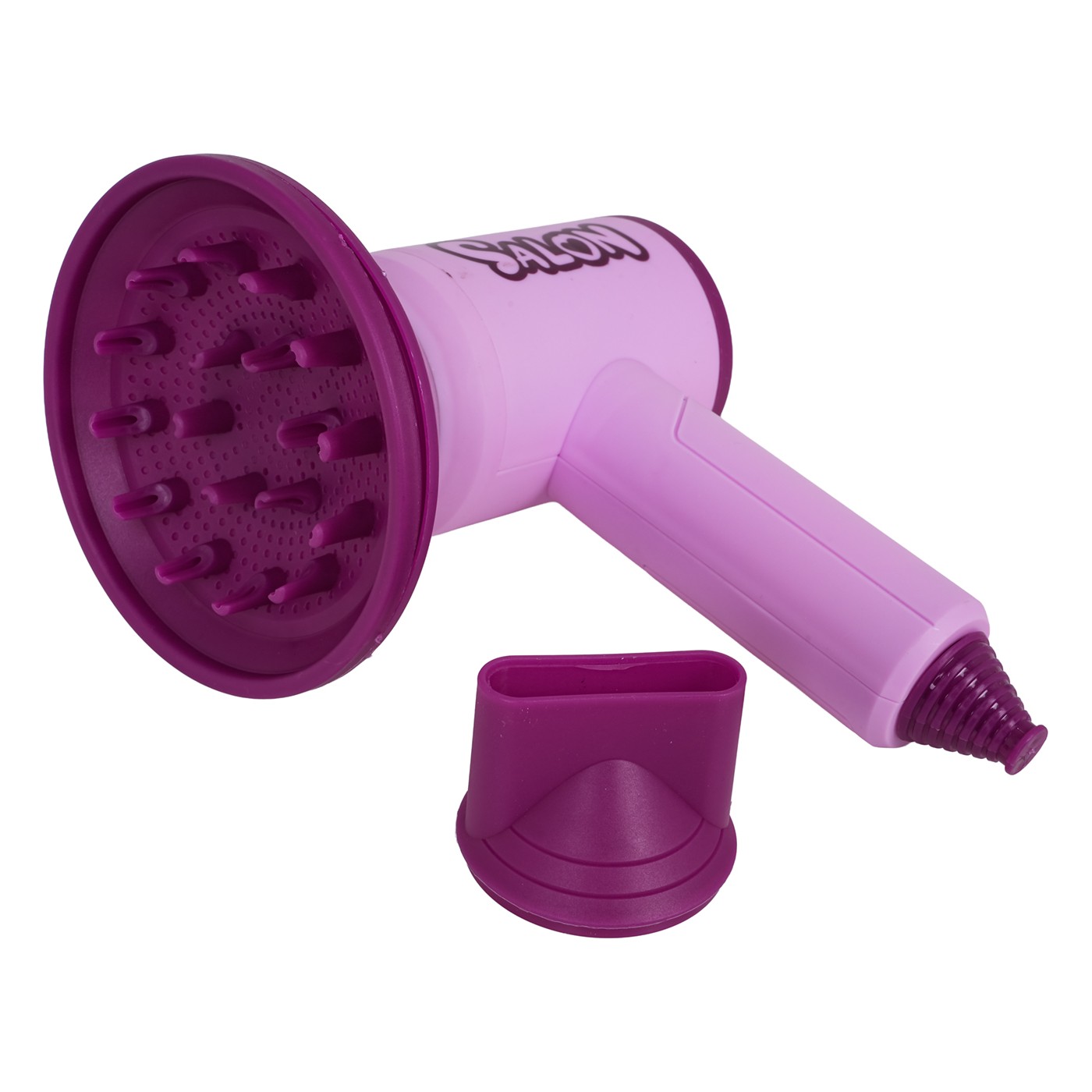 Features: - set suitable for children from three years of age, - made of the best quality plastic, - richly equipped set, - hairdryer with replaceable attachments: diffuser and concentrate, - the dryer makes a drying sound and has a fan, - hair straightener with light function, - hairdressing bag included. |
