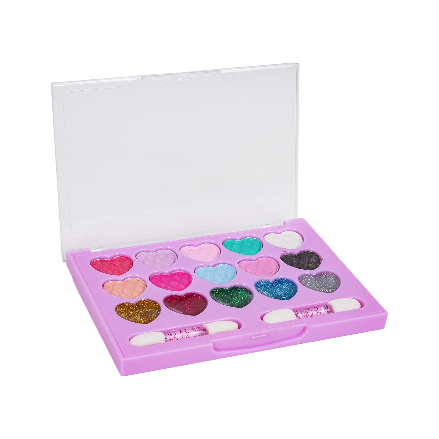 - eyeshadow palette and brushes, - 3 x nail polish, - lip gloss in a tube, - a set of 5 different makeup brushes, - a palette with artificial nails and a file, - template with nail stickers, - 2 x lipstick, - 2 x glitter, - finger separator, - bracelet, - a ring with a crown and lip gloss inside, - pompom for the bag. |