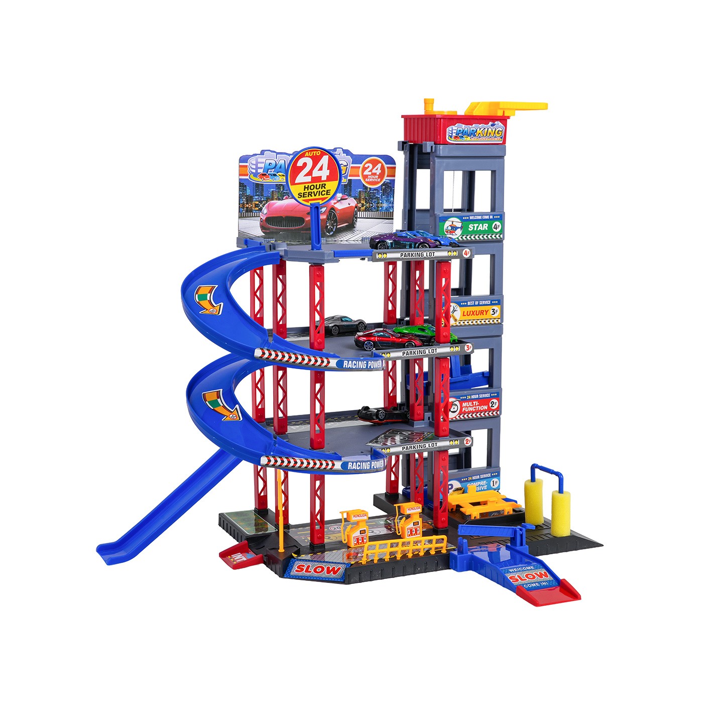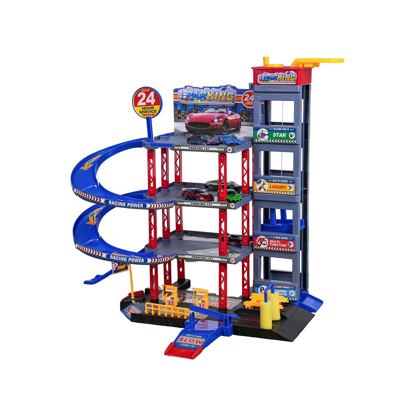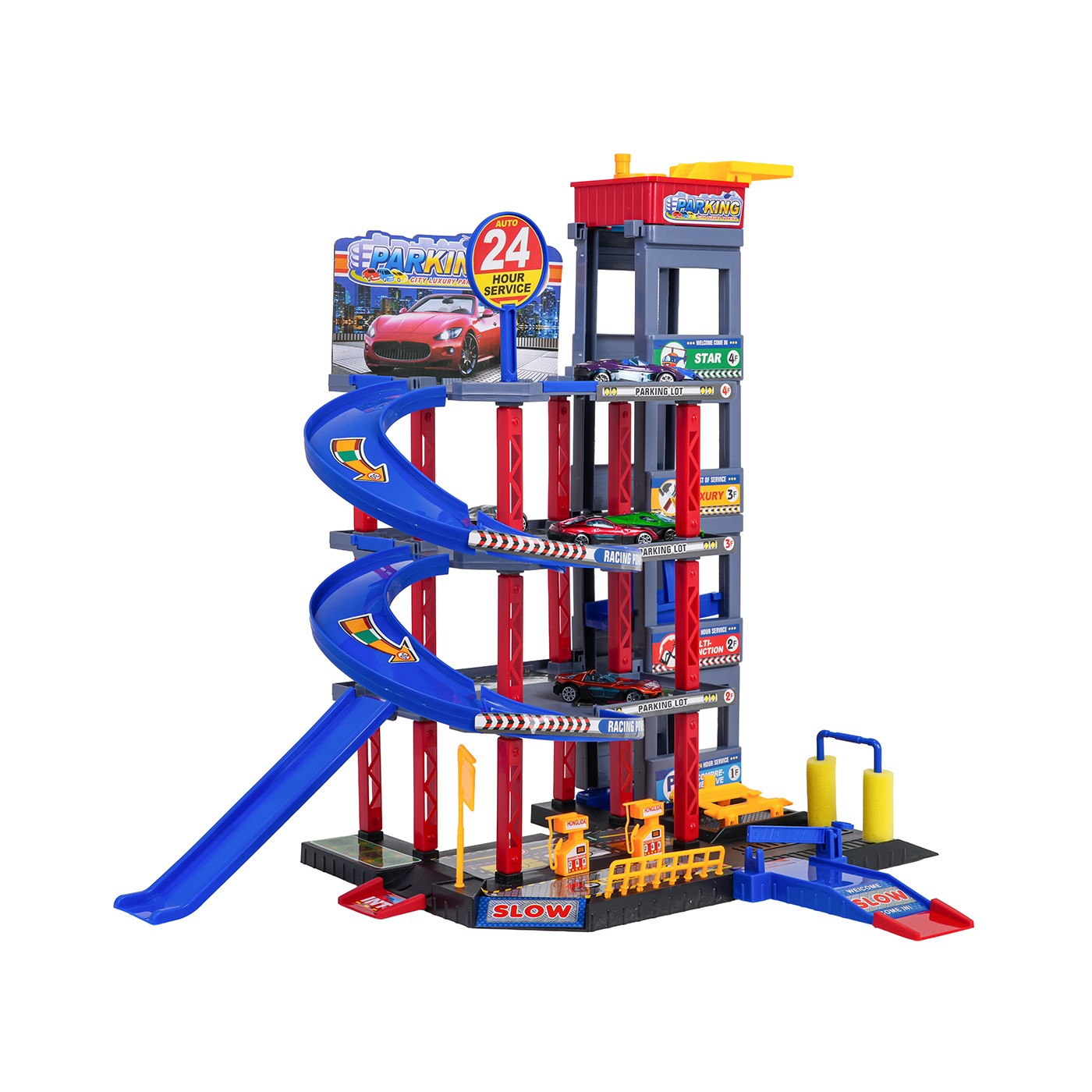 A large interactive parking lot with an elevator, a station, car slides, and a playmat with roads is perfect for children aged three and up. The parking lot has multiple levels, accessible via an elevator. Each level is connected to a different slide for the cars. The multi-level parking lot features parking spaces, a gas station, a car lift, a car wash, and a helipad. The elevator is operated manually (with a crank). The parking lot set also includes a felt playmat with roads and up to six cars with ridemats.