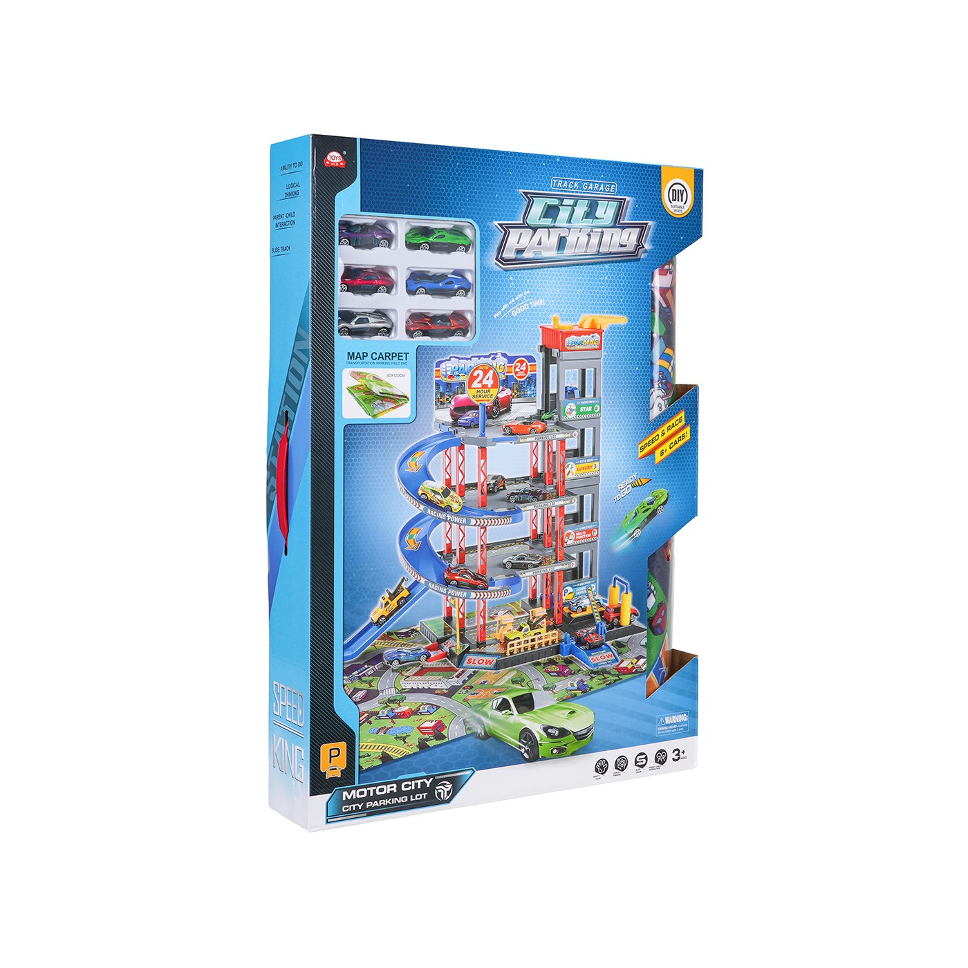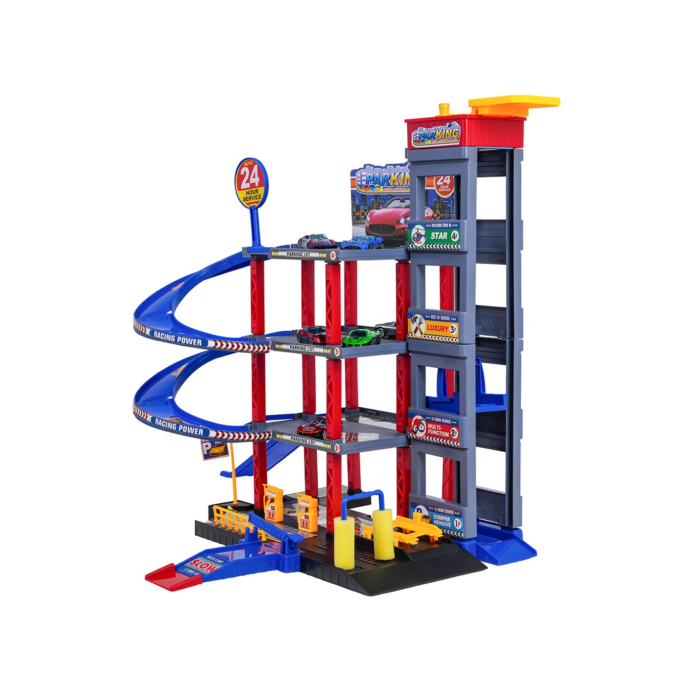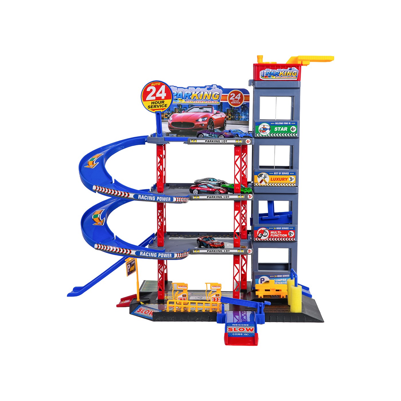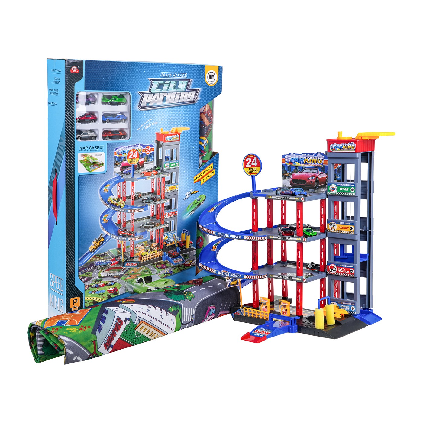 A large interactive parking lot with an elevator, a station, car slides, and a playmat with roads is perfect for children aged three and up. The parking lot has multiple levels, accessible via an elevator. Each level is connected to a different slide for the cars. The multi-level parking lot features parking spaces, a gas station, a car lift, a car wash, and a helipad. The elevator is operated manually (with a crank). The parking lot set also includes a felt playmat with roads and up to six cars with ridemats.
