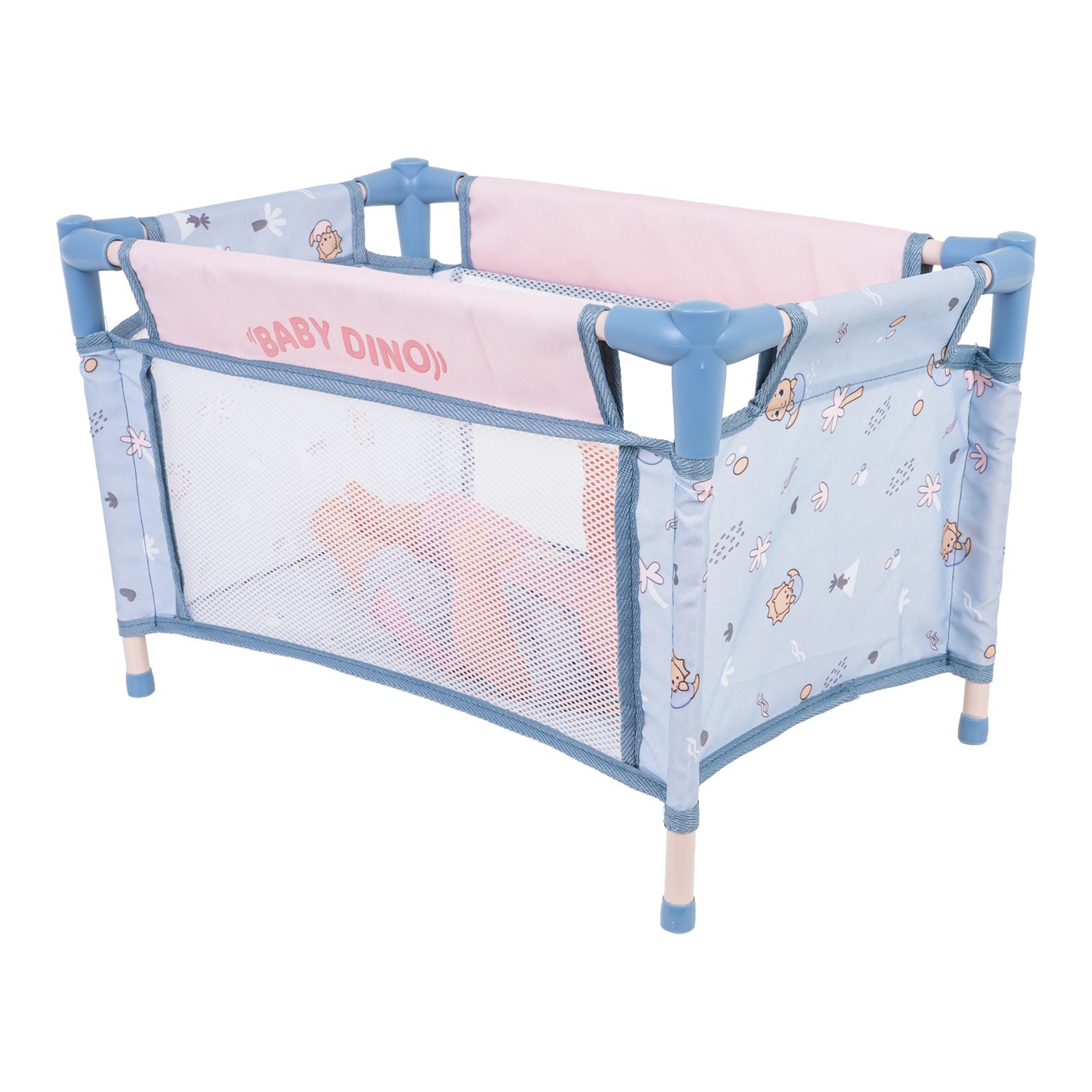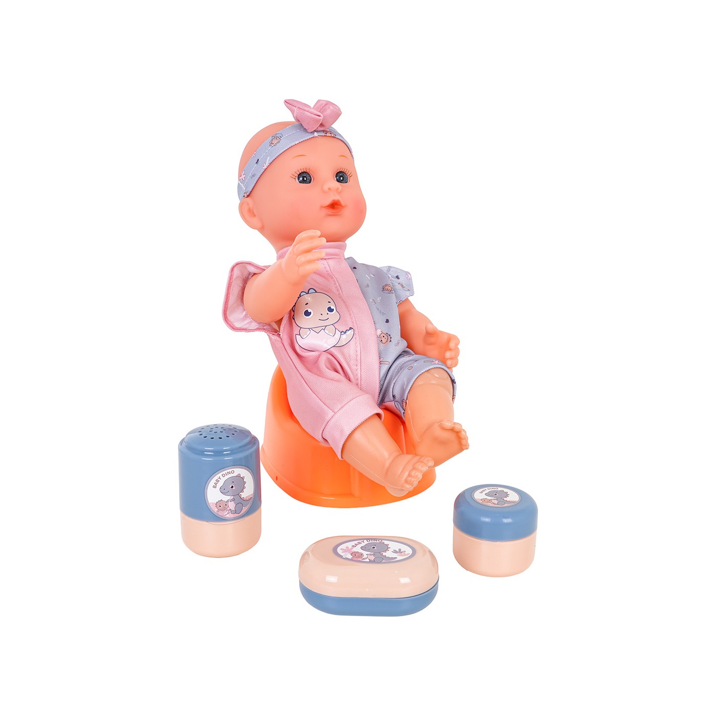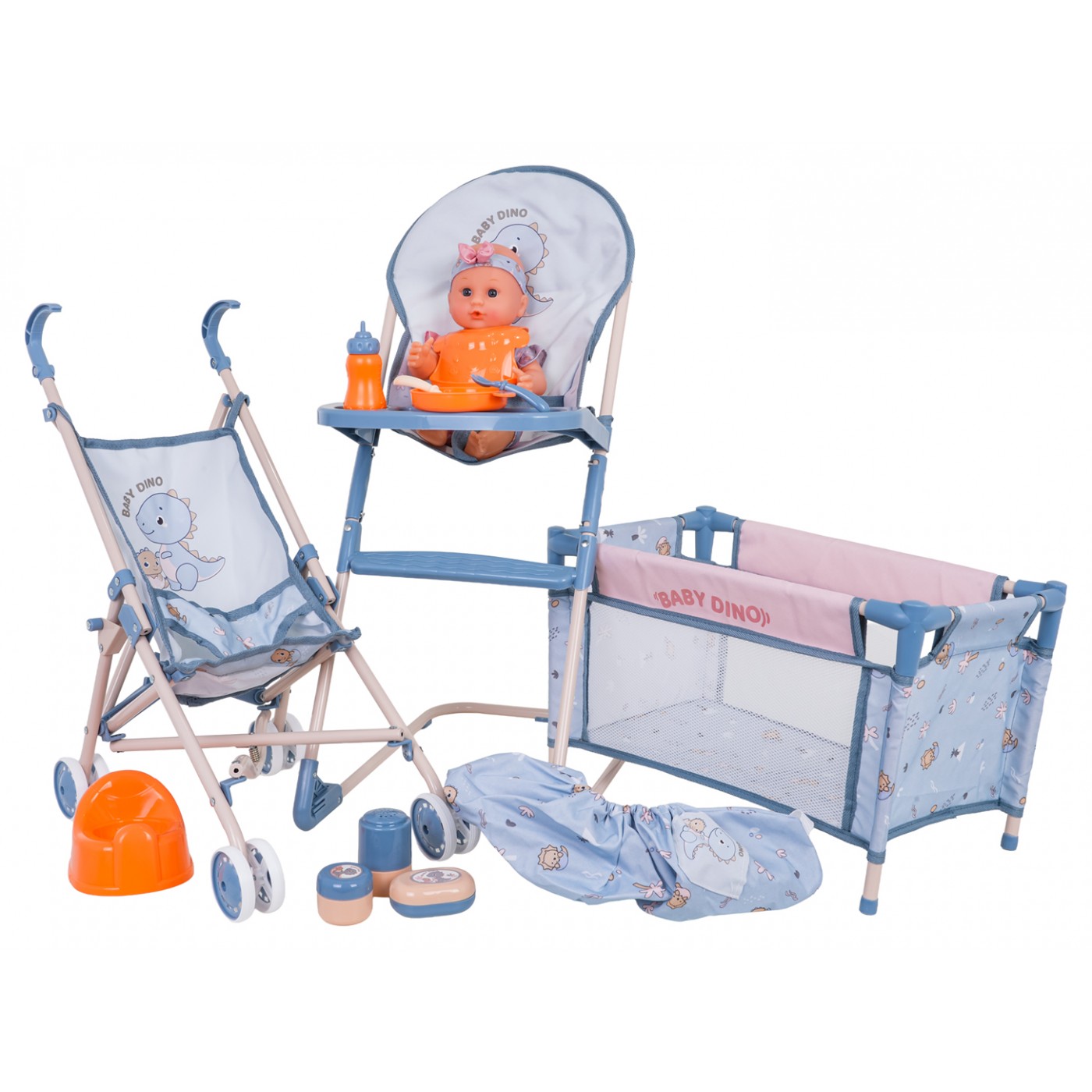 - doll, - travel cot, - stroller, - feeding chair, - doll carrier, - potty, - plate, - spoon, fork, - bottle, - ointment container, - powder container, - soap dish, - bib. |