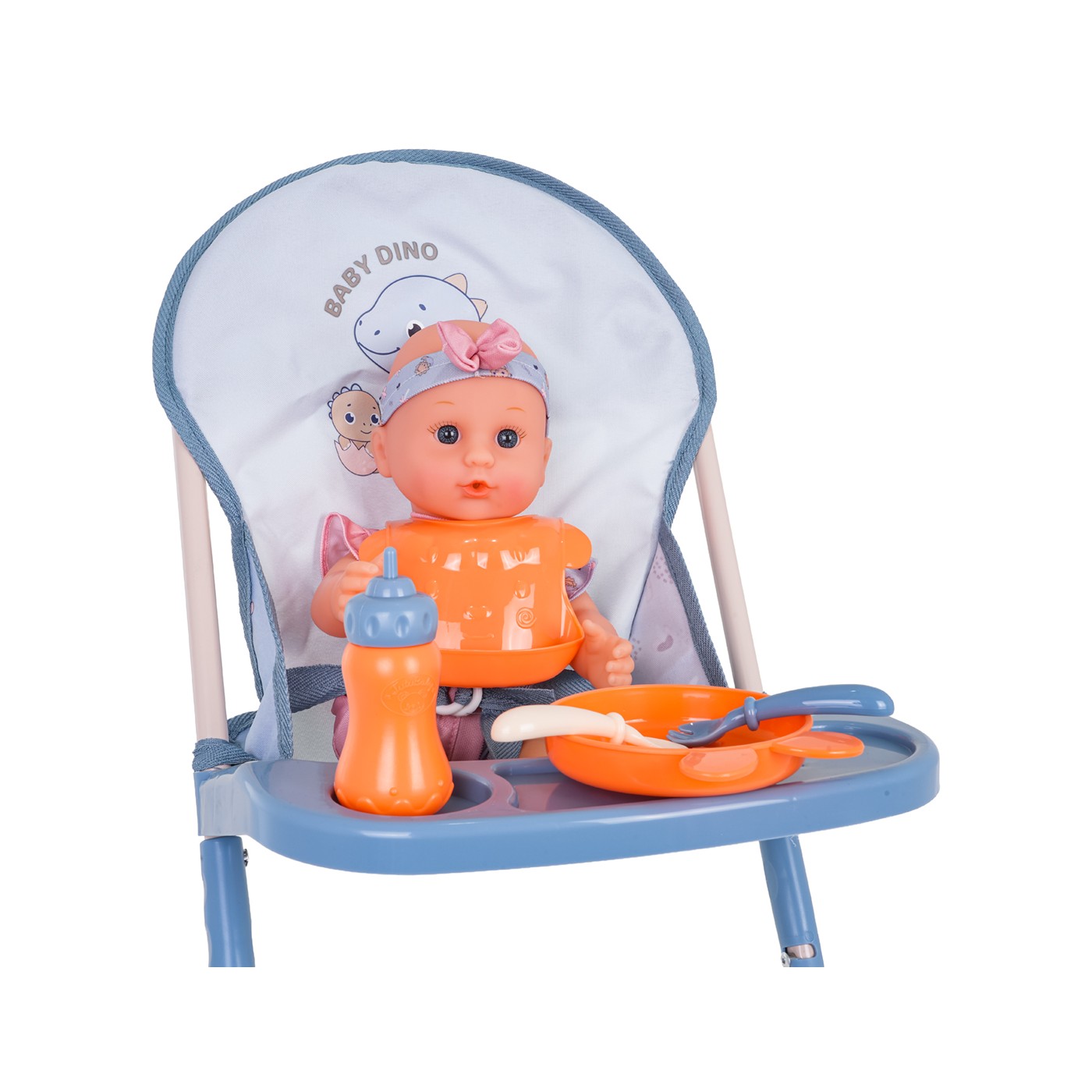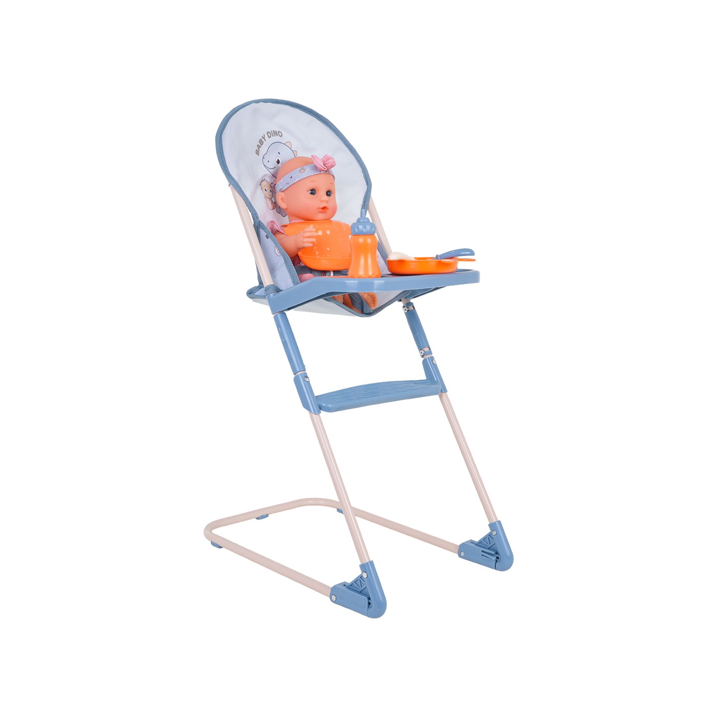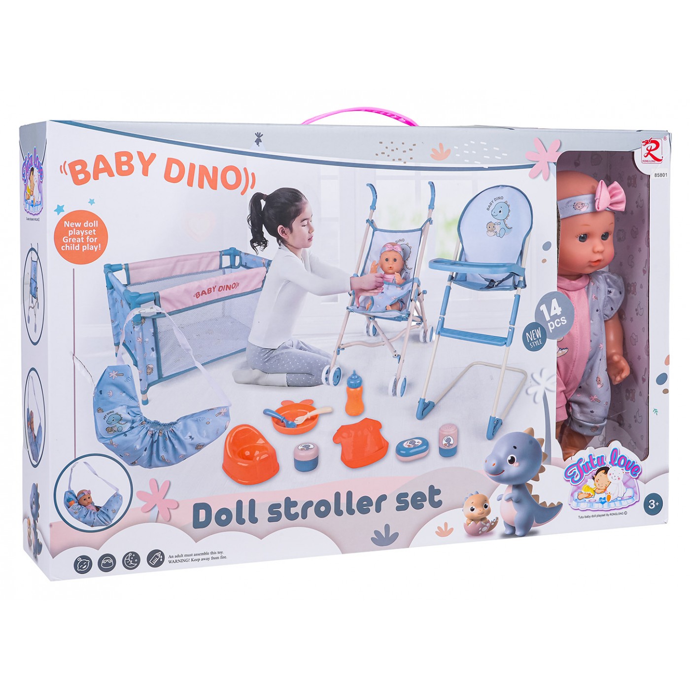 A richly equipped doll and accessories set for children aged three and up. The set consists of 14 pieces made of the highest quality materials in vibrant colors. The beautiful doll is dressed in a colorful romper and has a headband with a bow. The doll has movable arms and legs. The set also includes a travel cot, stroller, highchair, potty, bottle, and feeding and care accessories.