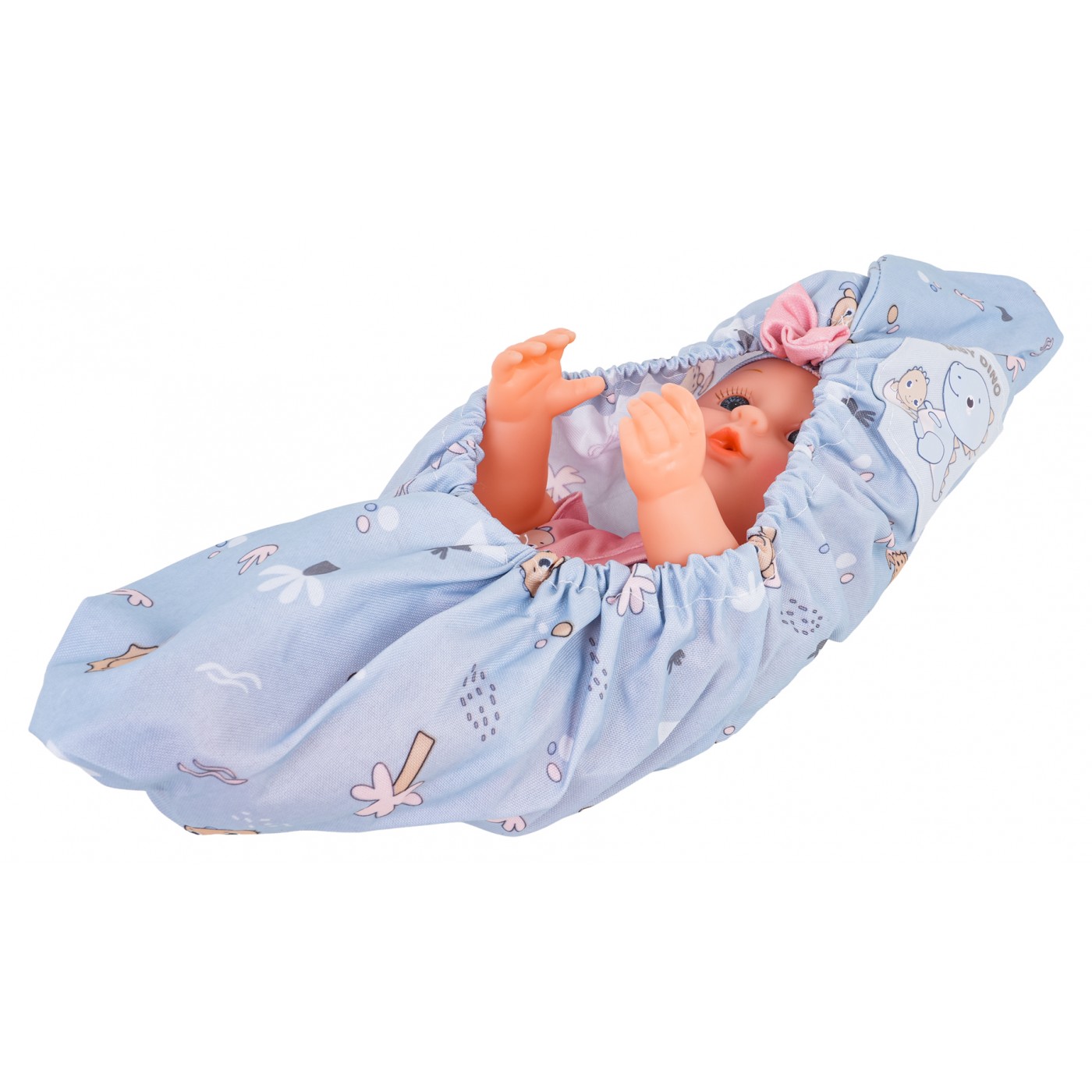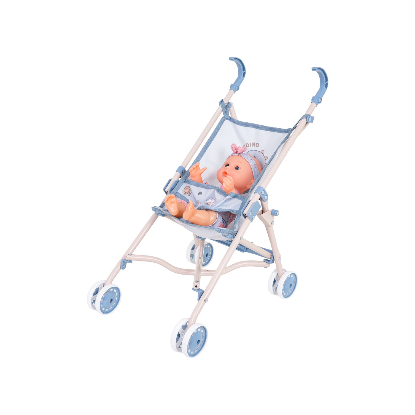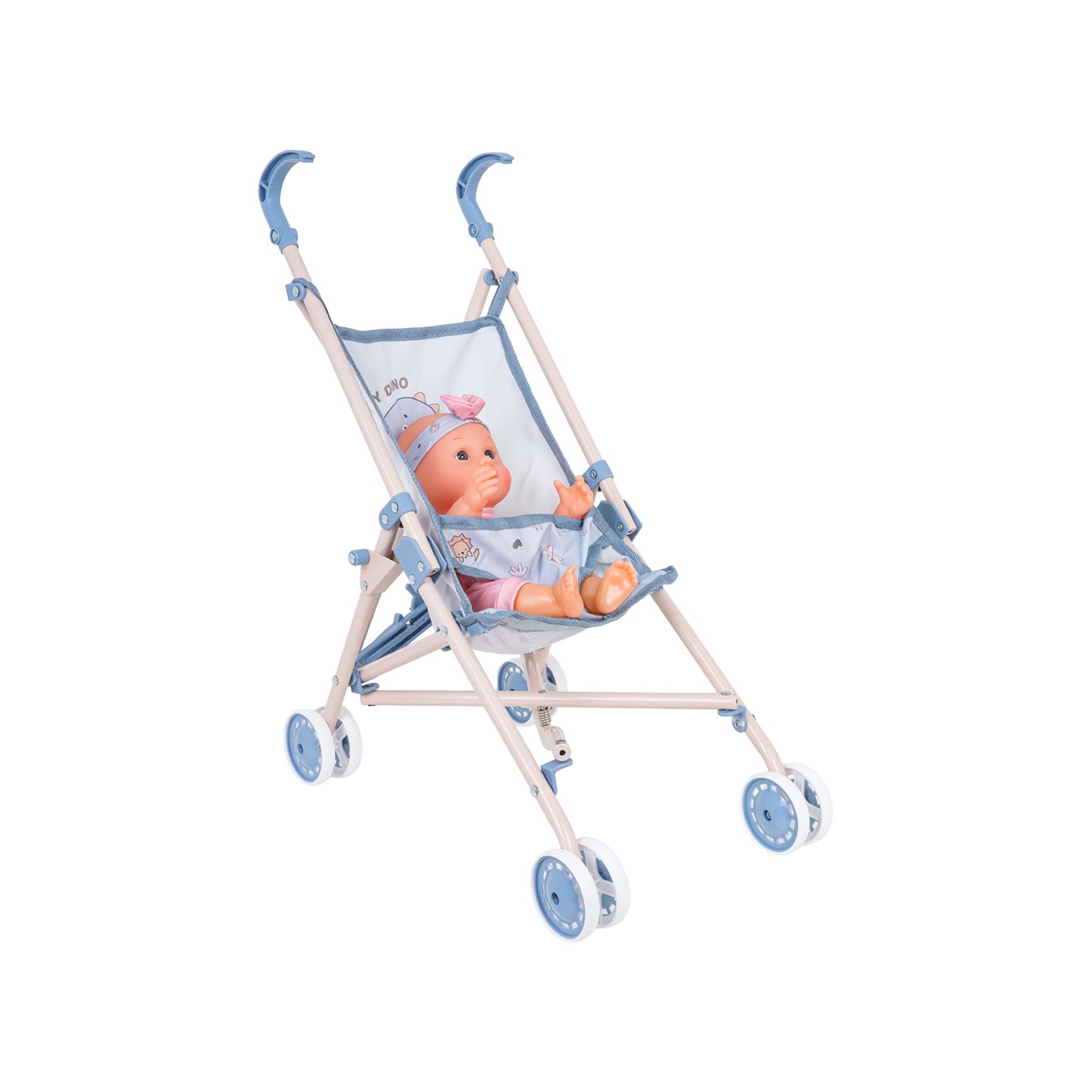 A richly equipped doll and accessories set for children aged three and up. The set consists of 14 pieces made of the highest quality materials in vibrant colors. The beautiful doll is dressed in a colorful romper and has a headband with a bow. The doll has movable arms and legs. The set also includes a travel cot, stroller, highchair, potty, bottle, and feeding and care accessories.