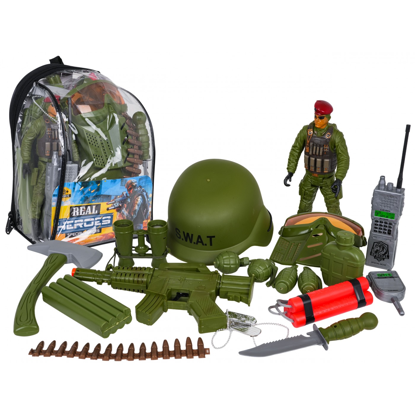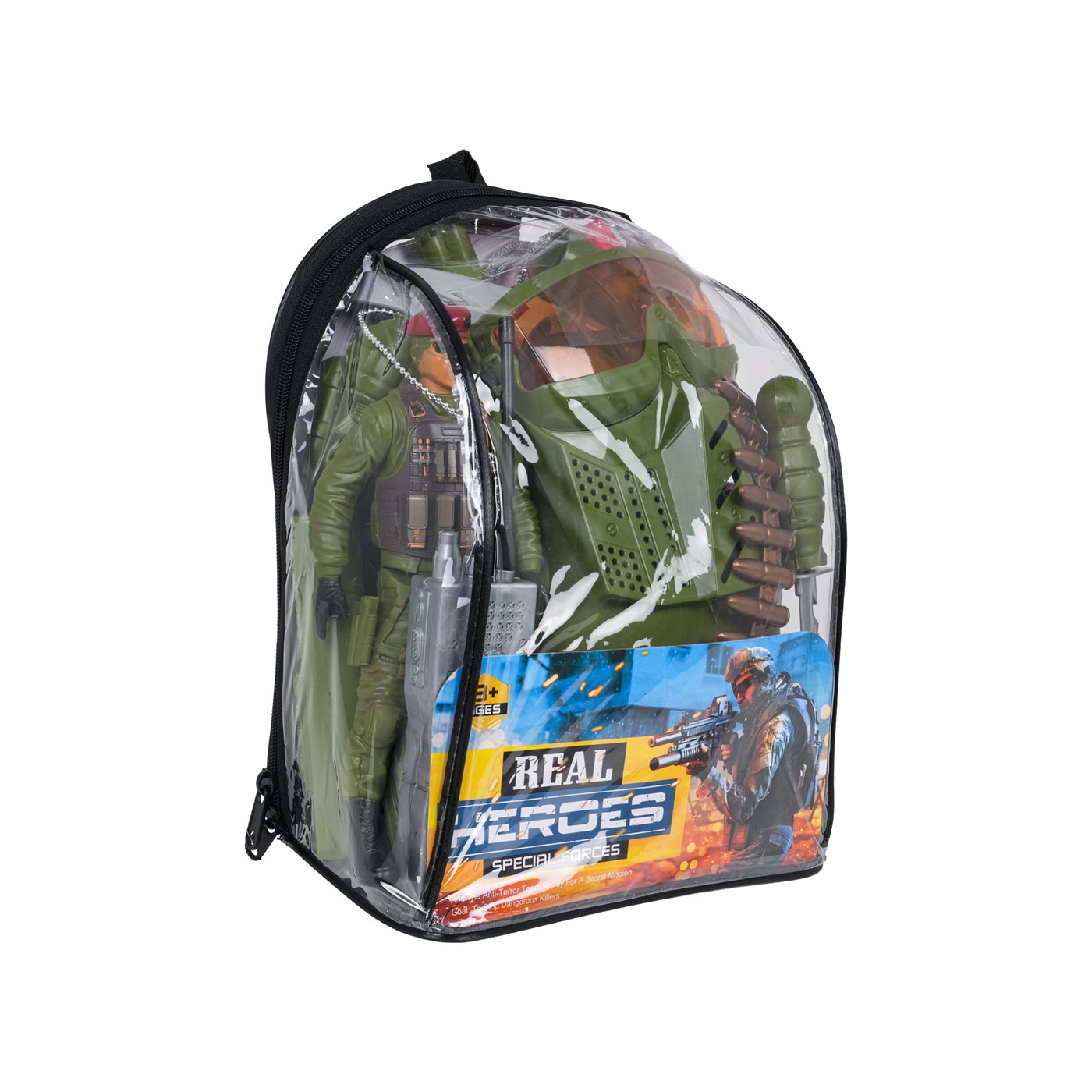 - transparent backpack, - helmet, - glasses with a mask, - knife, - walkie-talkie, - whistle, - water canteen, - telephone, - axe, - binoculars, - rifle with the sound of a shot, - belt with bullets, - 4 grenades - a soldier figure with movable arms and legs, - explosive, - dog tag. |
