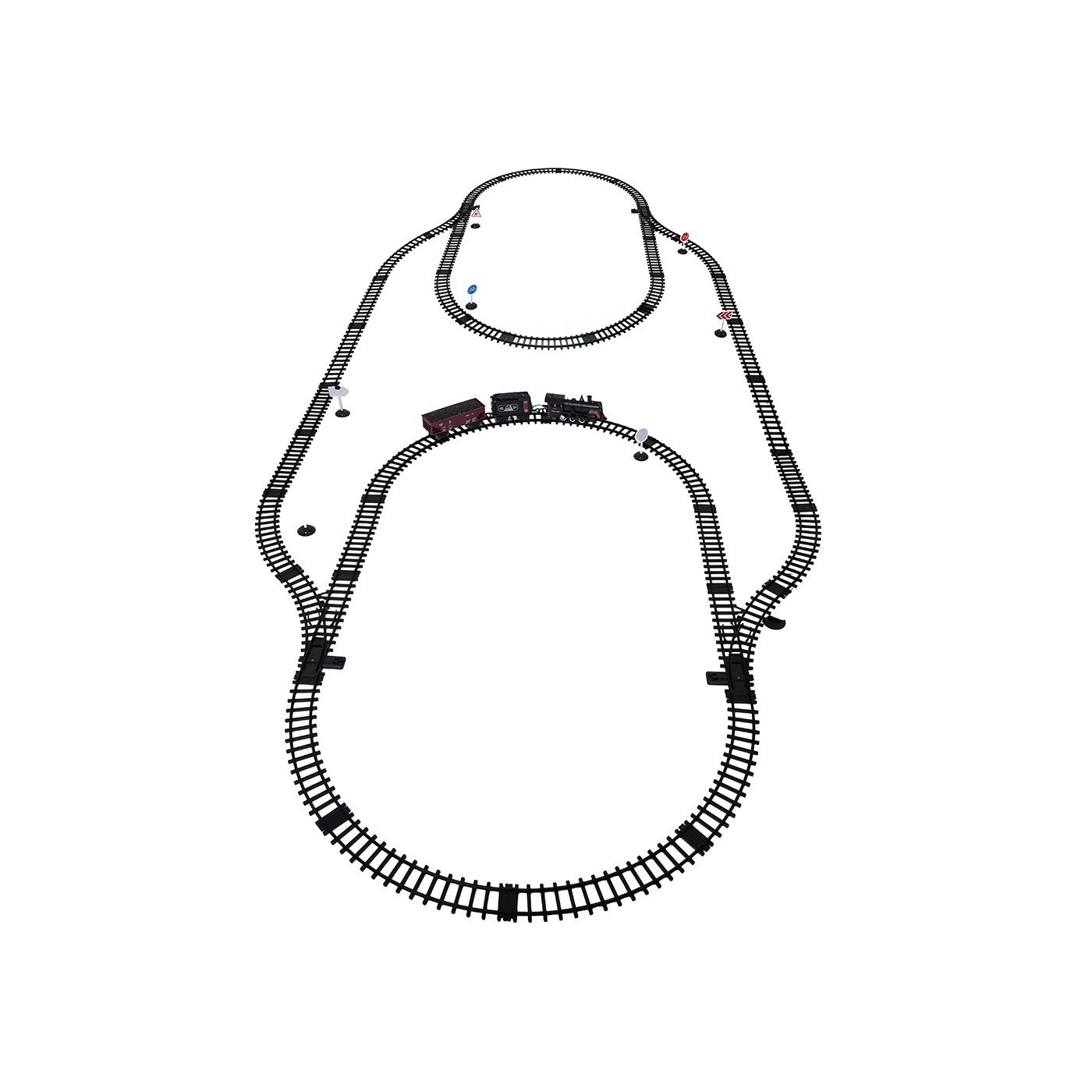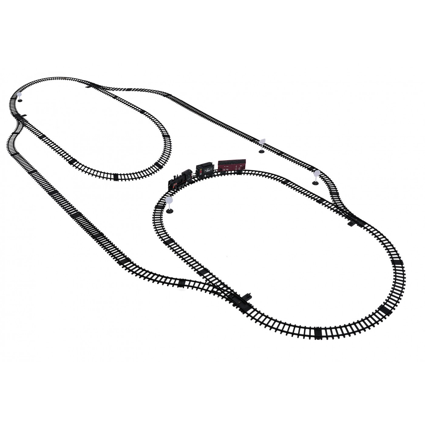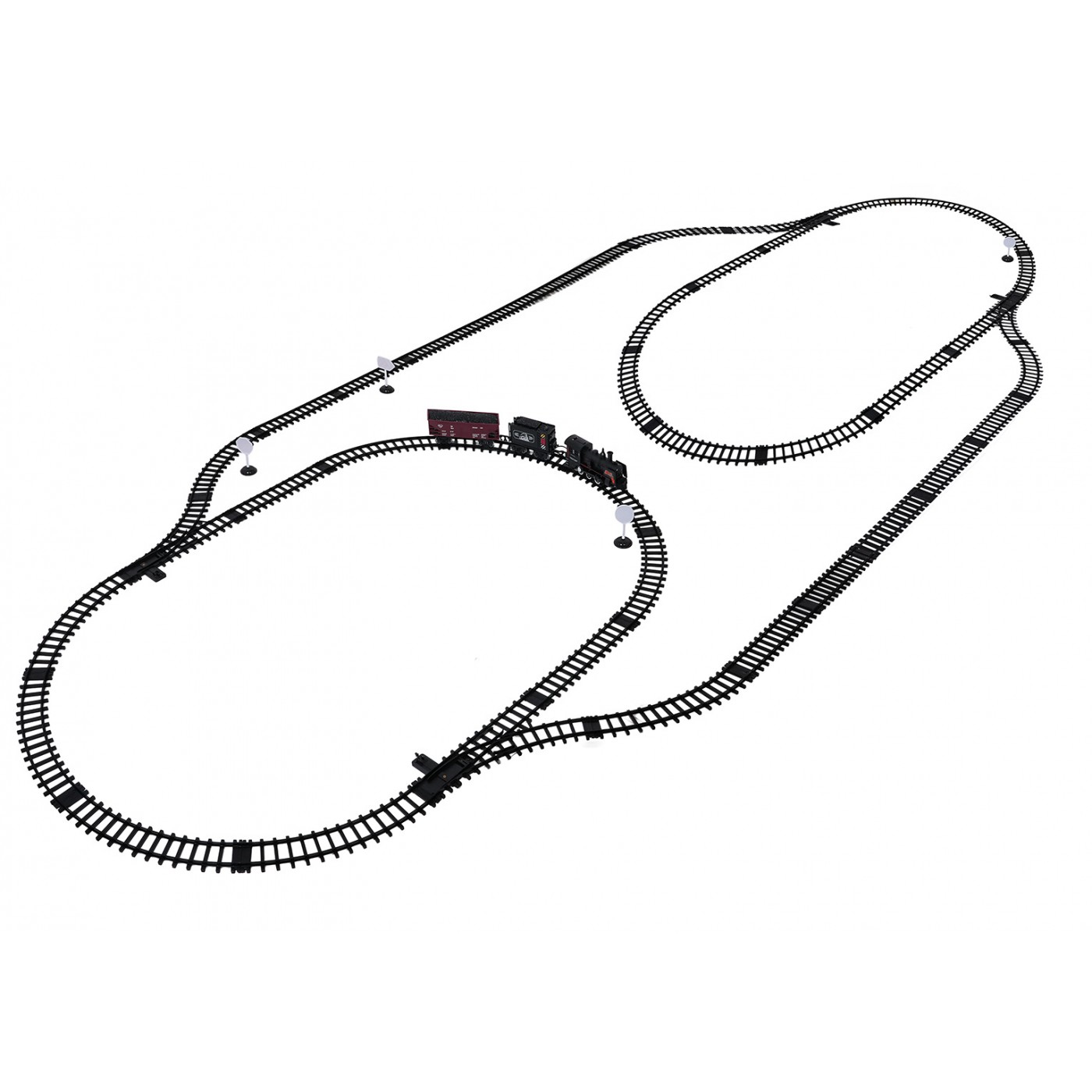 This retro train set with smoke, light, and sound features is perfect for children aged three and up. The toy is powered by 4 x 1.5V AA batteries (not included). While driving, the locomotive emits smoke from its chimney. After topping it up with water (water pipette included), the front headlight illuminates and you can hear the sounds of the train. The tracks are durable, safe, and easy to connect.
