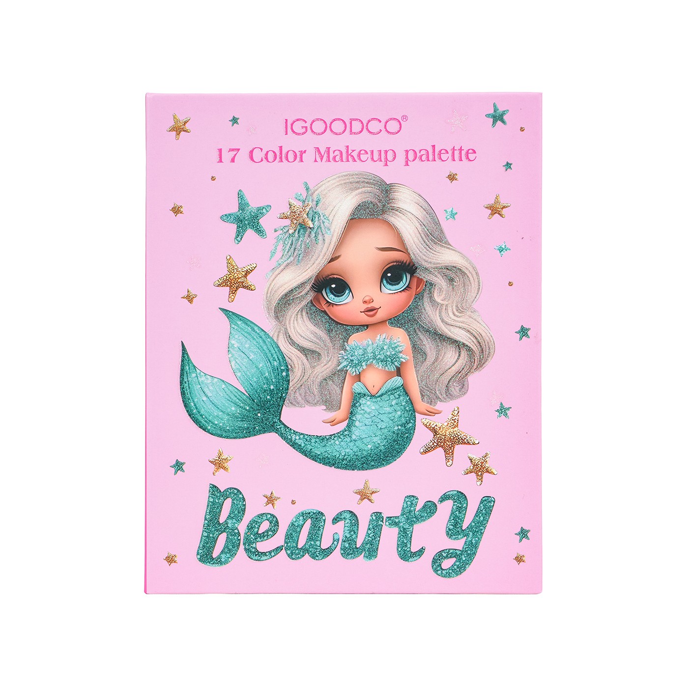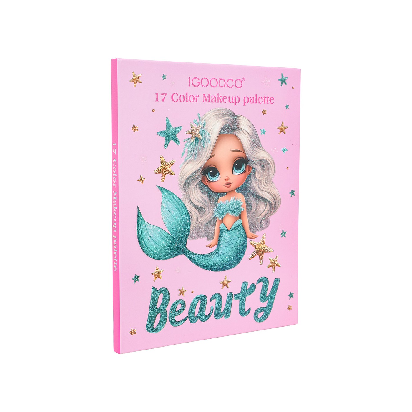 - a palette with an image of a mermaid and a mirror, - brush, - 17 cosmetics: 14 eye shadows, 3 lip glosses. |