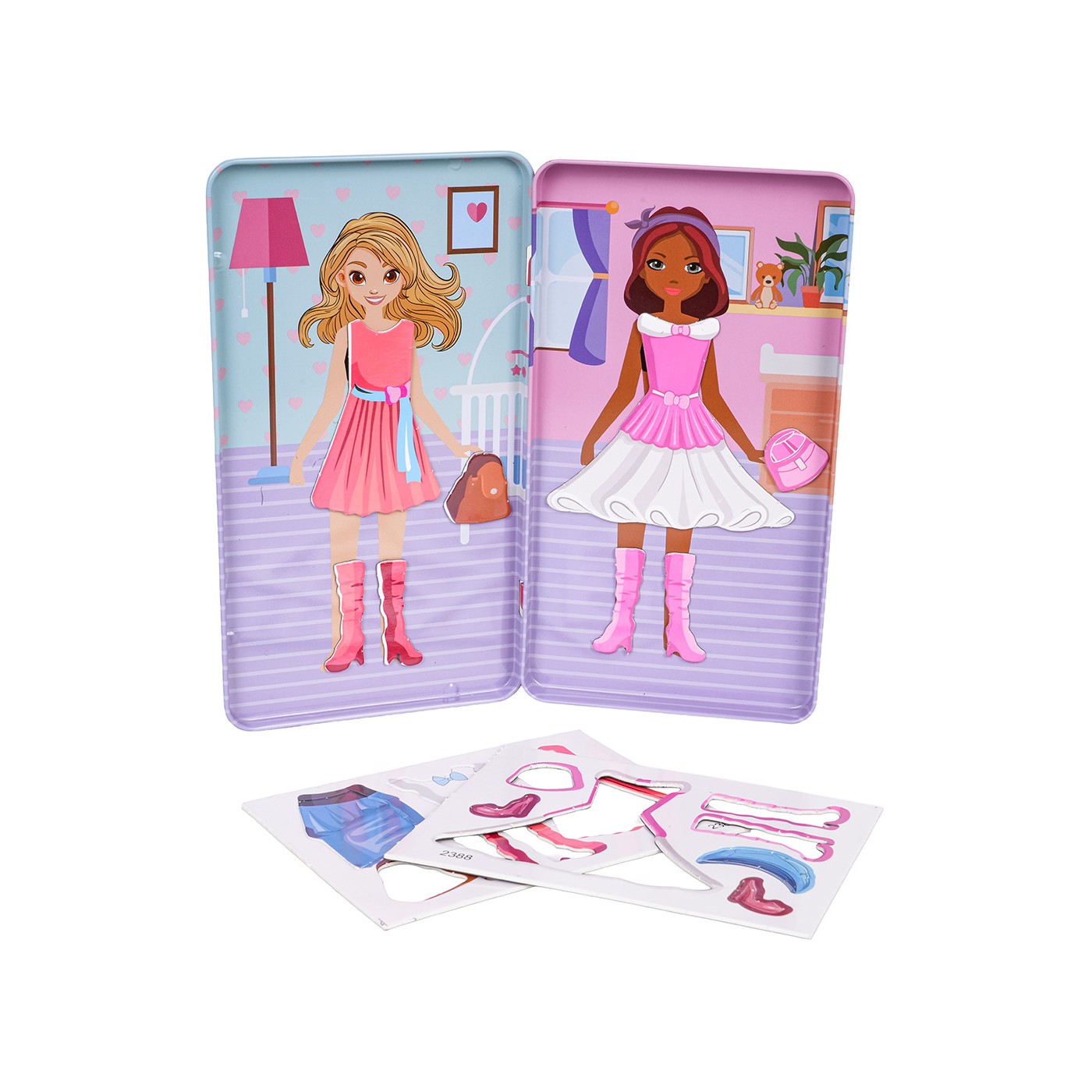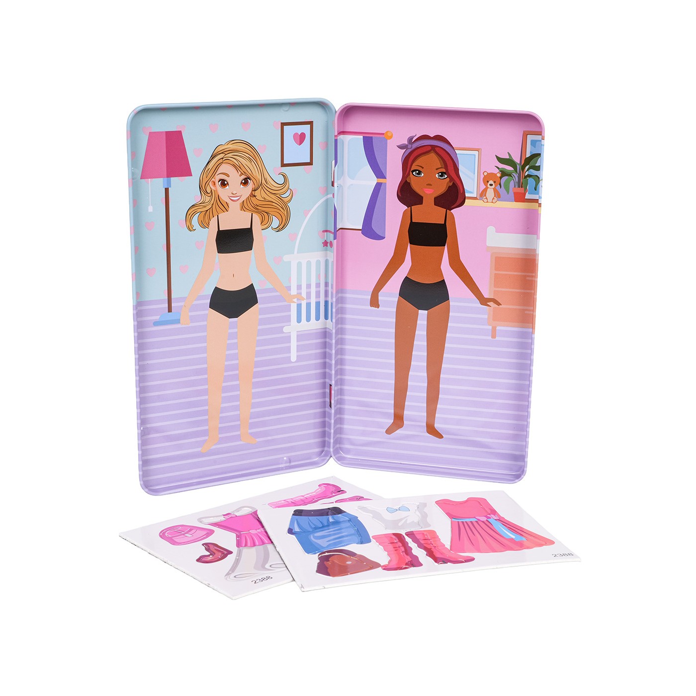 - a metal, colorful box with drawings of two models on the inside of the lid, - 13 magnetic wardrobe items. |