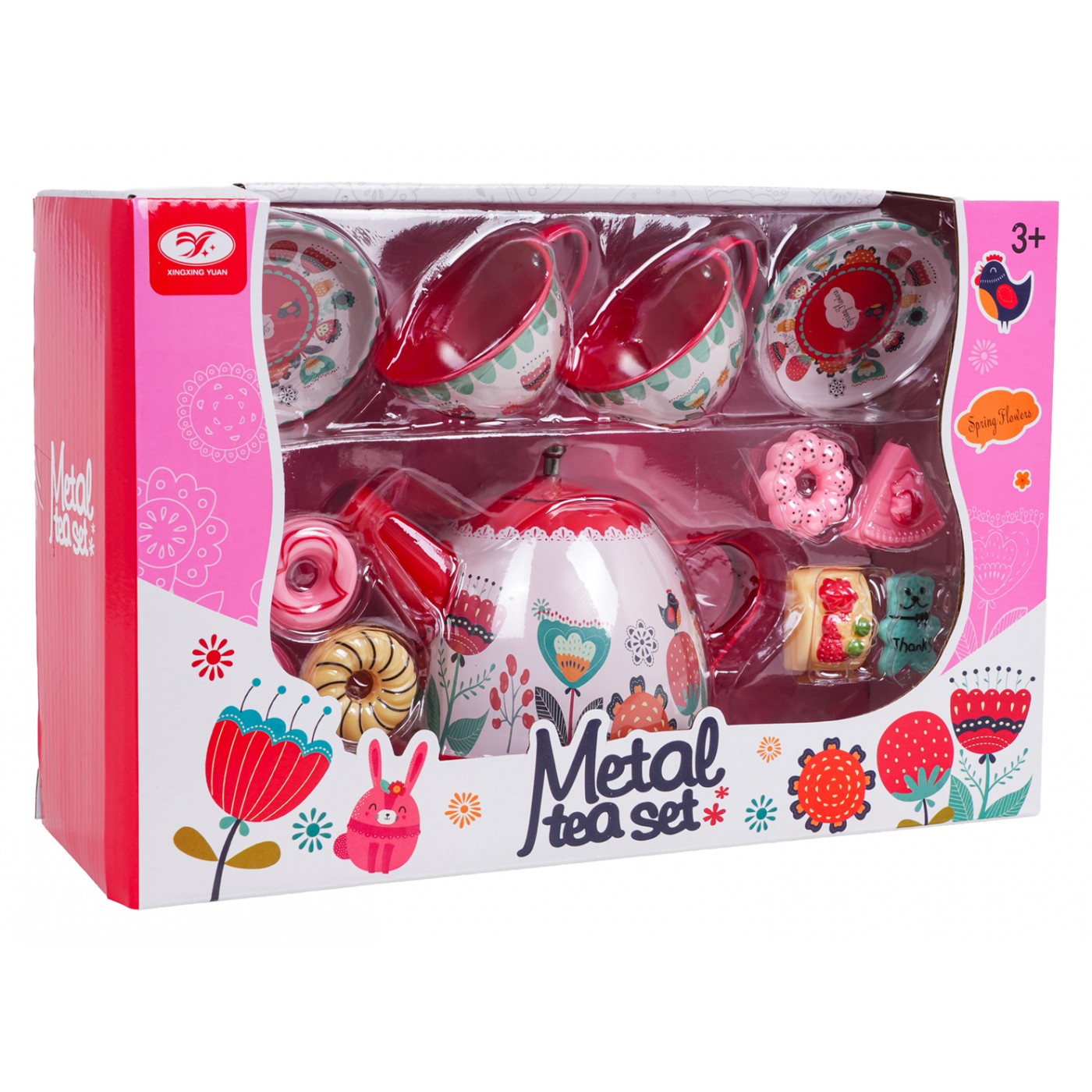 A colorful metal tea set for children over three years of age. The 14-piece set includes everything your little one needs to serve tea and cookies. The set includes a teapot, cups, saucers, and mock sweets. The set's components are made of metal and coated with safe, non-toxic paint in vibrant colors. Features: - a set for children from three years of age, - contains everything necessary to serve tea, - the richness of colors attracts the child's eye, - perfect gift set. |