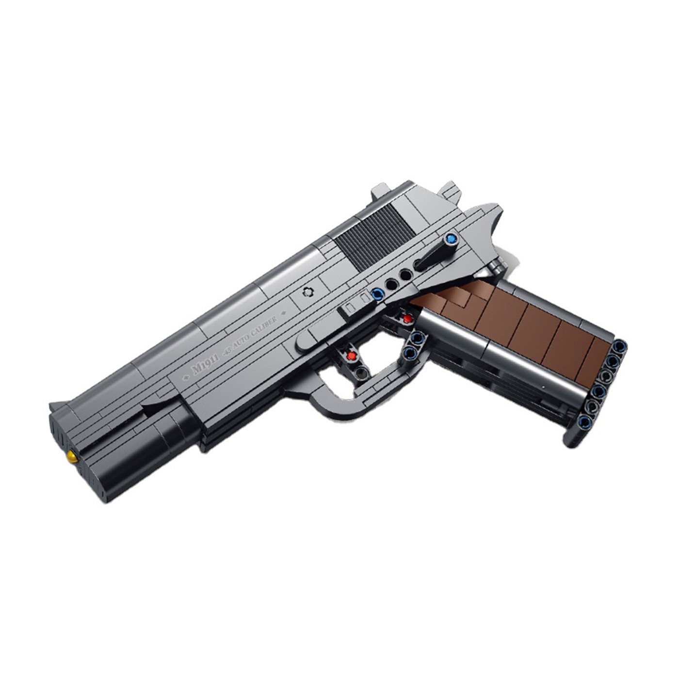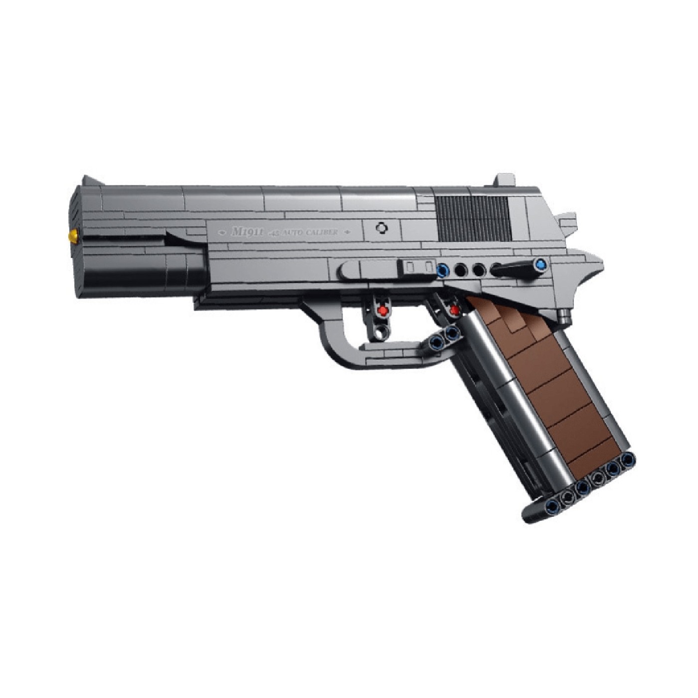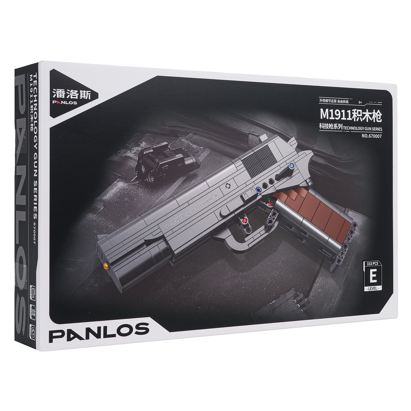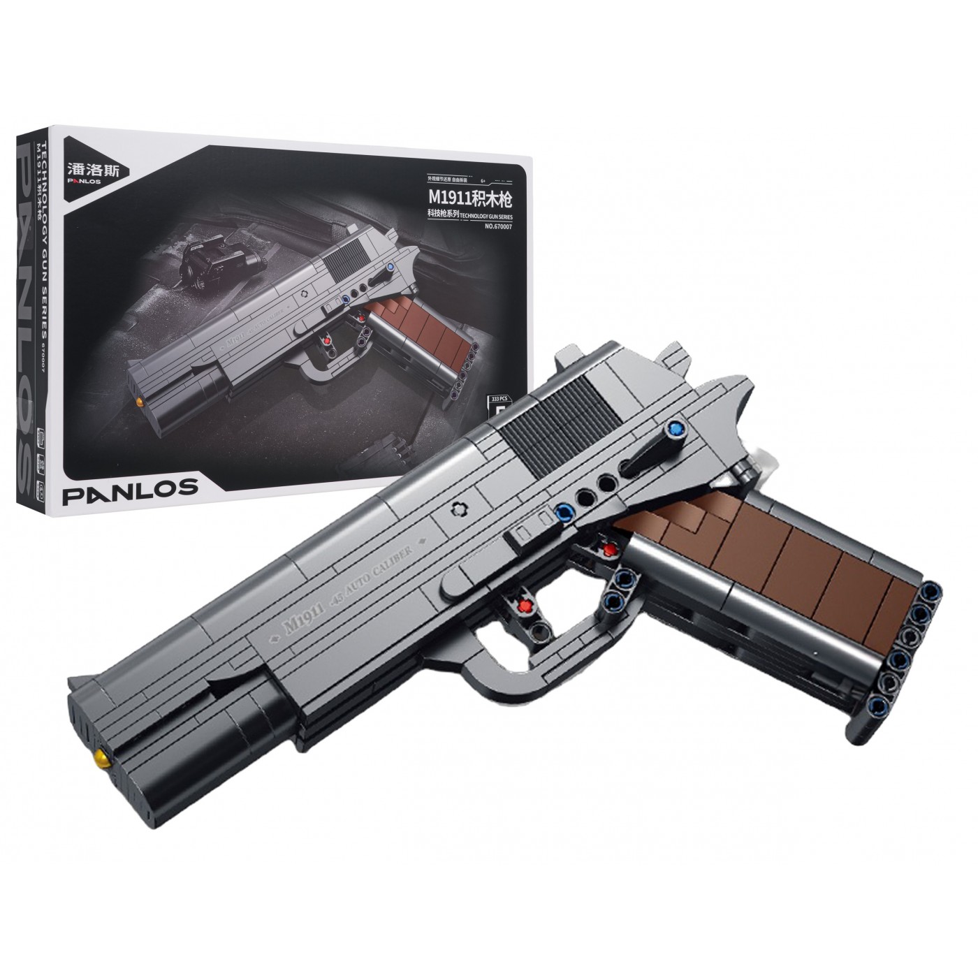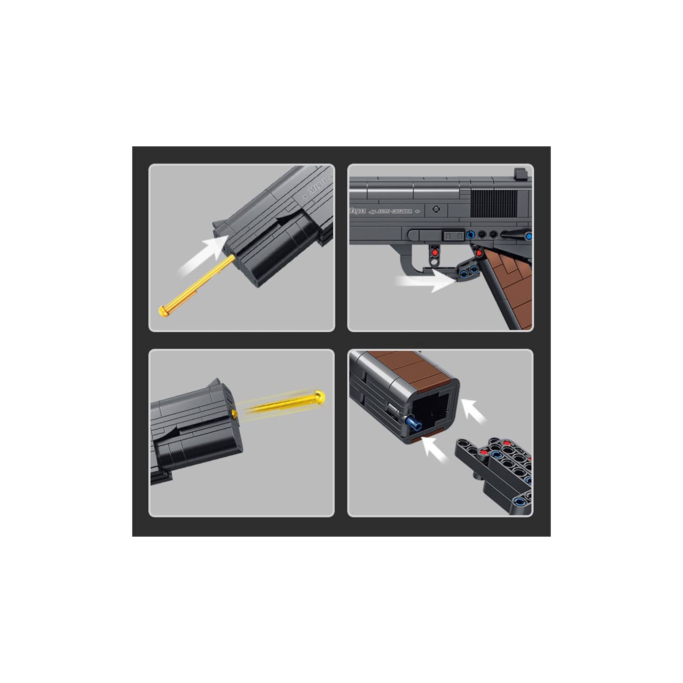 High-quality building blocks for children aged six and up. This set consists of 333 pieces that can be used to build a projectile-firing gun.