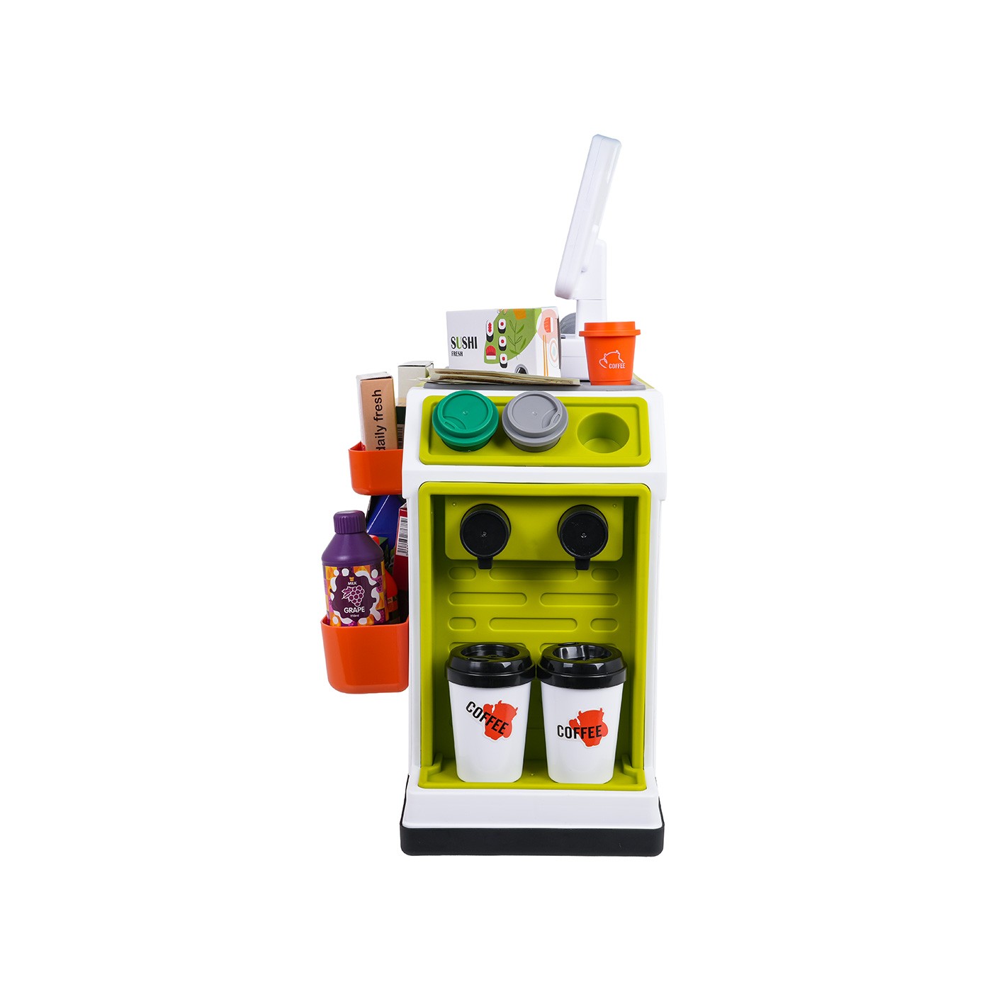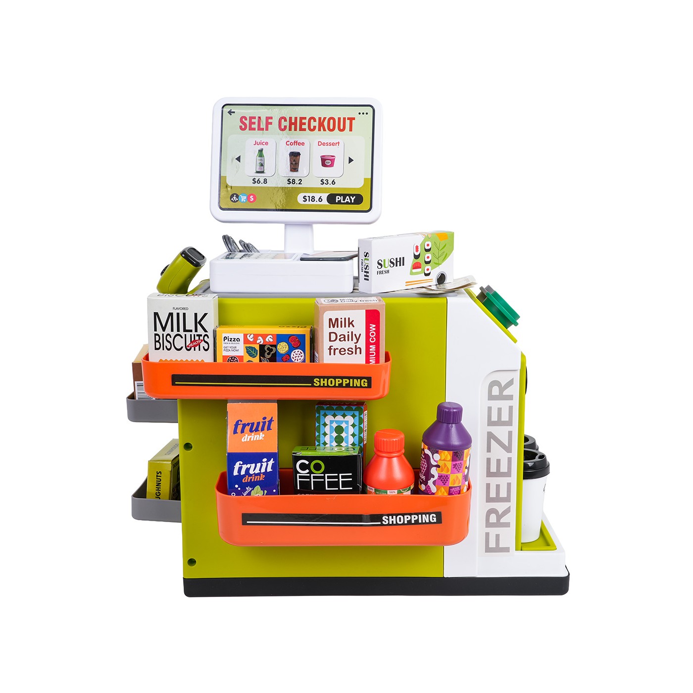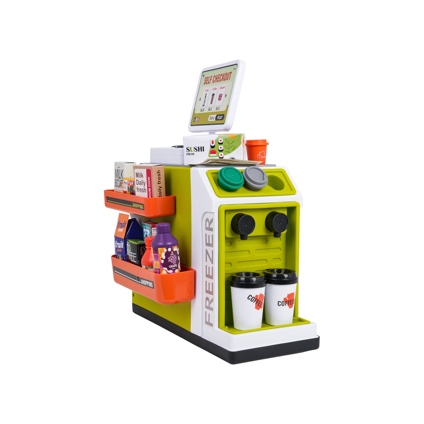 - structural elements of the supermarket, - scanner, - cash register, - payment card, - toy money, 15 banknotes and 6 coins. - dummy food products: grape juice in a bottle and carton and orange juice, 2 x ice cream containers, 2 x yogurt containers, 2 x roulade, plum juice, 3 x coffee capsules, sushi, cookies, pizza, and other cartons with dummy food products, - 2 x coffee mug. |