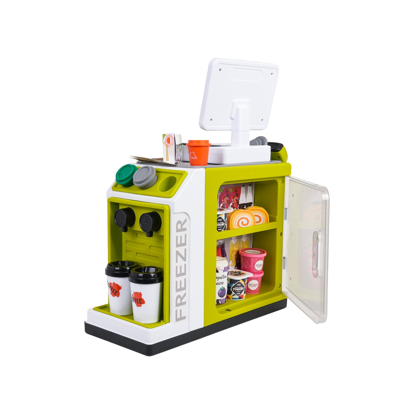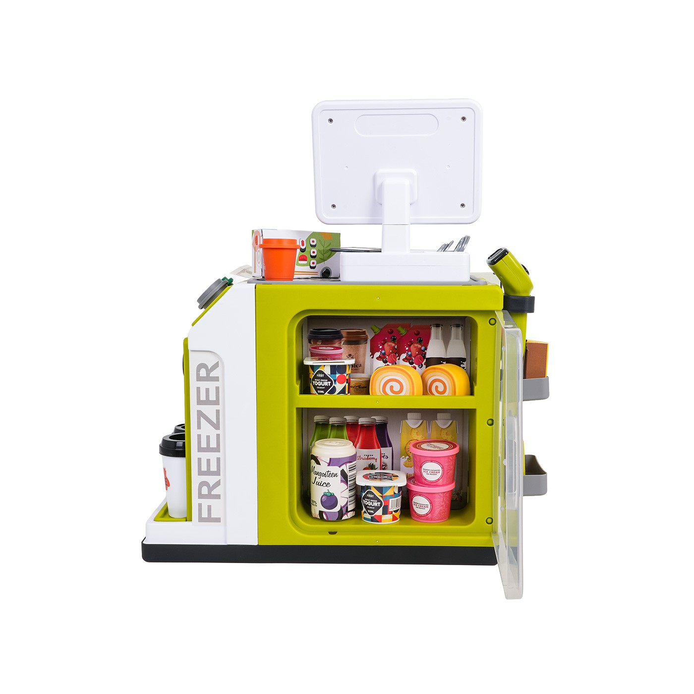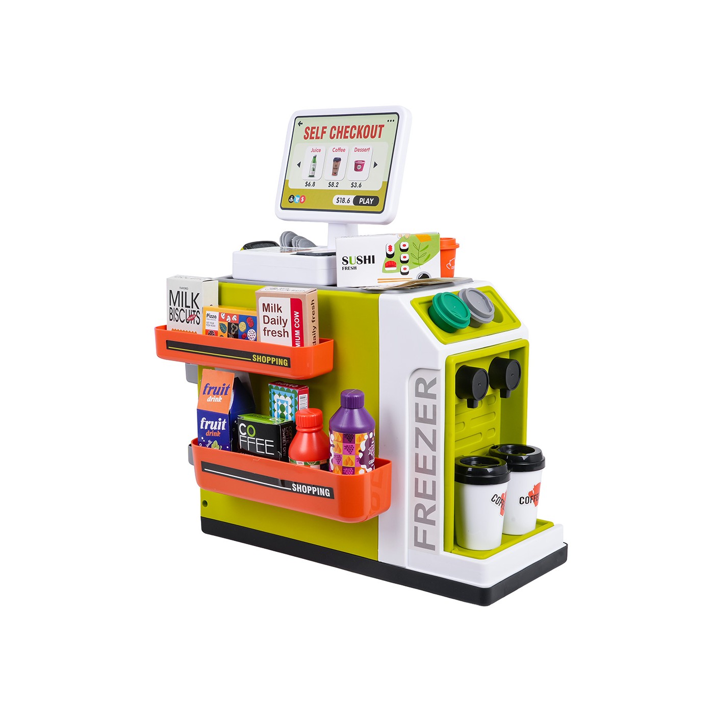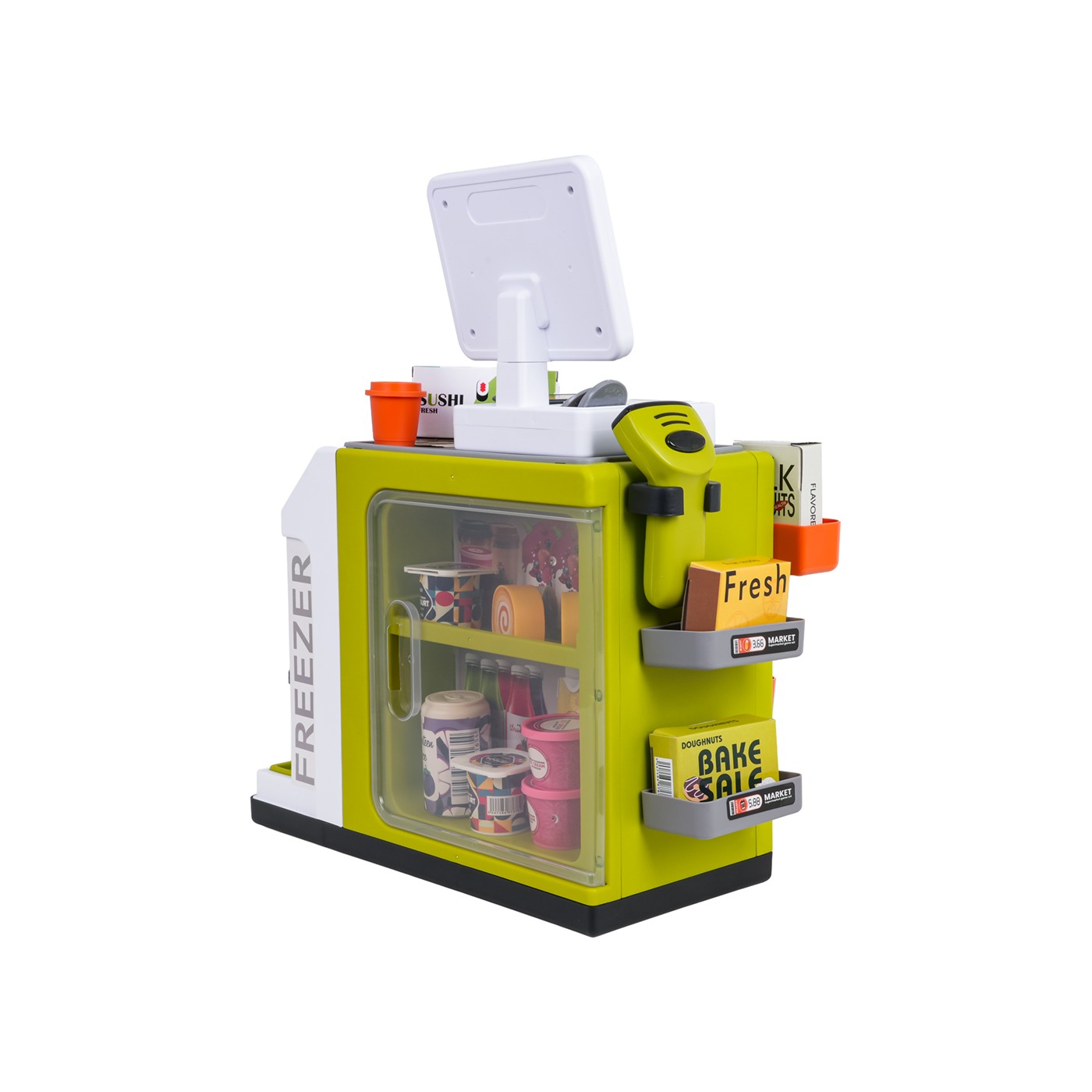 - structural elements of the supermarket, - scanner, - cash register, - payment card, - toy money, 15 banknotes and 6 coins. - dummy food products: grape juice in a bottle and carton and orange juice, 2 x ice cream containers, 2 x yogurt containers, 2 x roulade, plum juice, 3 x coffee capsules, sushi, cookies, pizza, and other cartons with dummy food products, - 2 x coffee mug. |